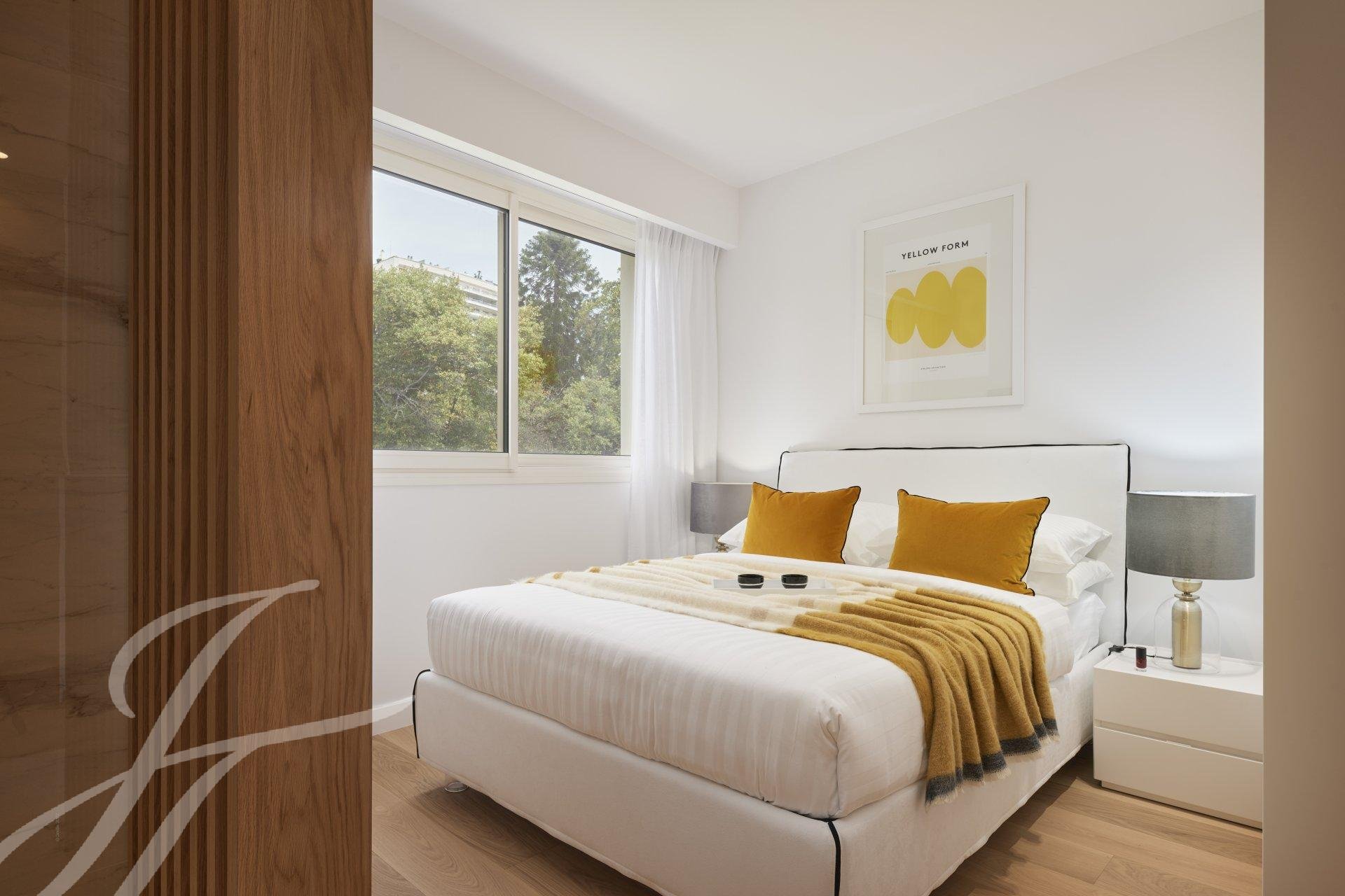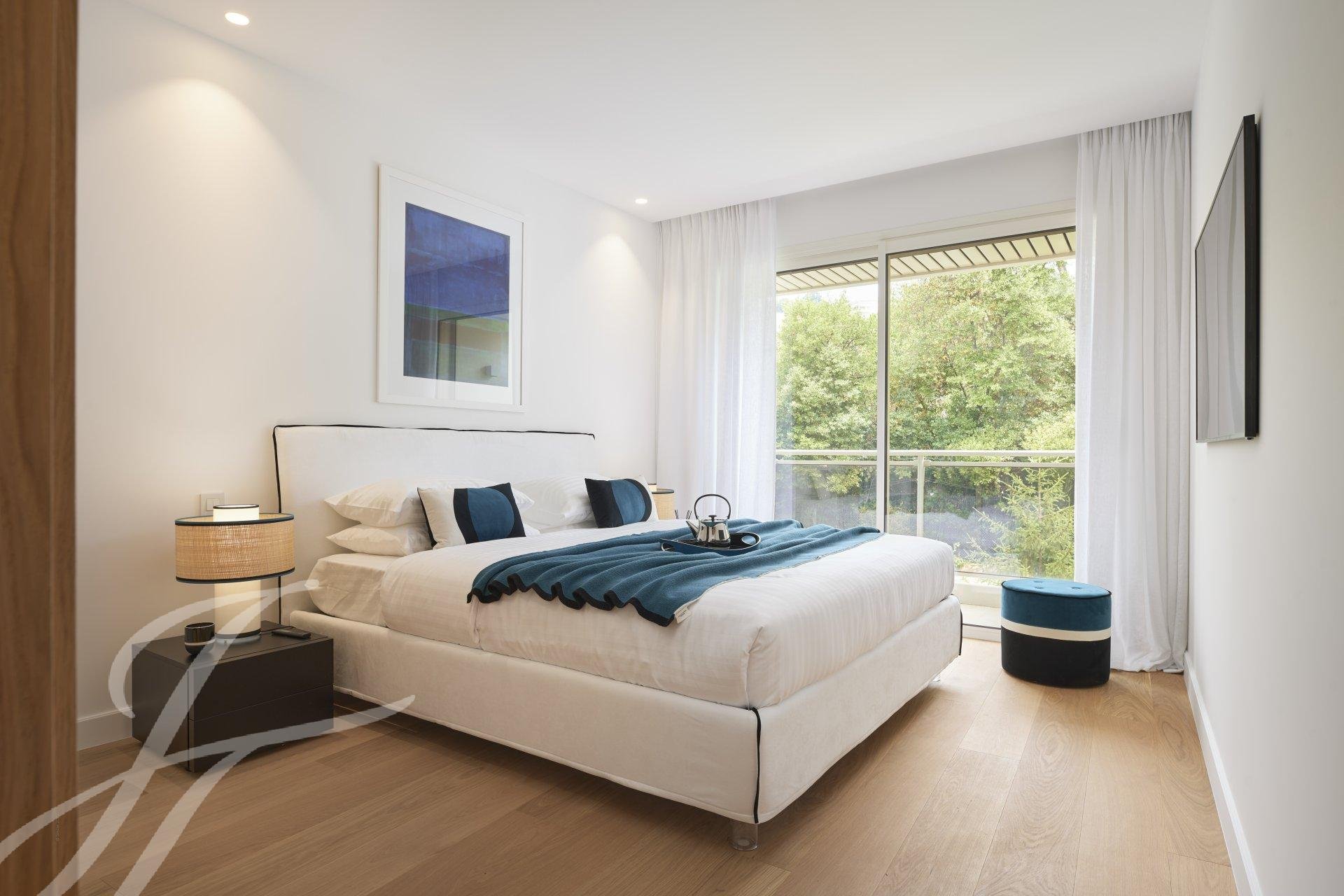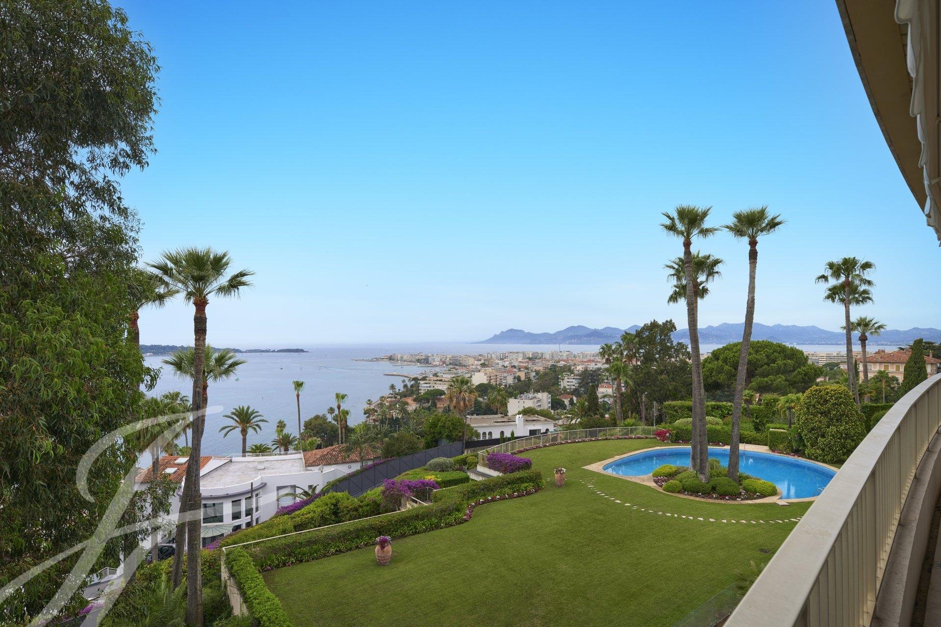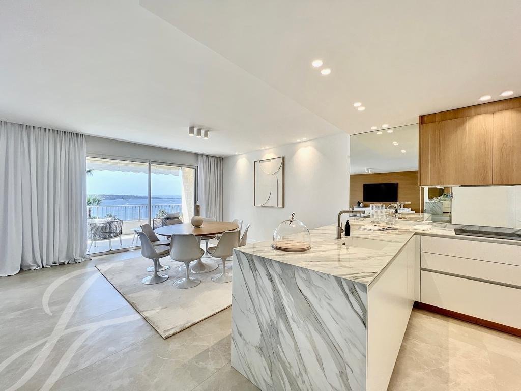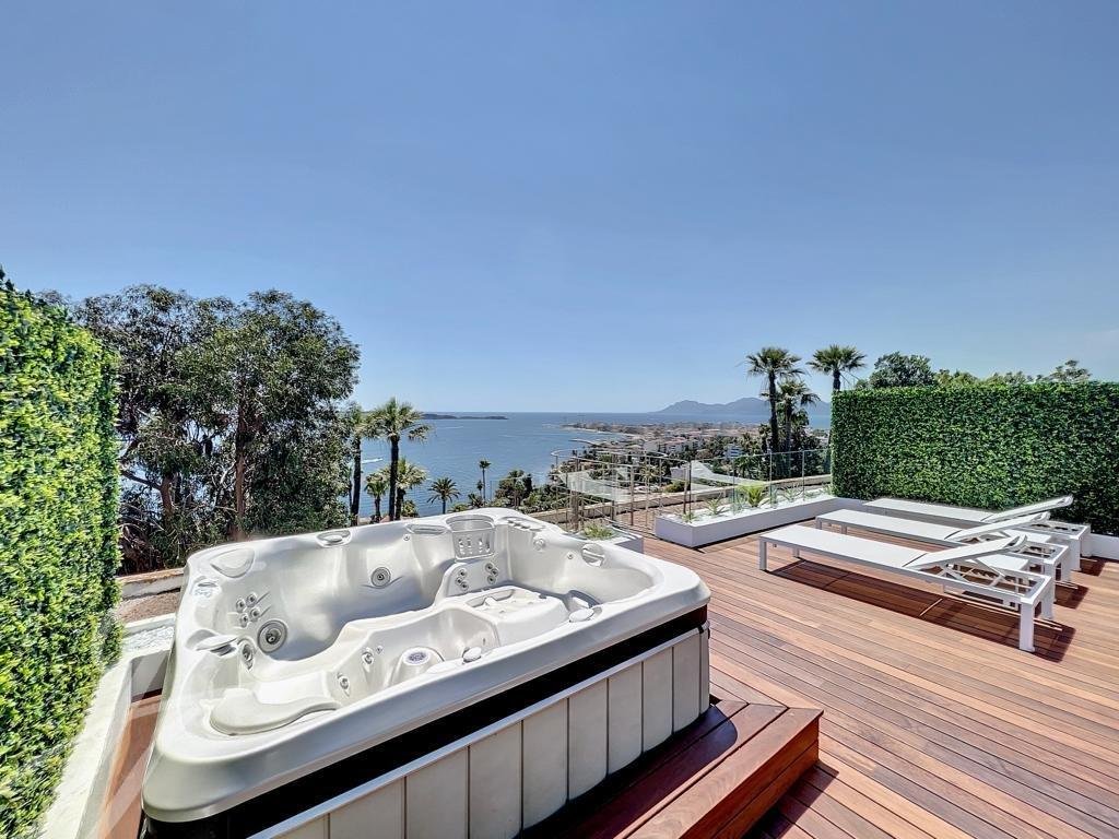 Tento byt v nejvyšším patře luxusní rezidence o rozloze 144 m² nabízí jedinečný panoramatický výhled na moře a Canneský záliv.