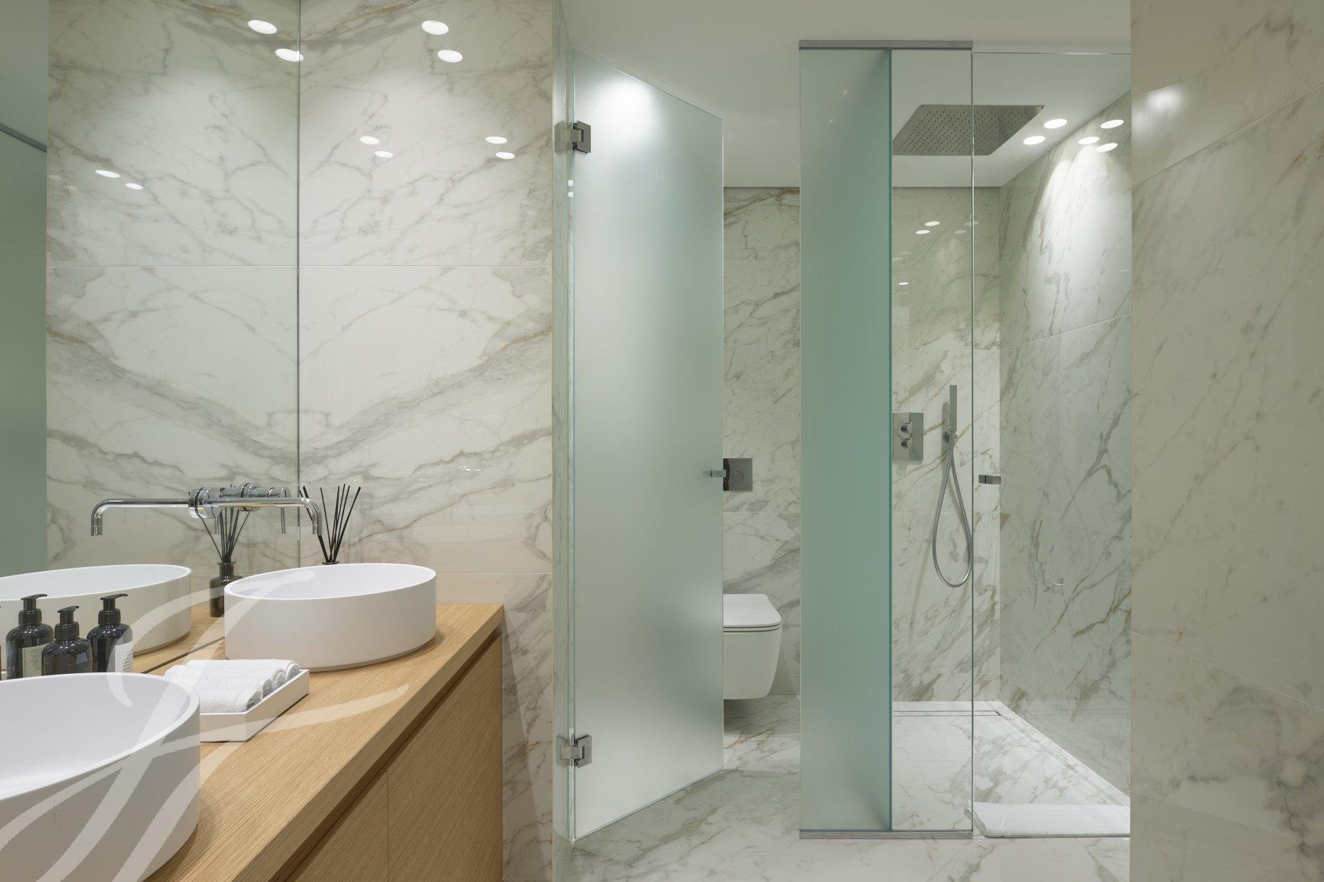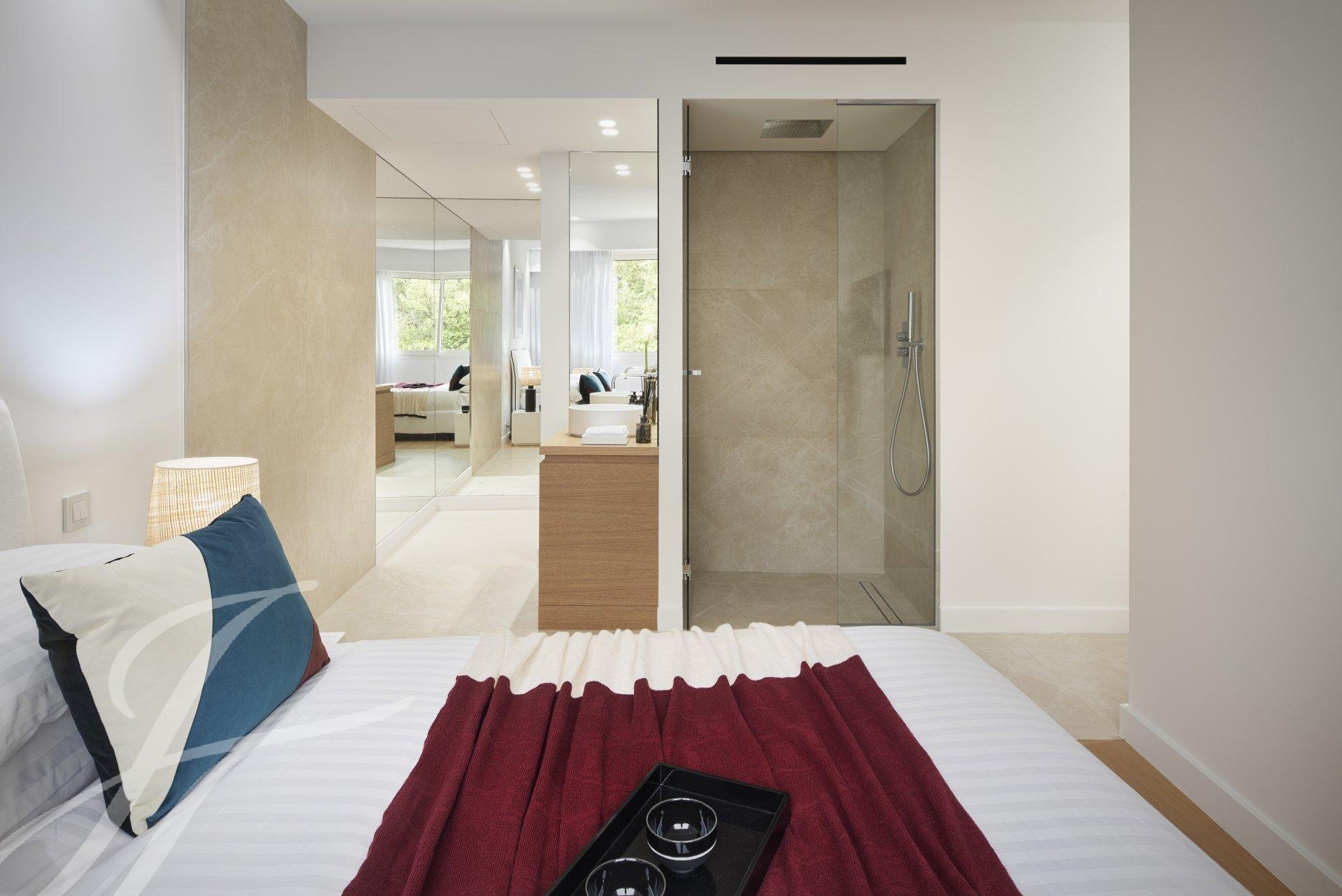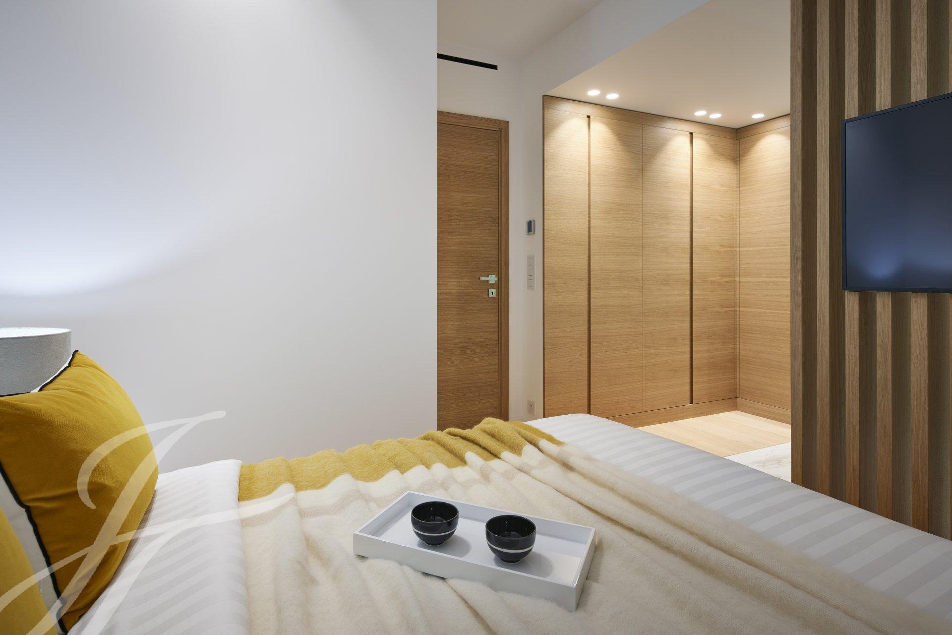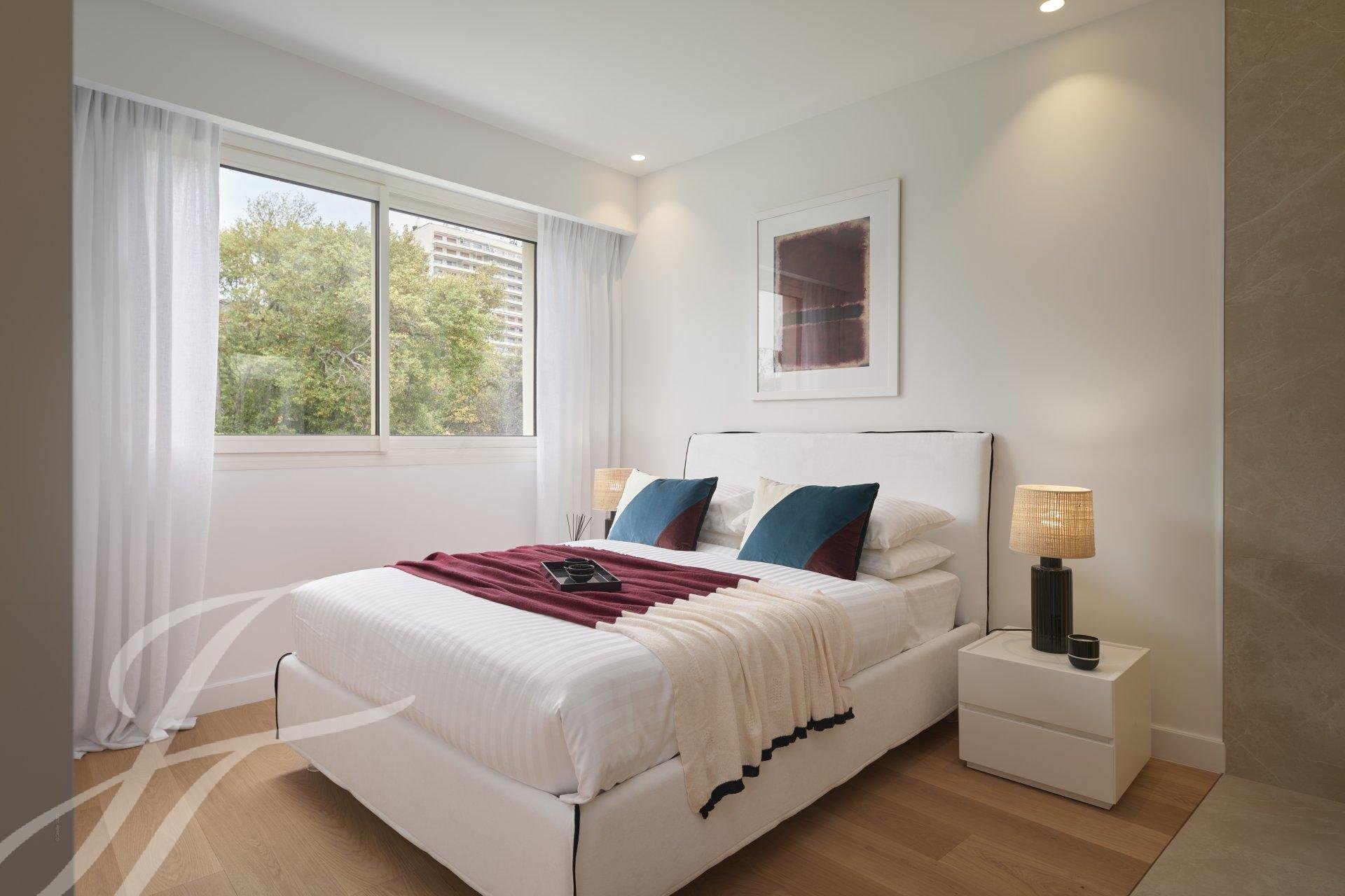 Tento byt v nejvyšším patře luxusní rezidence o rozloze 144 m² nabízí jedinečný panoramatický výhled na moře a Canneský záliv.