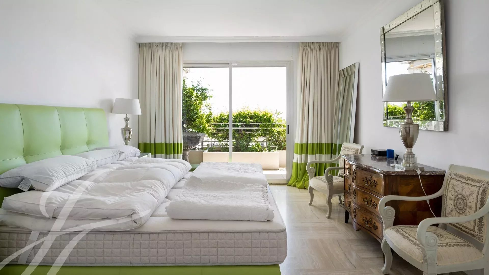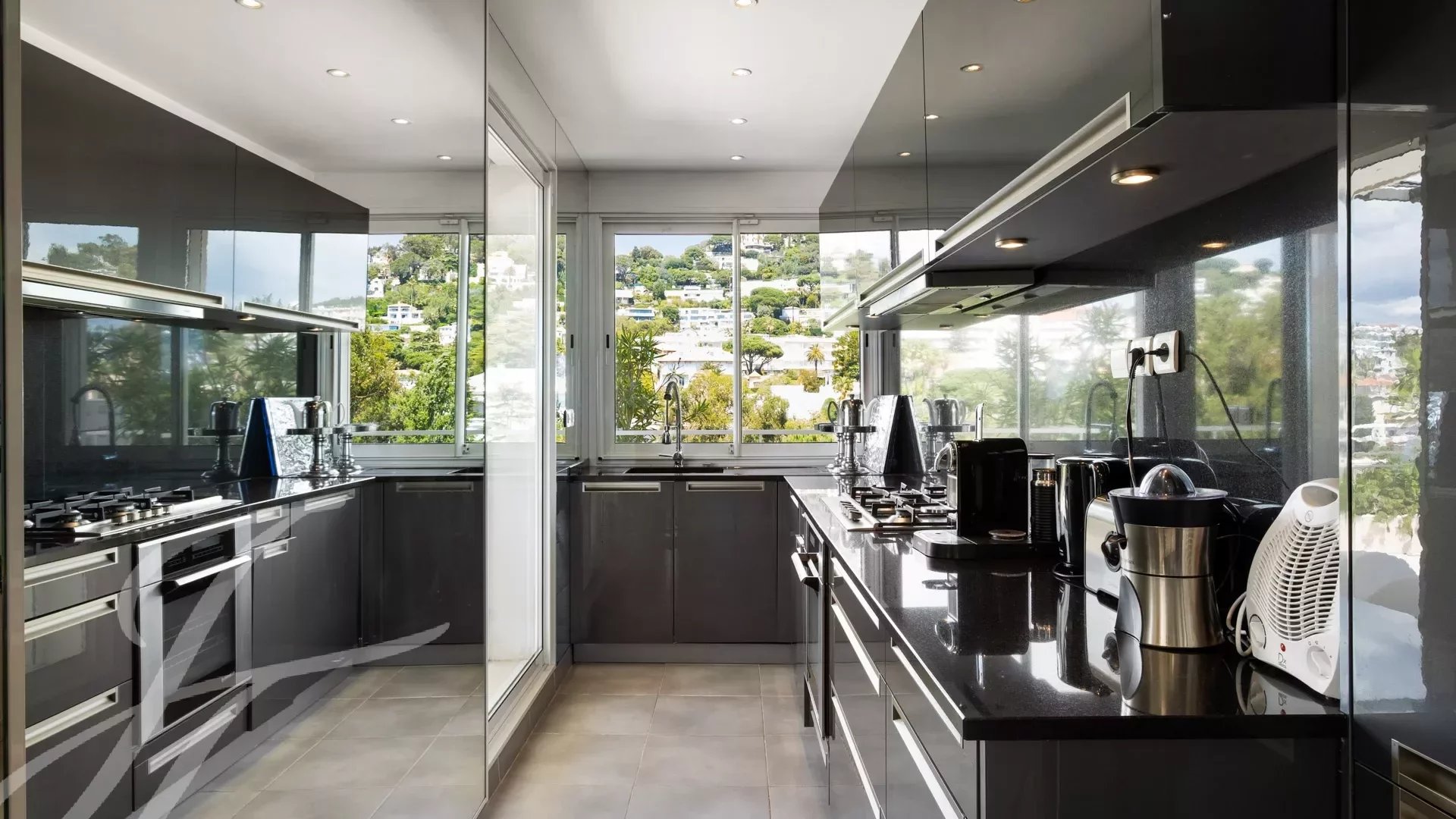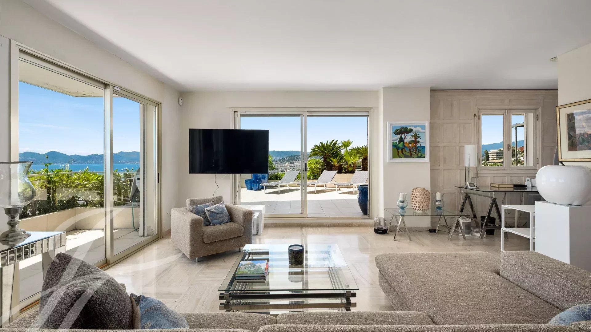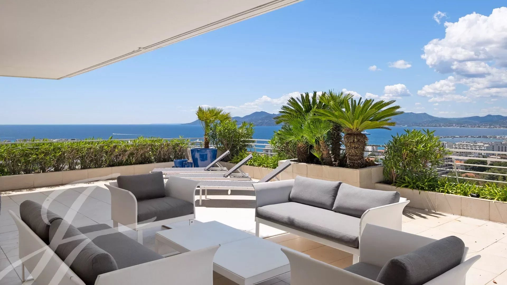 Tento nádherný rohový byt v luxusní rezidenci v Basse Californie má velkou terasu s nepřetržitým výhledem na moře, ostrovy Lérins, Canneský záliv a pohoří Esterel.