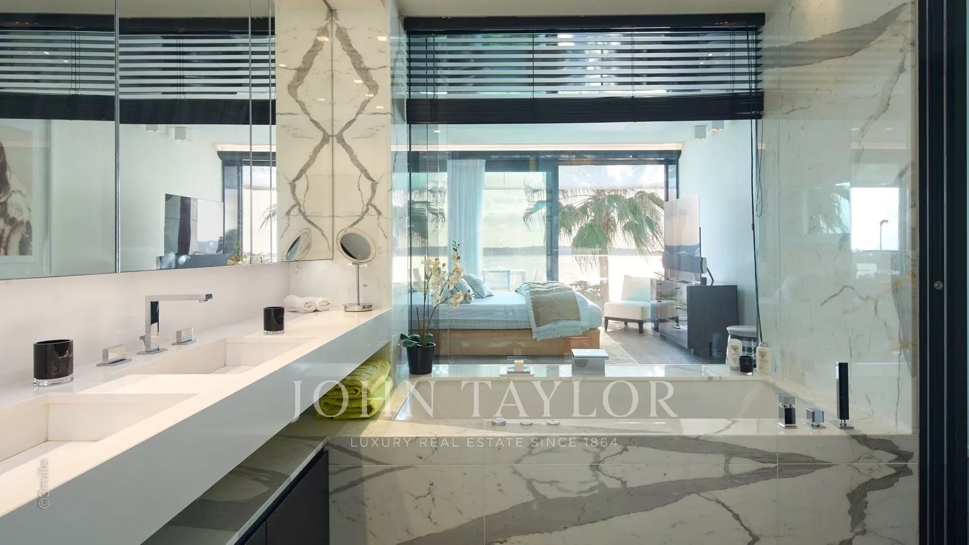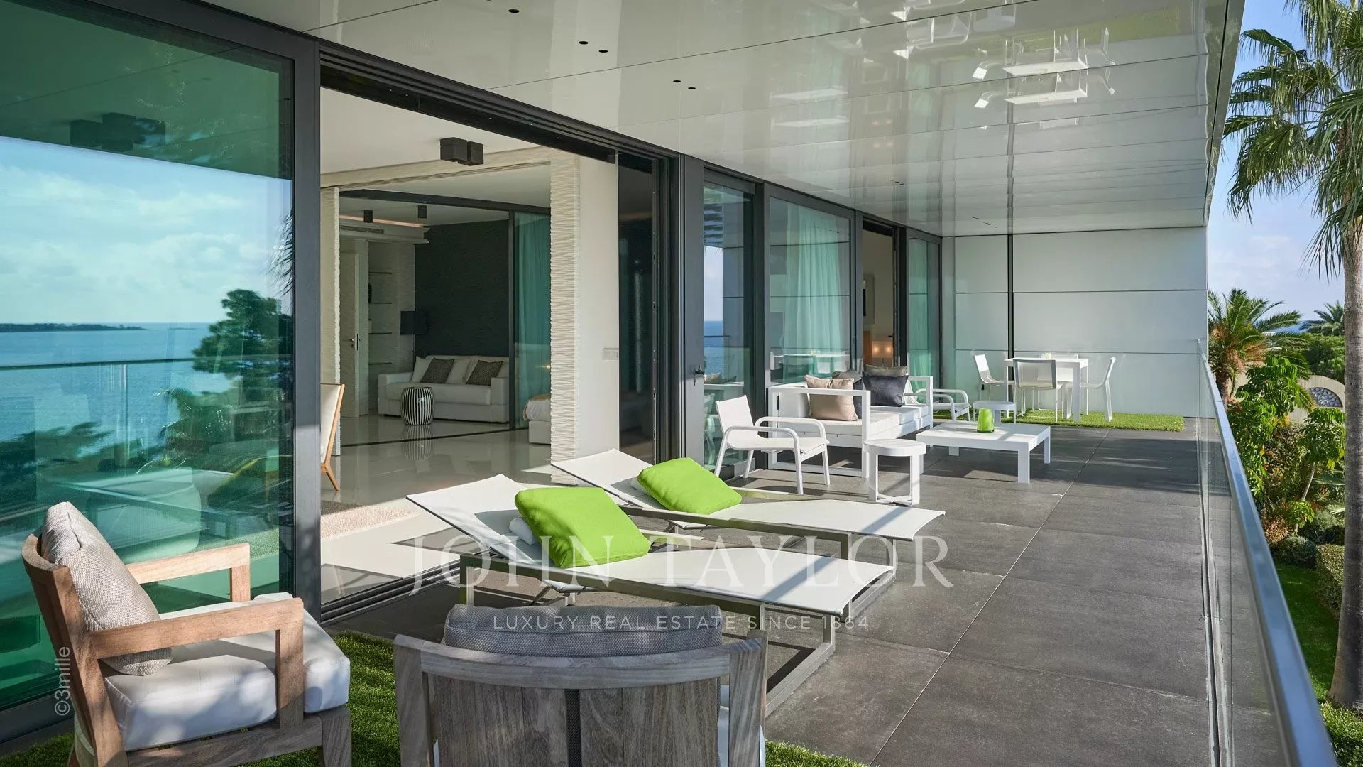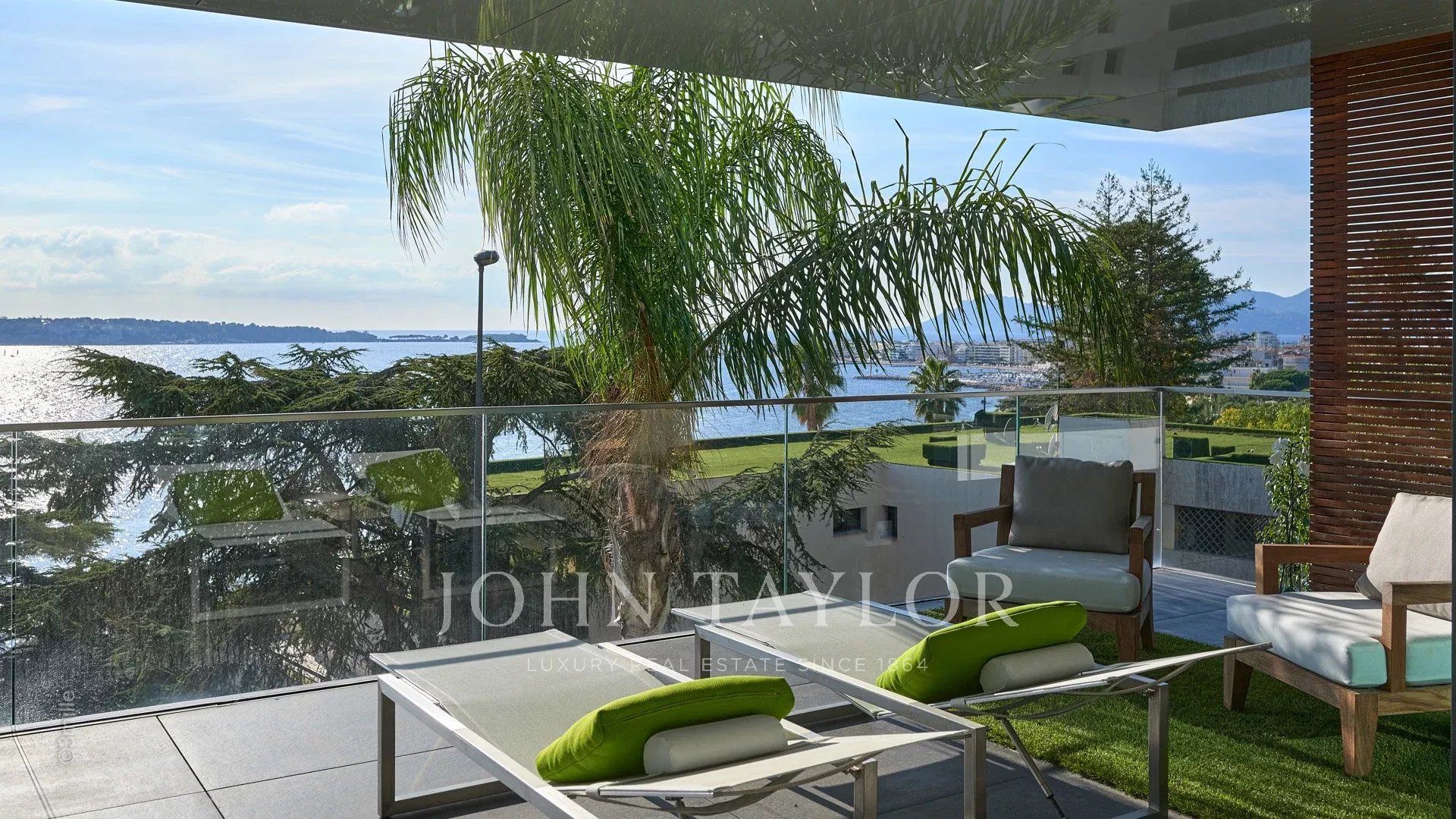 Tento nádherný byt o rozloze 144 m² v nové luxusní rezidenci má velkou a hlubokou terasu o rozloze 54 m². Je orientovaná na jih a nabízí panoramatický výhled na moře a ostrovy Lérins.
