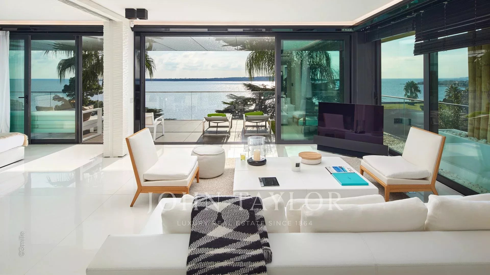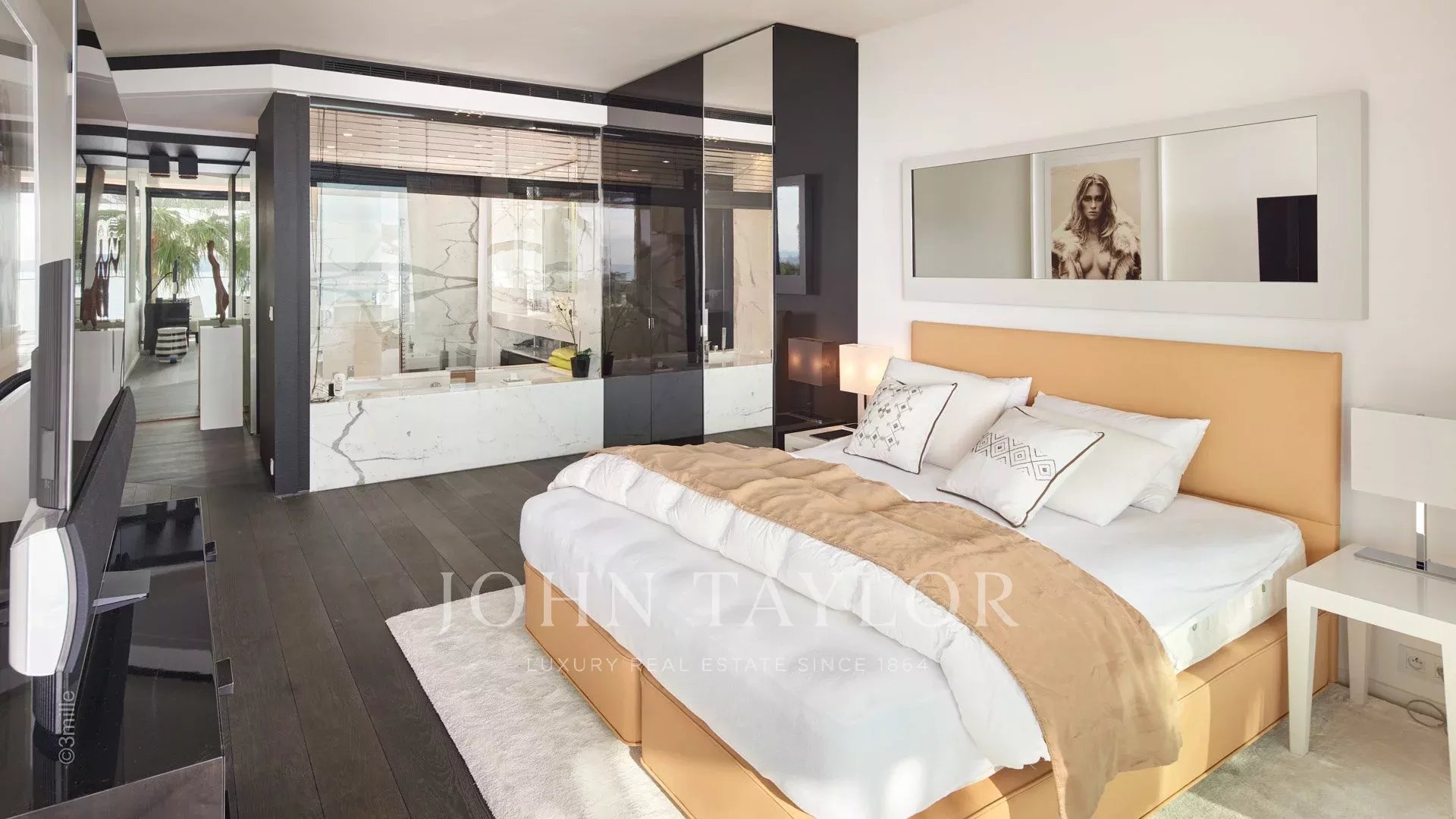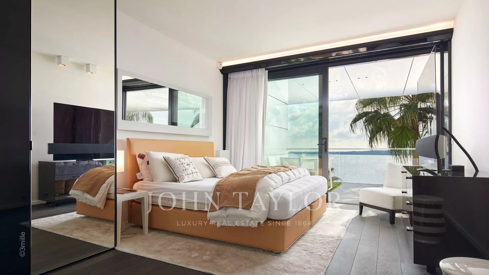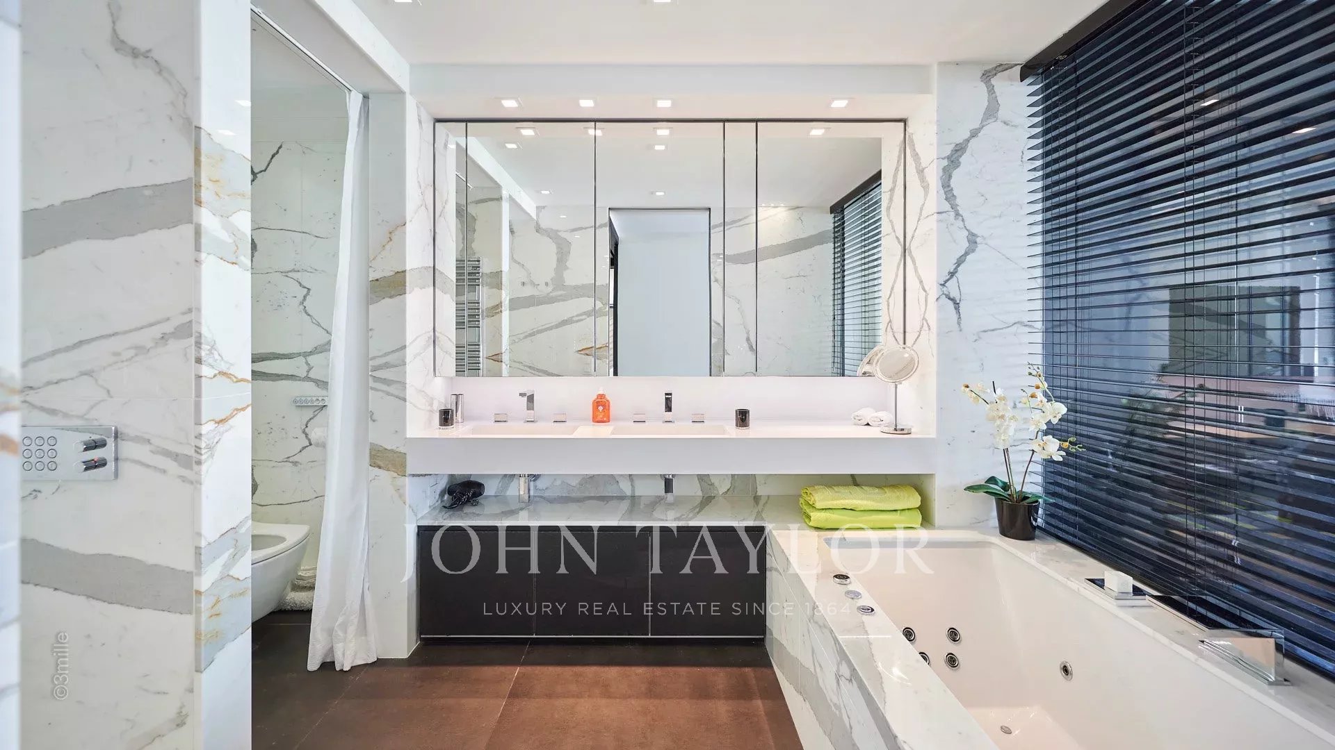 Tento nádherný byt o rozloze 144 m² v nové luxusní rezidenci má velkou a hlubokou terasu o rozloze 54 m². Je orientovaná na jih a nabízí panoramatický výhled na moře a ostrovy Lérins.
