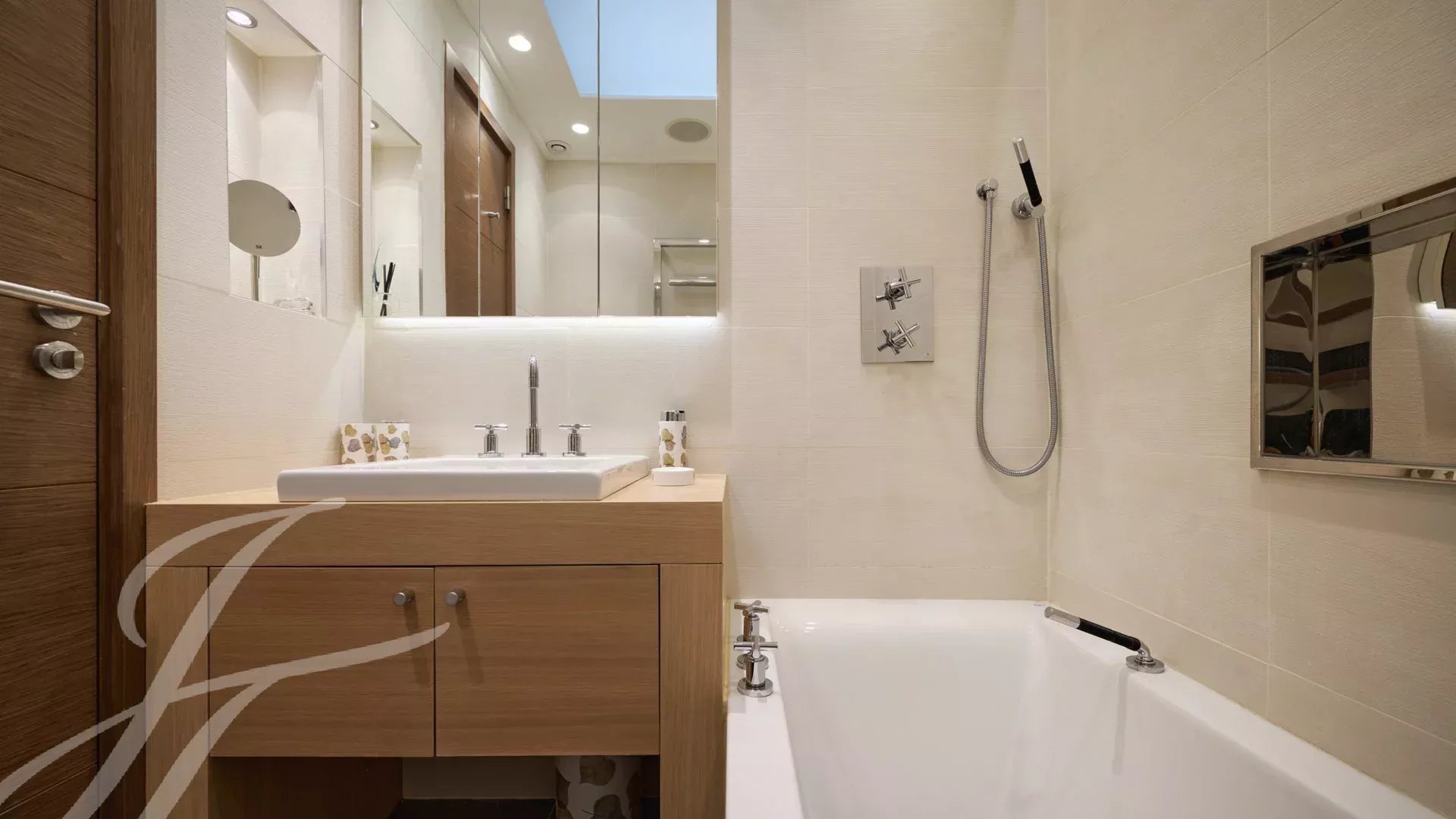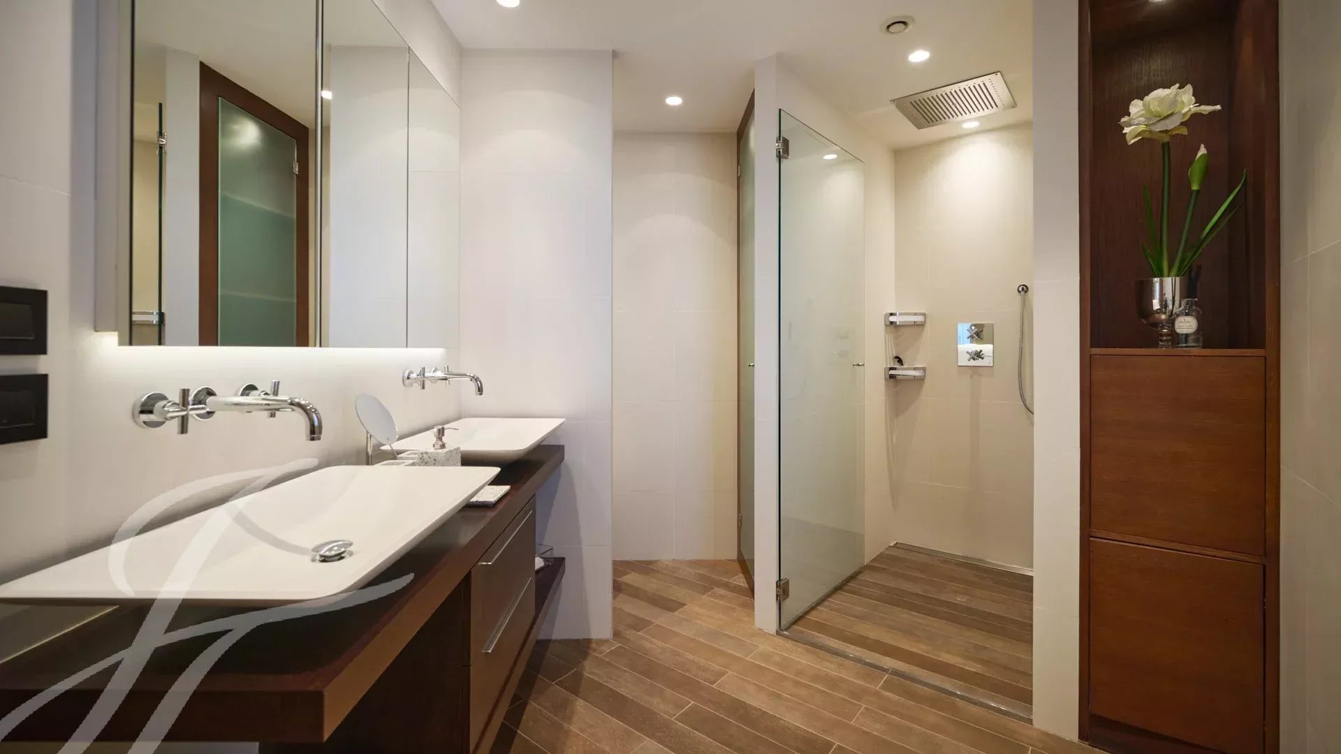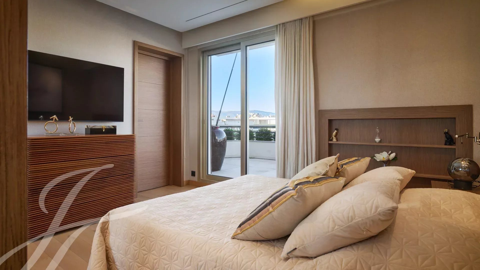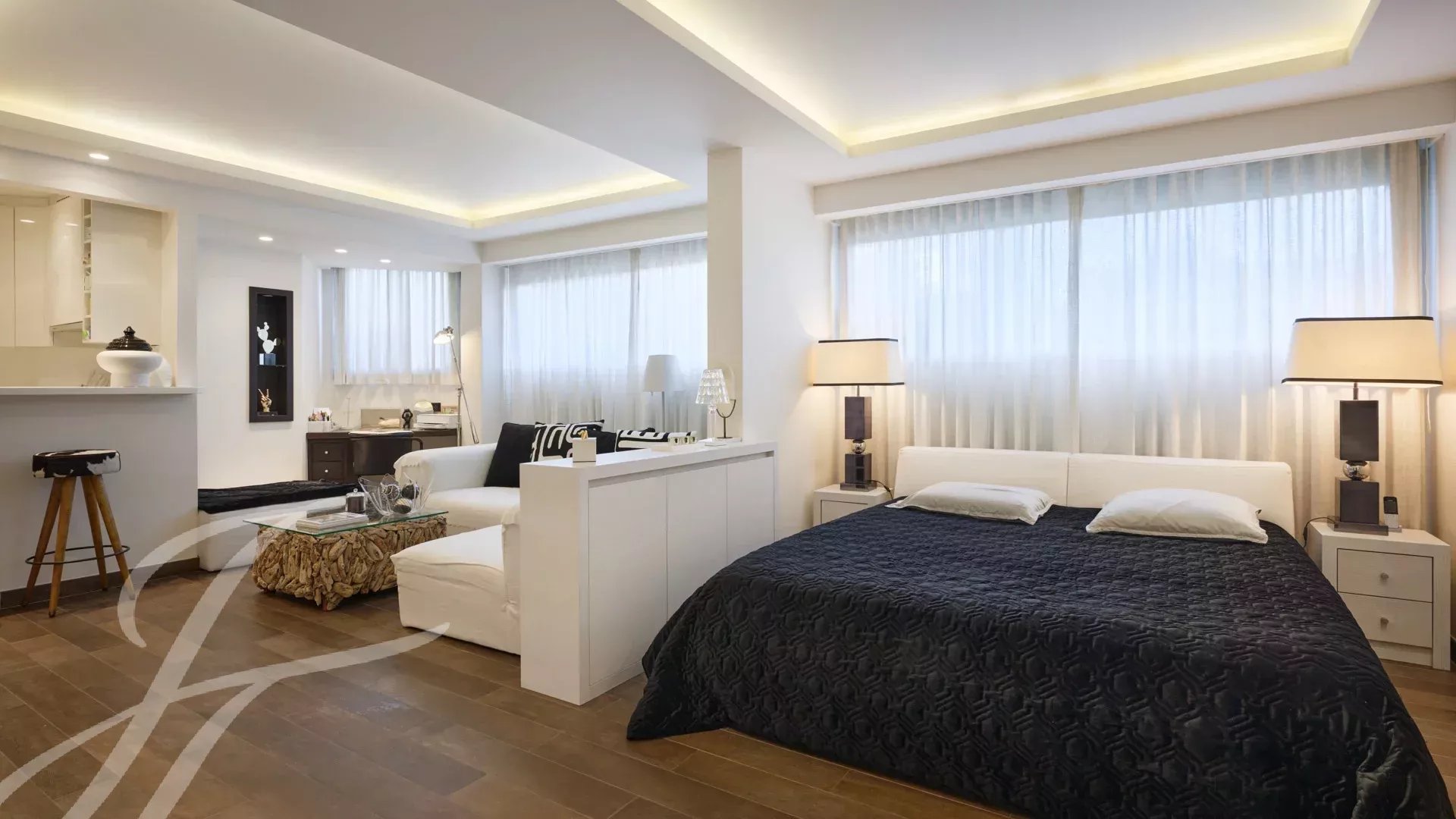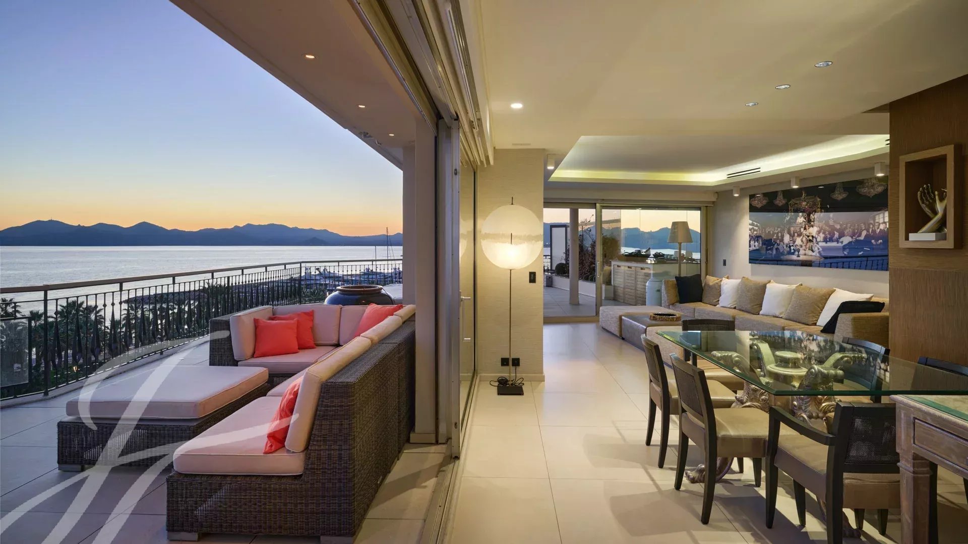 Skládá se z rozlehlého obývacího pokoje s jídelnou, barem a dvěma vinnými sklípky, ze kterého se vychází na velkolepou terasu o rozloze 156 m² s úchvatným výhledem na Port Canto, Palm Beach, Canneský záliv a Lérinské ostrovy. Z plně vybavené uzavřené kuchyně je přístup na druhou terasu. Byt má čtyři ložnice, včetně hlavní ložnice s vlastní koupelnou a sprchovým koutem a přístupem na terasu s výhledem na moře. Další ložnice s vlastní koupelnou se sprchou a dvě další ložnice se společnou sprchou.