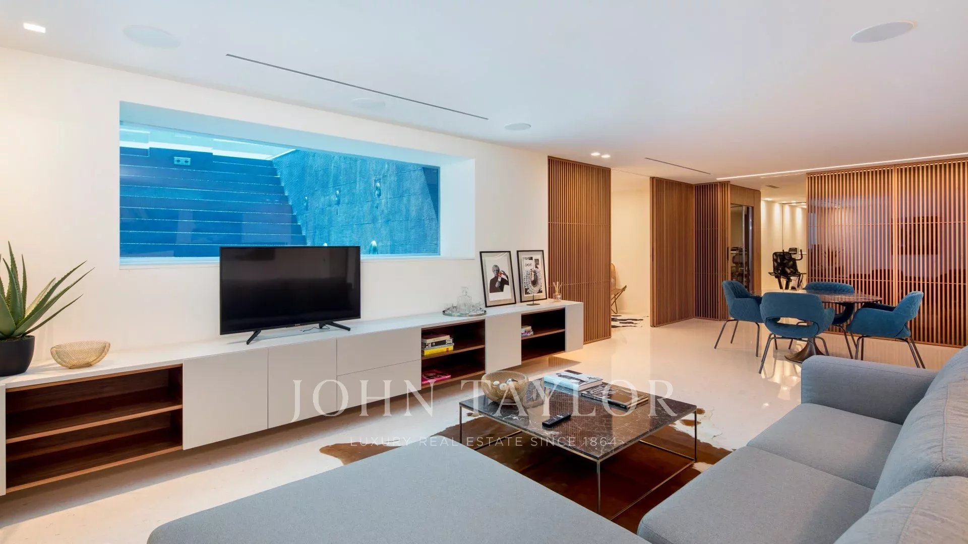 Vila má výtah, všeobecnou klimatizaci a vyhřívaný bazén s průhlednou stranou viditelnou zevnitř rezidence.