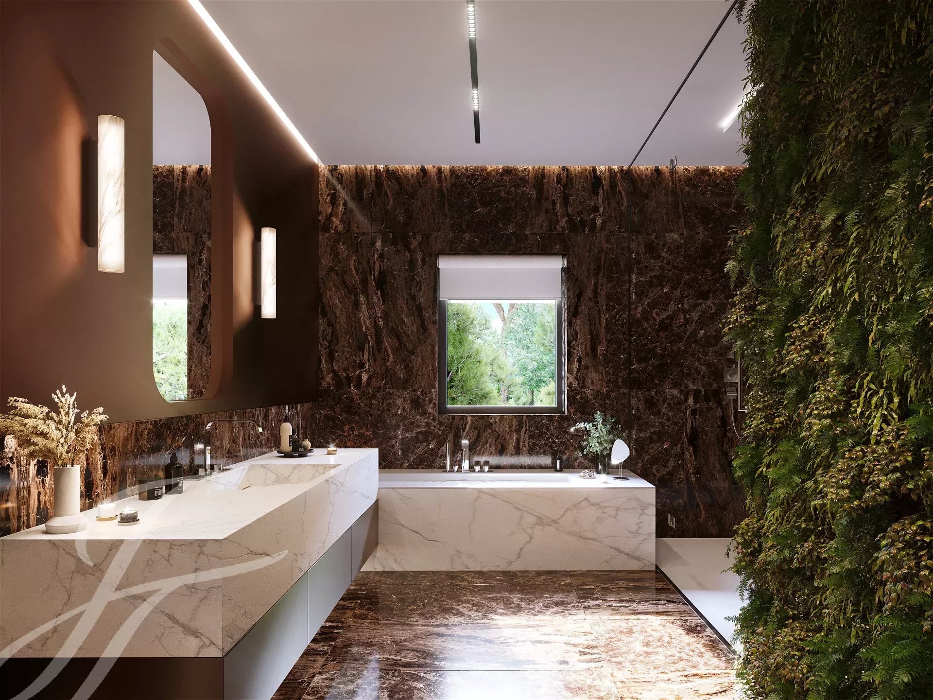 Wellness úroveň (cca 336 m²) zahrnuje posilovnu, vyhřívaný krytý bazén (8 x 4 m), masážní místnost, relaxační a meditační prostor, šatnu + WC, kino s barem, dvě ložnice s vlastním sprchovým koutem/WC.