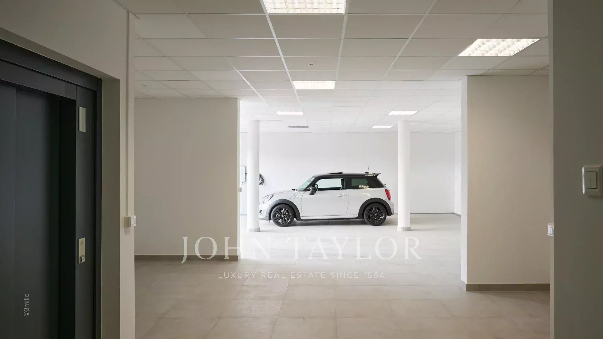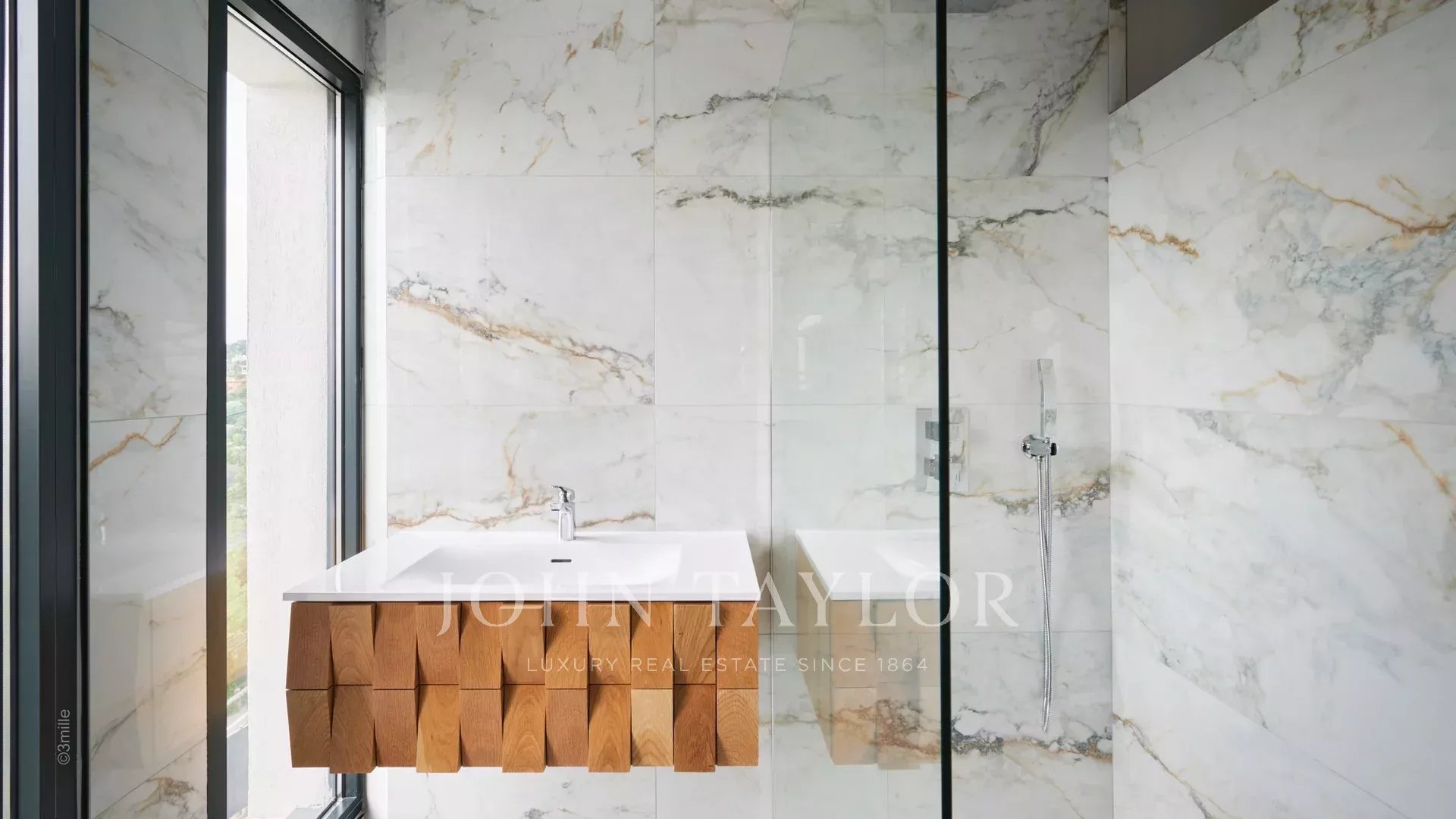 - Na úrovni zahrady: majestátní, prosvětlený obývací pokoj s 5 m vysokými stropy, ze kterého se vychází na velkou terasu a vyhřívaný nekonečný bazén (11 m x 5 m),