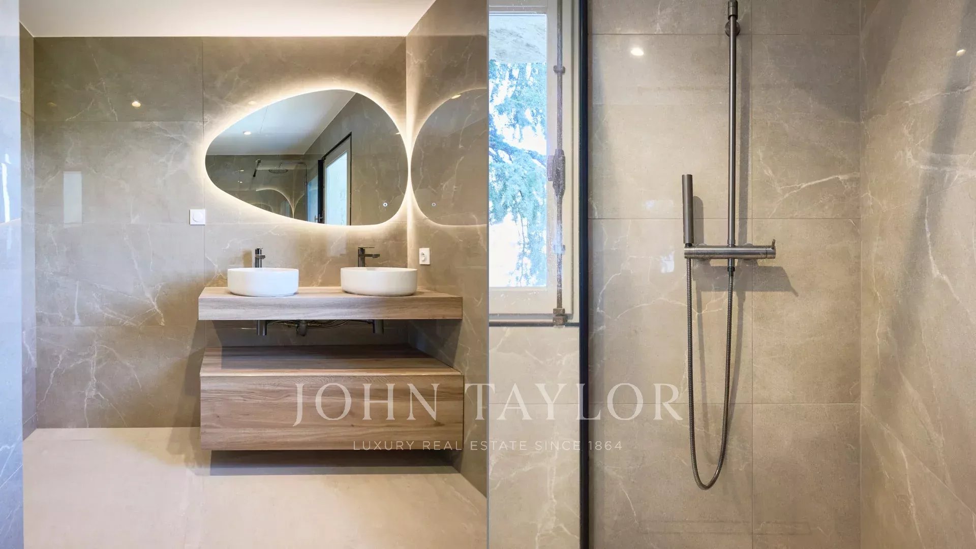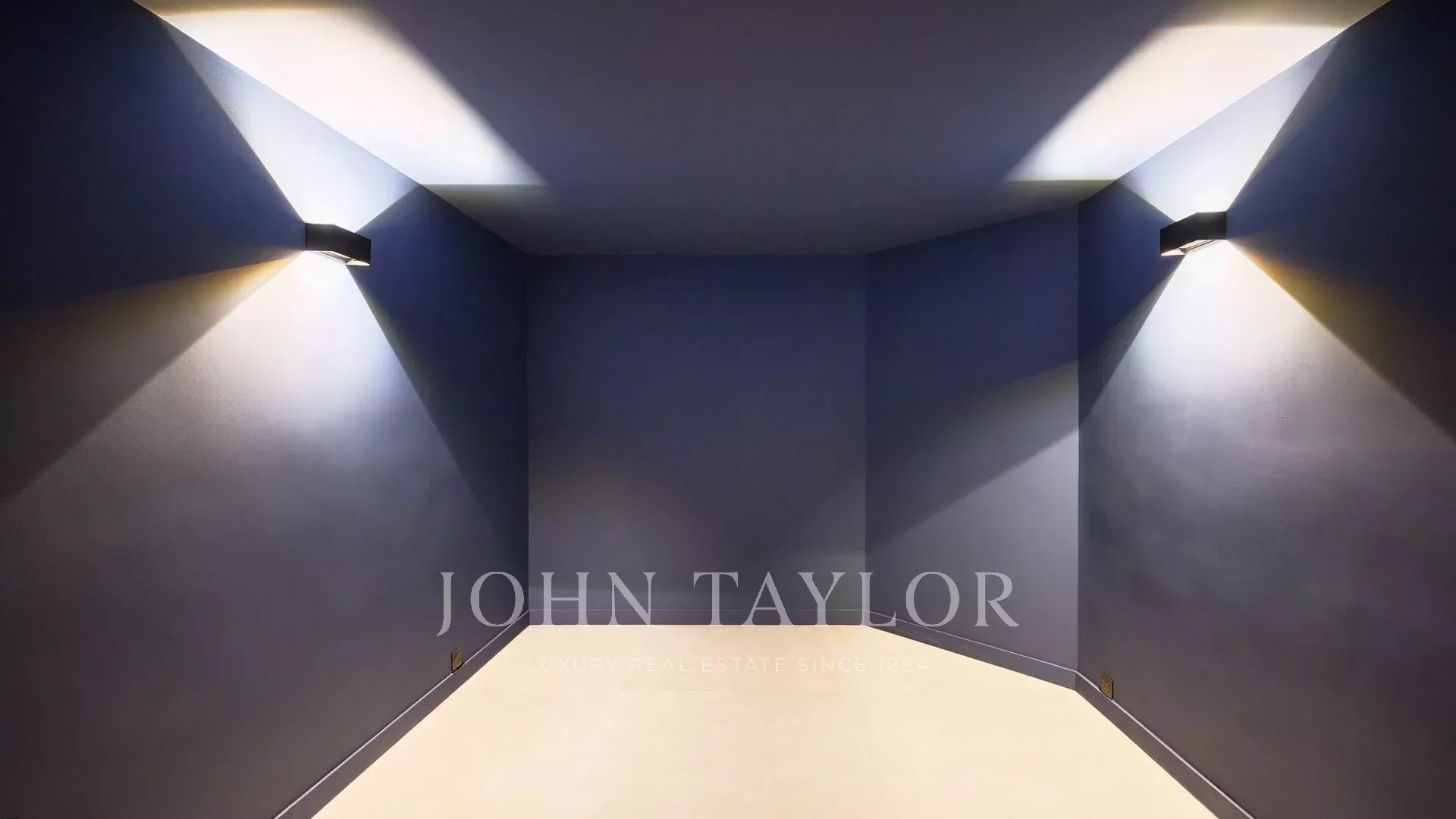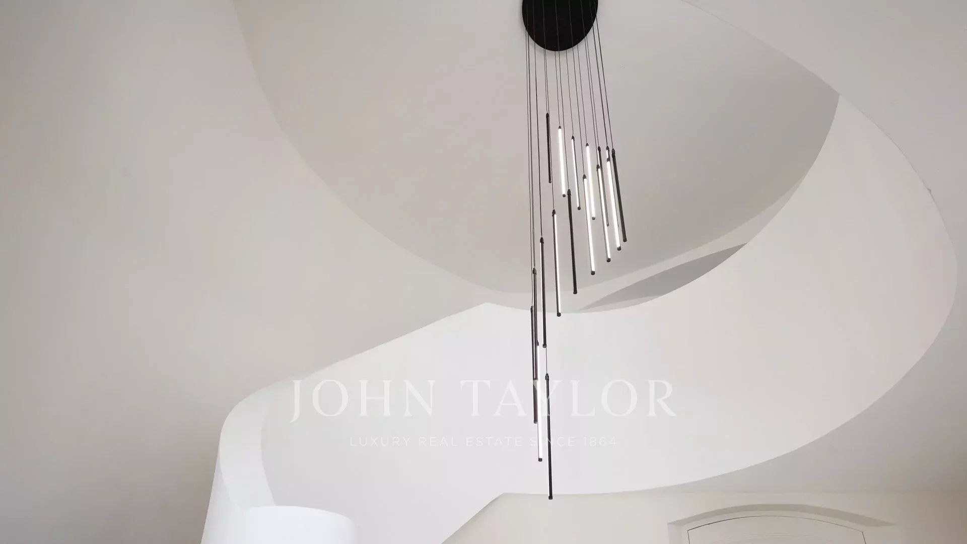Přízemí s obytnou plochou 301 m² na pozemku o rozloze 2147 m² zahrnuje vstupní halu, světlý obývací pokoj o rozloze 120 m², otevřenou kuchyň, pracovnu, toaletu pro hosty a obývací pokoj. První patro: hlavní ložnice s terasou, šatnou a koupelnou, WC. Úroveň zahrady: ložnice se sprchou, WC a herna, dvě ložnice sdílející sprchu s WC.