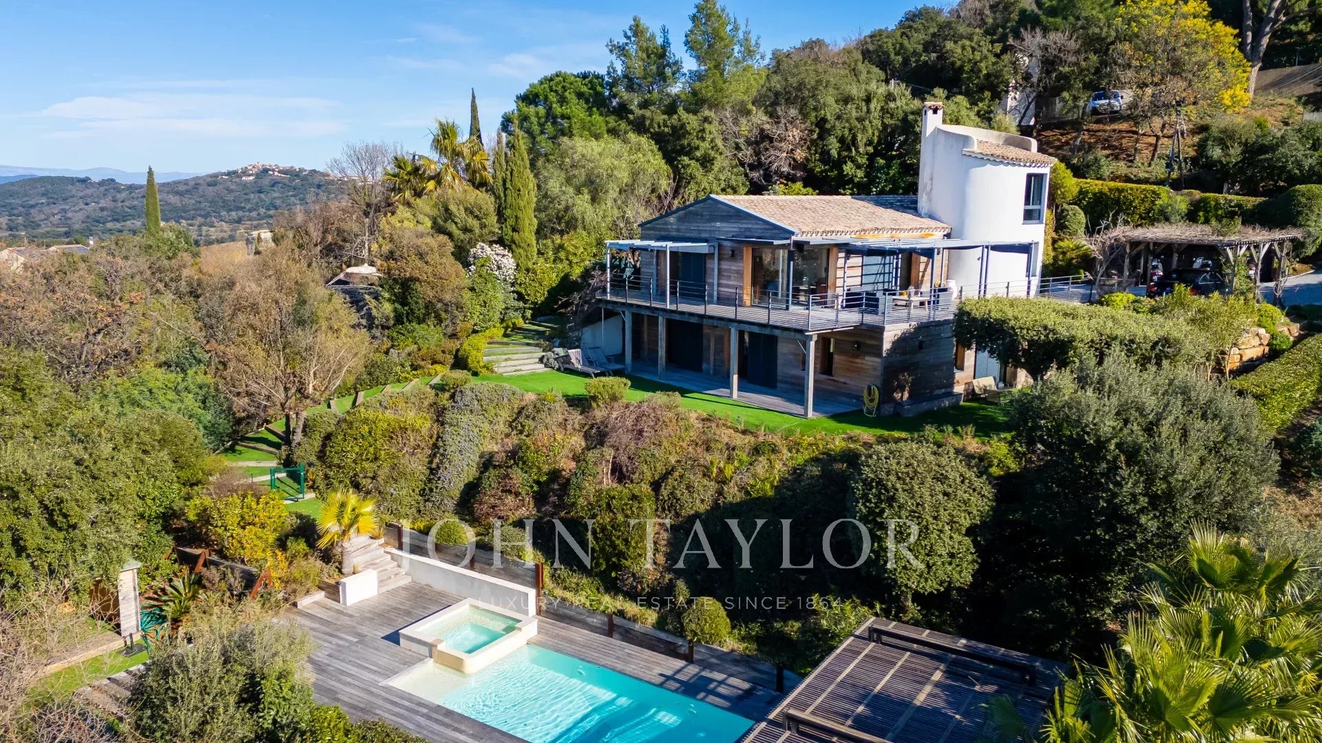 Nemovitost se nachází na svahu, je orientována na jih a nabízí výjimečný výhled na Středozemní moře, Zlaté ostrovy a přístav Cavalaire-sur-Mer.