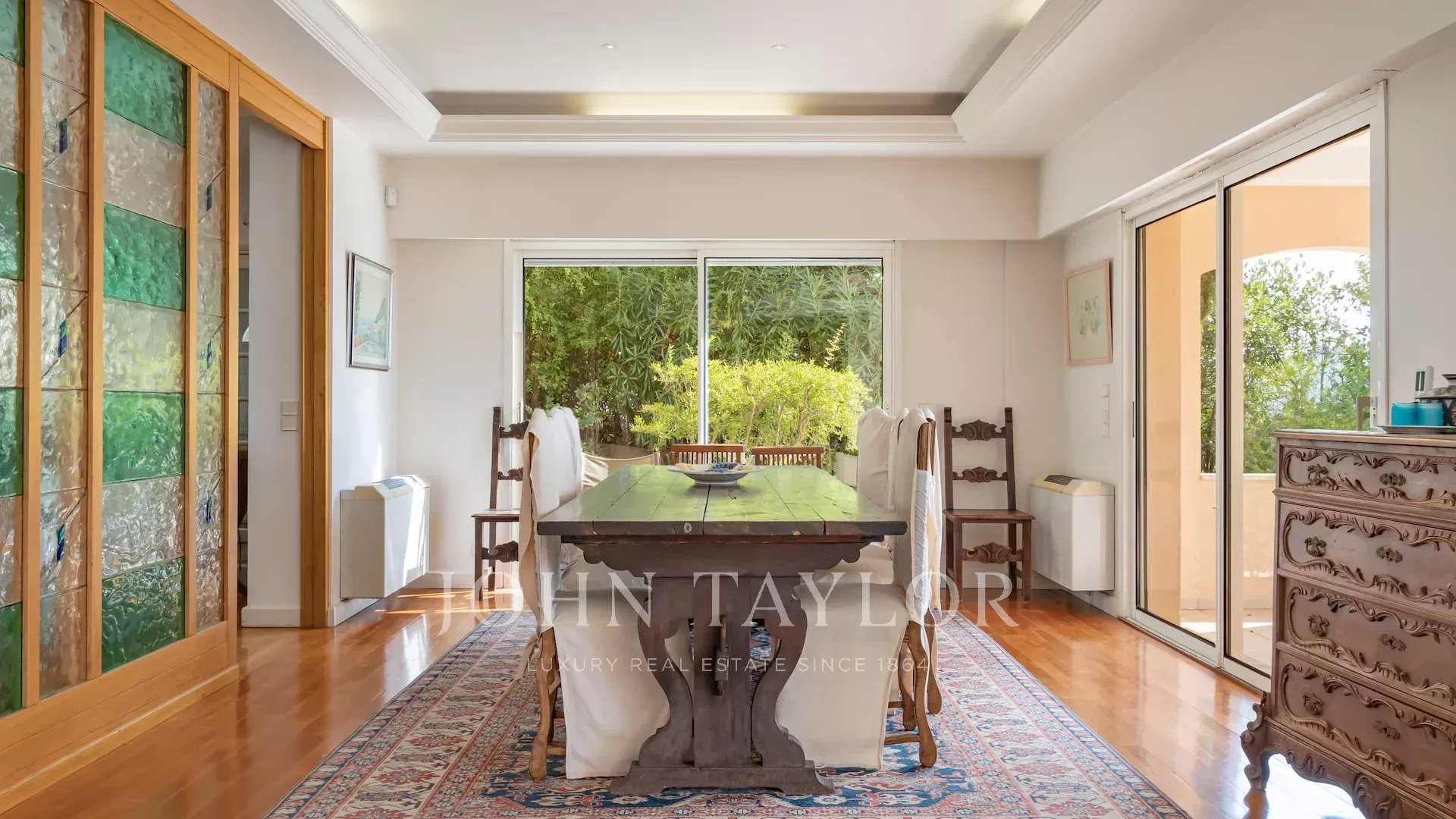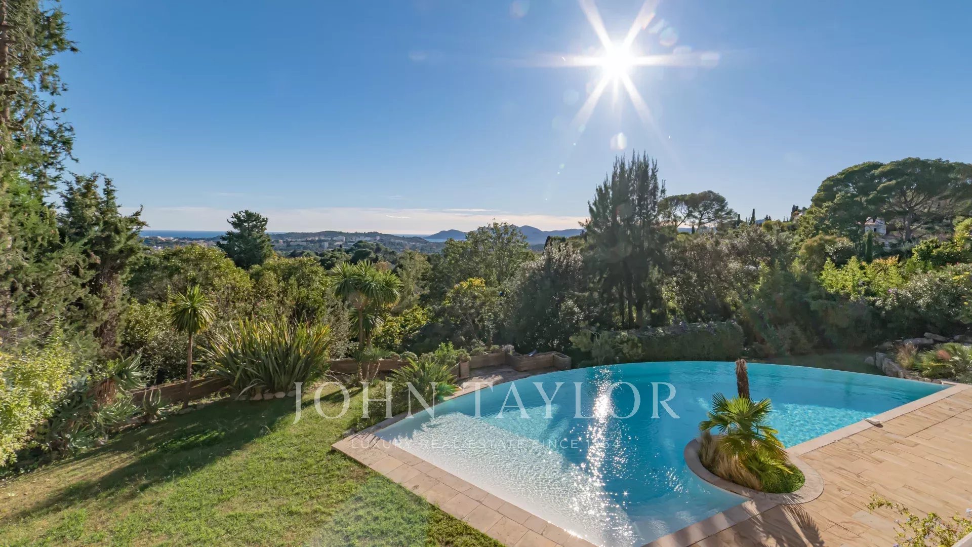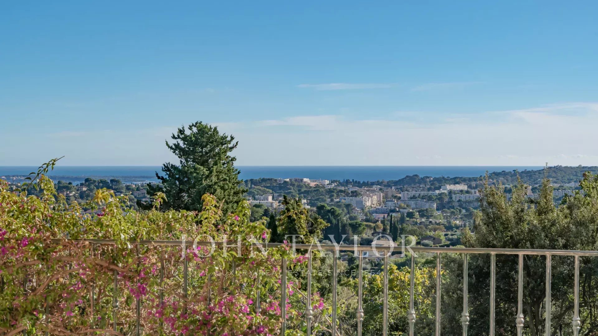 Tato krásná vila se nachází mezi starou vesnicí a centrem Mougins, v klidné slepé ulici, a nabízí nádherný výhled na moře, ostrovy Lérins a masiv Esterel.