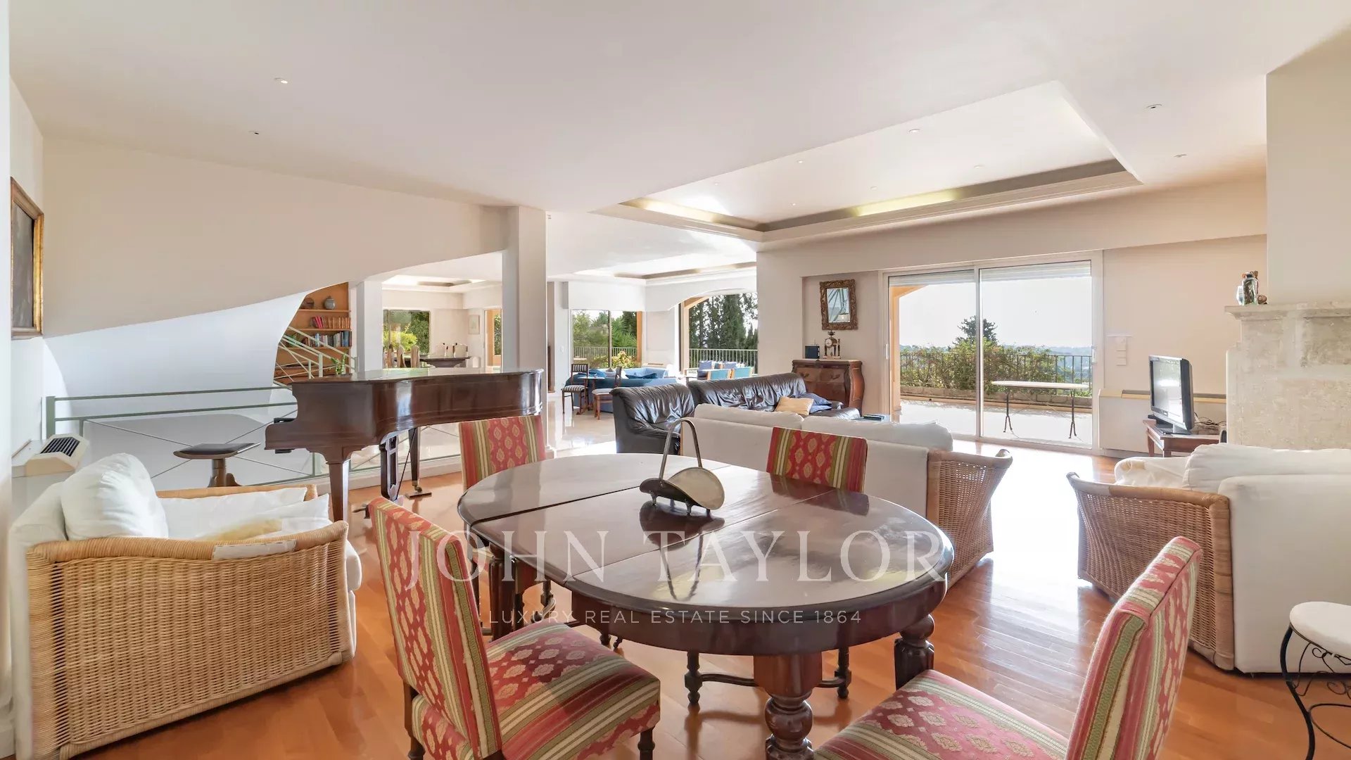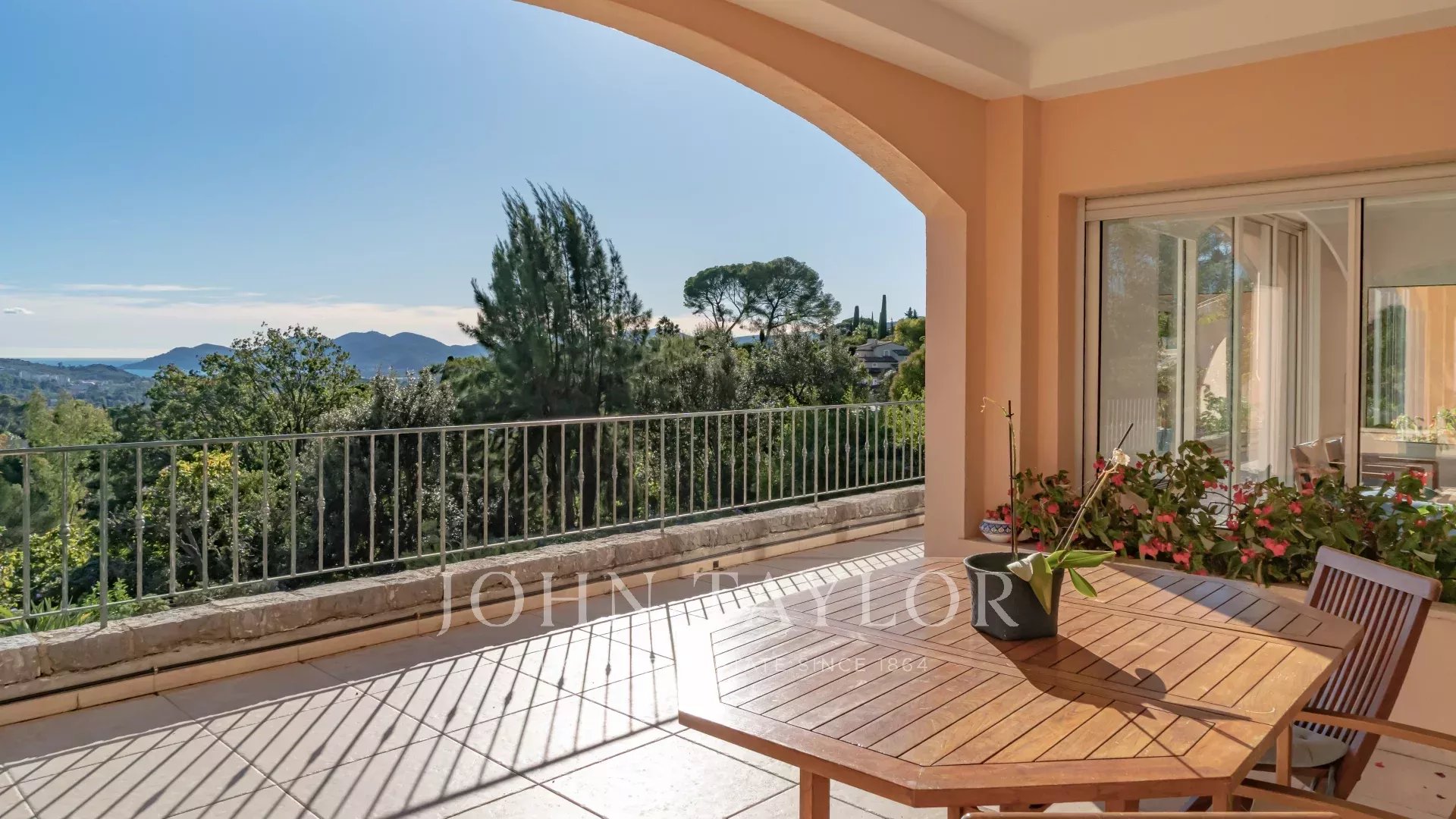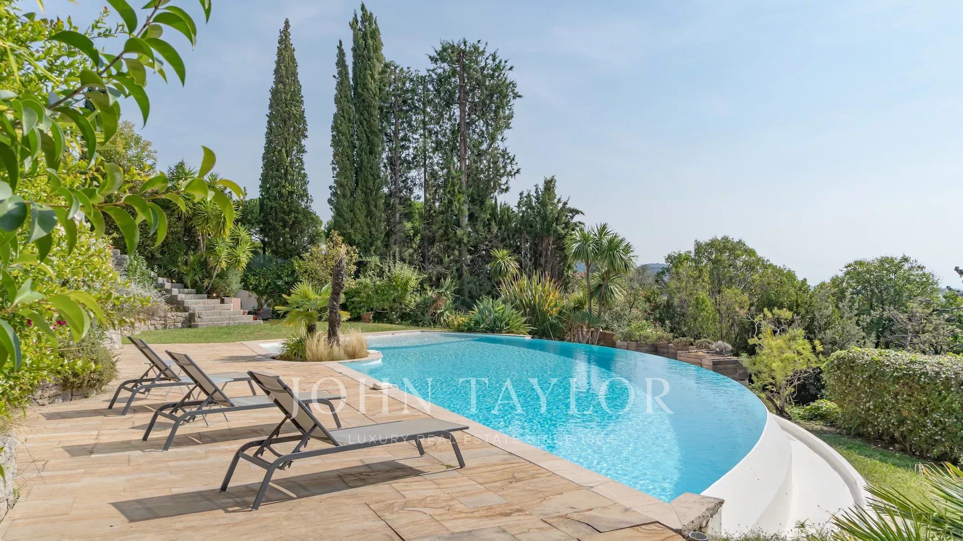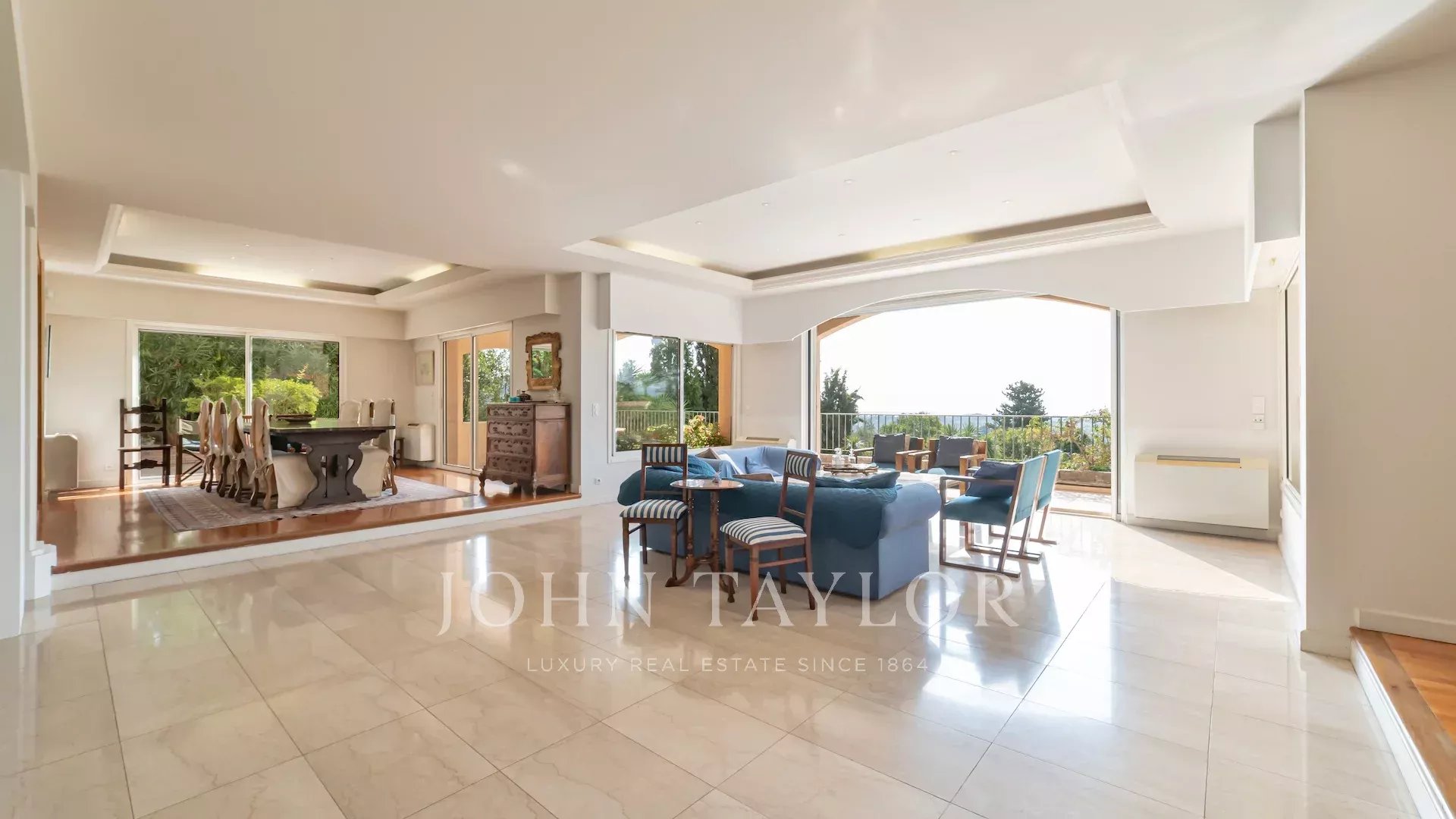 Tato krásná vila se nachází mezi starou vesnicí a centrem Mougins, v klidné slepé ulici, a nabízí nádherný výhled na moře, ostrovy Lérins a masiv Esterel.