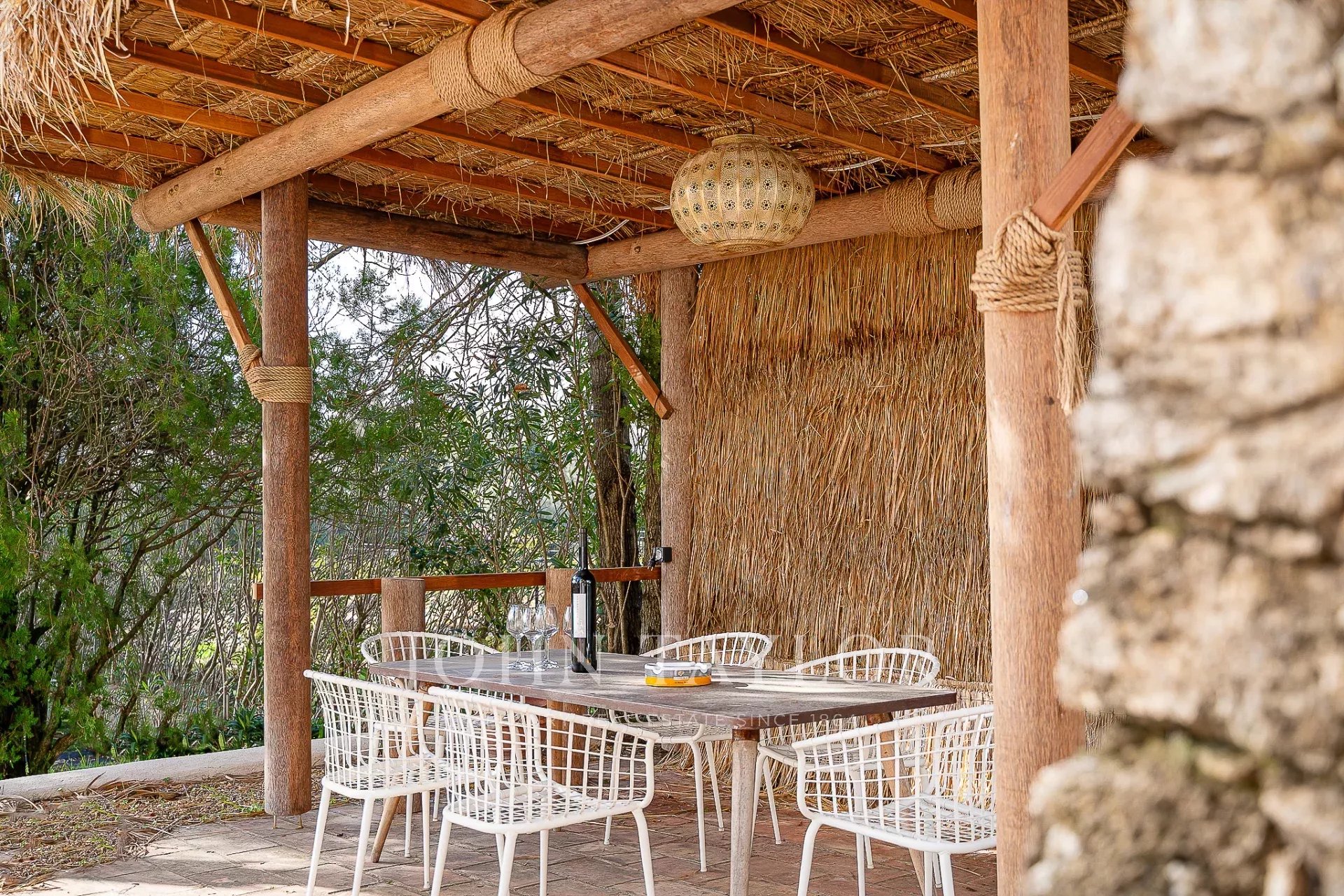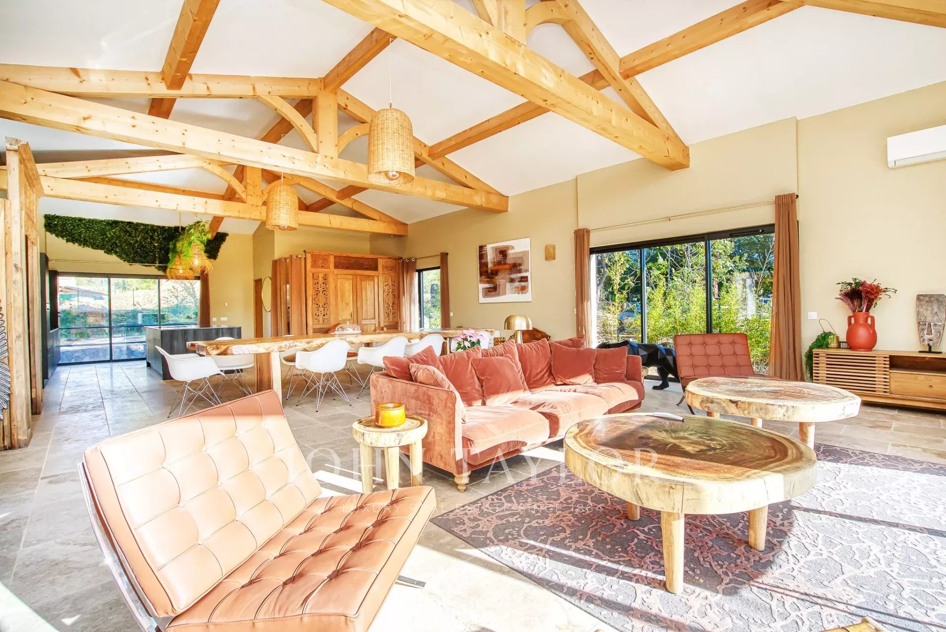 Obývací pokoj, zalitý přirozeným světlem, se rozkládá na velkorysé ploše 120 m² a nabízí příjemný a elegantní obytný prostor. Těží ze všech 4 expozic s velkými okny s výhledem na nádhernou okolní krajinu a zámek Château de Grimaud. Plně vybavená kuchyně je skutečným klenotem domu a nabízí funkční a atraktivní prostor.