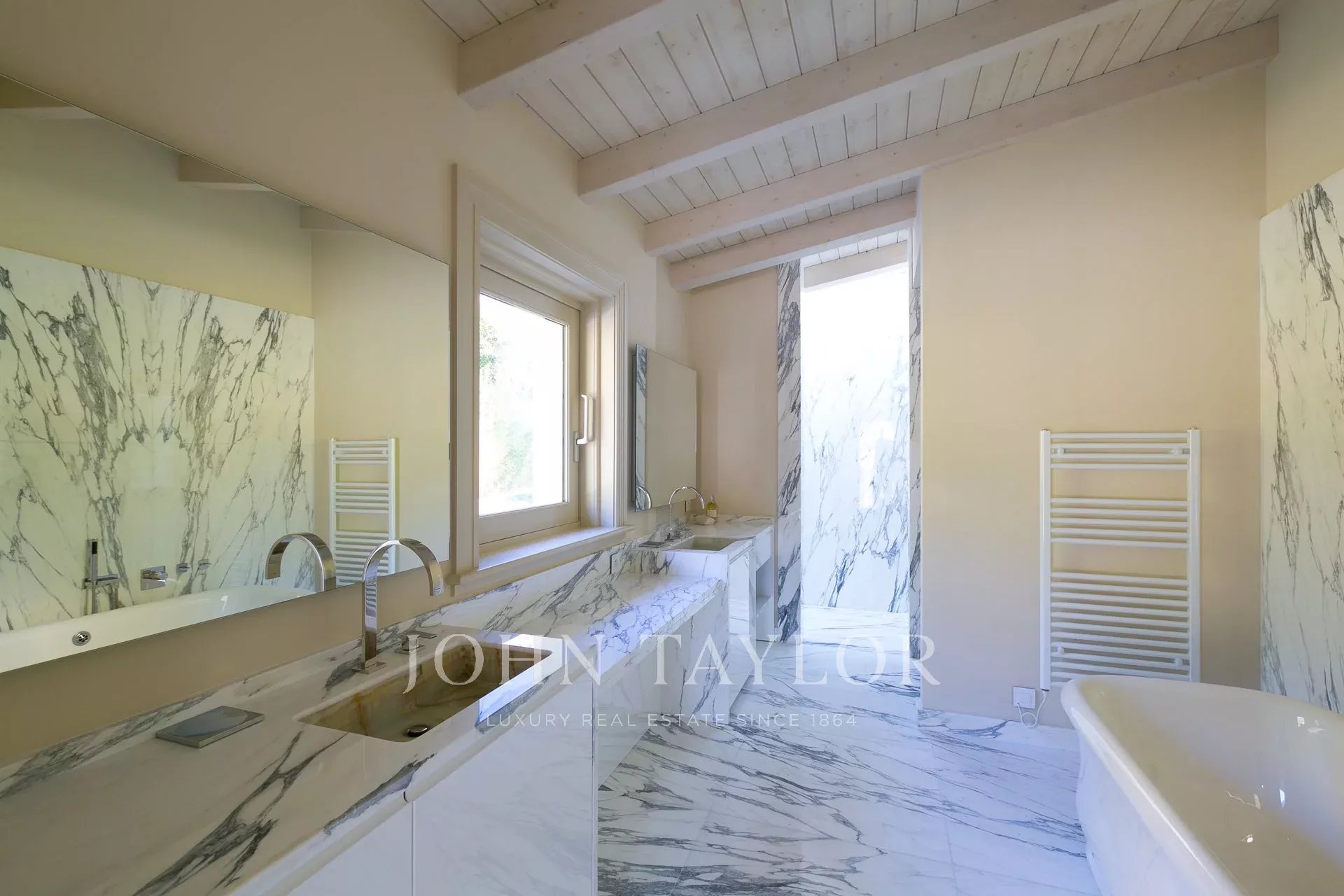 Stojí na pozemku o rozloze přibližně 6 000 m² a skládá se z hlavní vily, domu pro hosty, domku pro správce a bytu pro personál. Dva bazény, tenisový kurt a garáž pro 8-10 aut i kryté venkovní parkoviště.