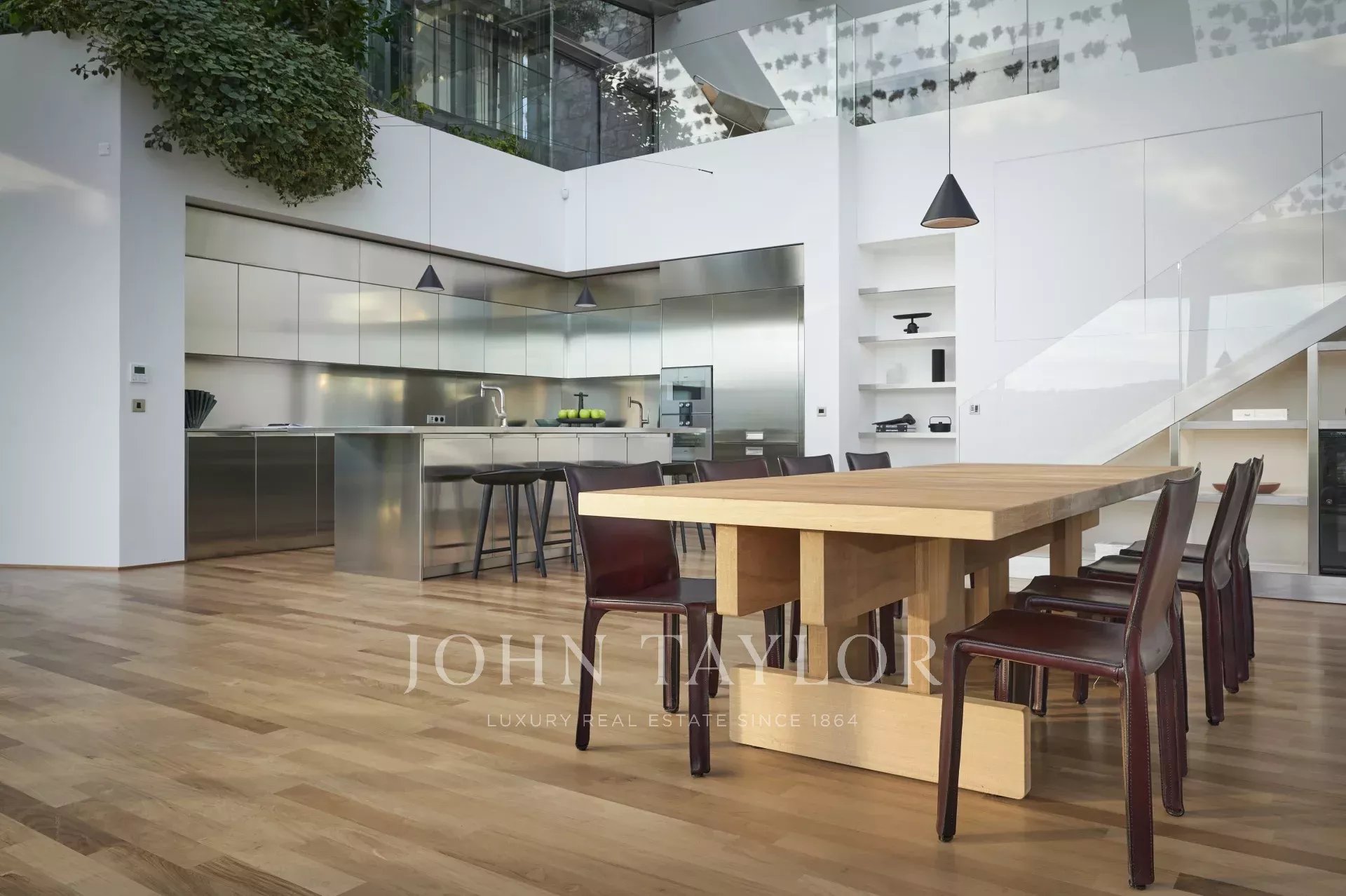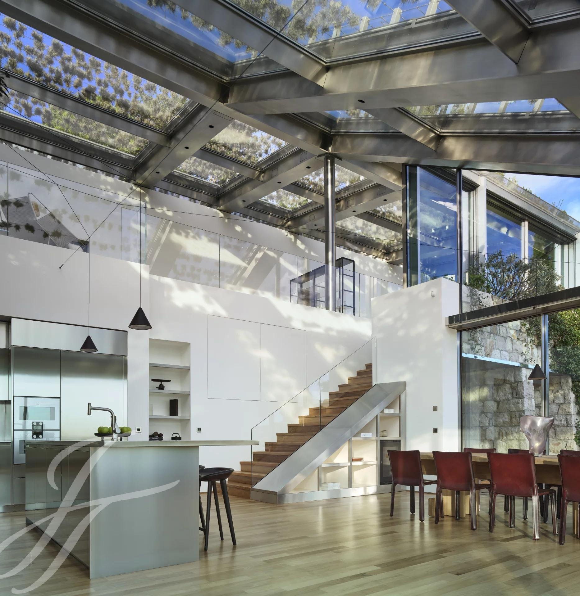 Radikálně moderní obývací pokoj, jídelna a kuchyně se pyšní stropy s dvojitou výškou. Prosklené stropy! Samozřejmě speciálně upravenými, které lze zastínit speciálními žaluziemi.