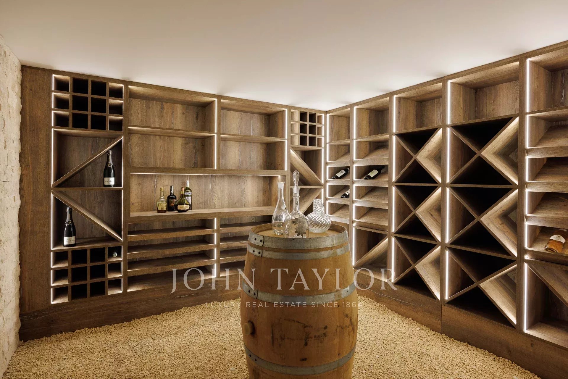 Na úrovni zahrady najdete posilovnu se sprchou a saunou, nádherný vinný sklípek a přímý přístup k bazénu.