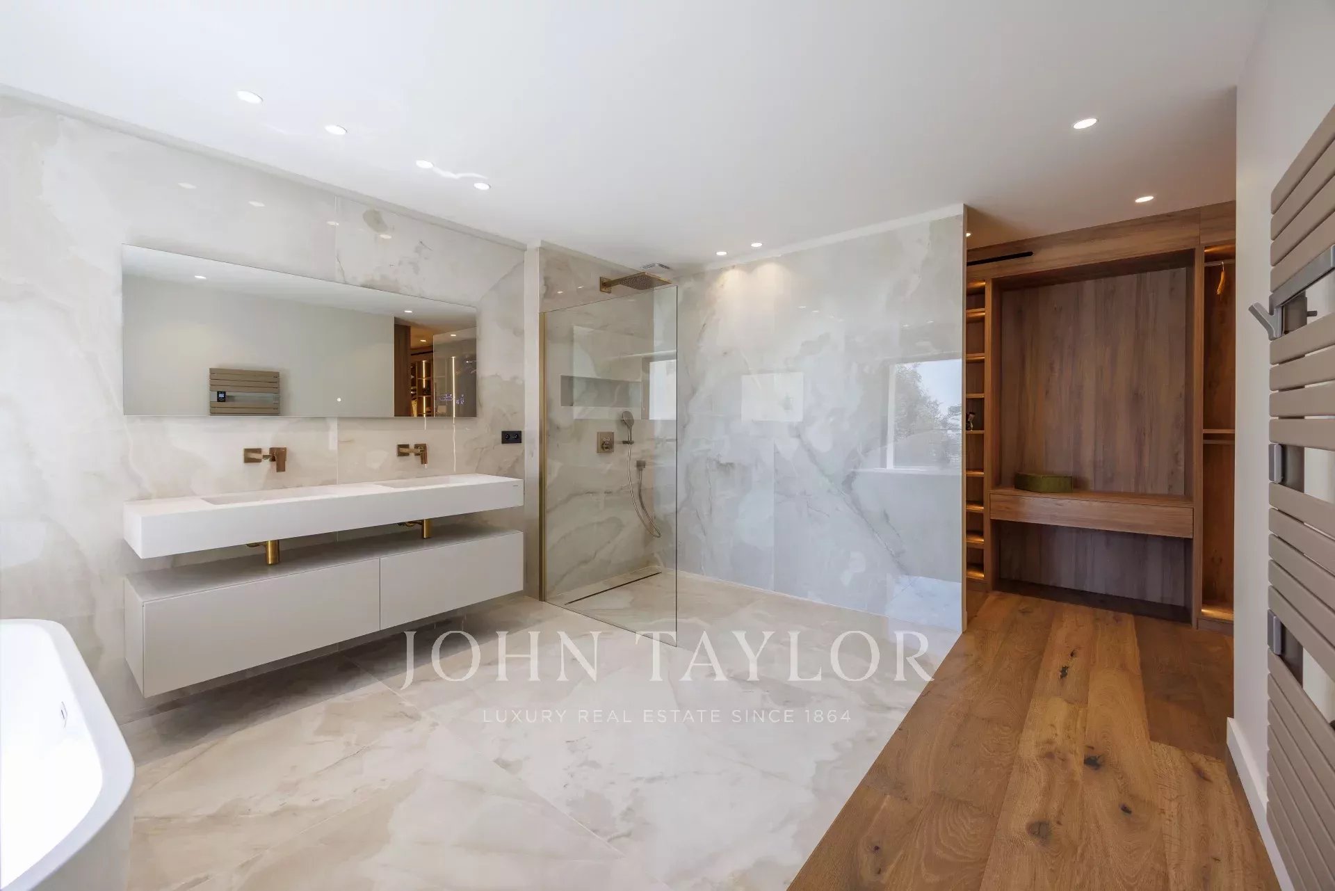 Na jedné úrovni se nachází rozlehlý, světlý obývací pokoj o rozloze 78 m² s plynovým krbem, elegantní knihovna, prostorná vybavená kuchyně o rozloze 47 m² s posuvnými skleněnými dveřmi otevírajícími se na terasu krytou pergolou. Tuto úroveň doplňuje sklad a vynikající hlavní apartmá v přízemí, přičemž všechny prostory mají přímý přístup do venkovního prostředí.