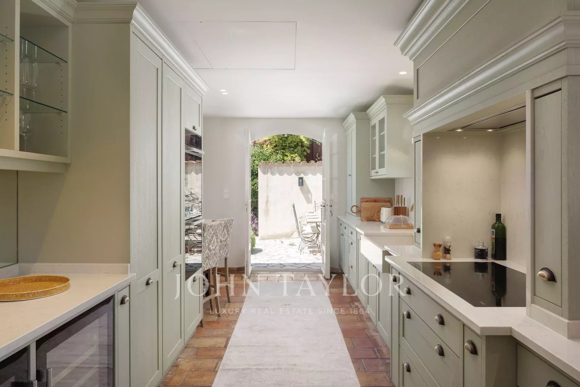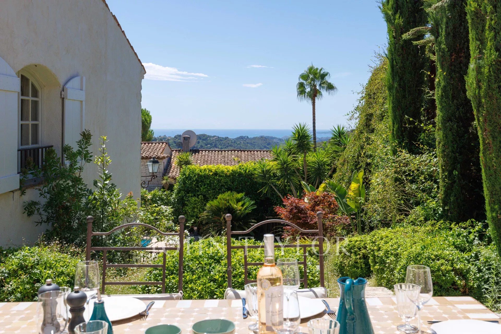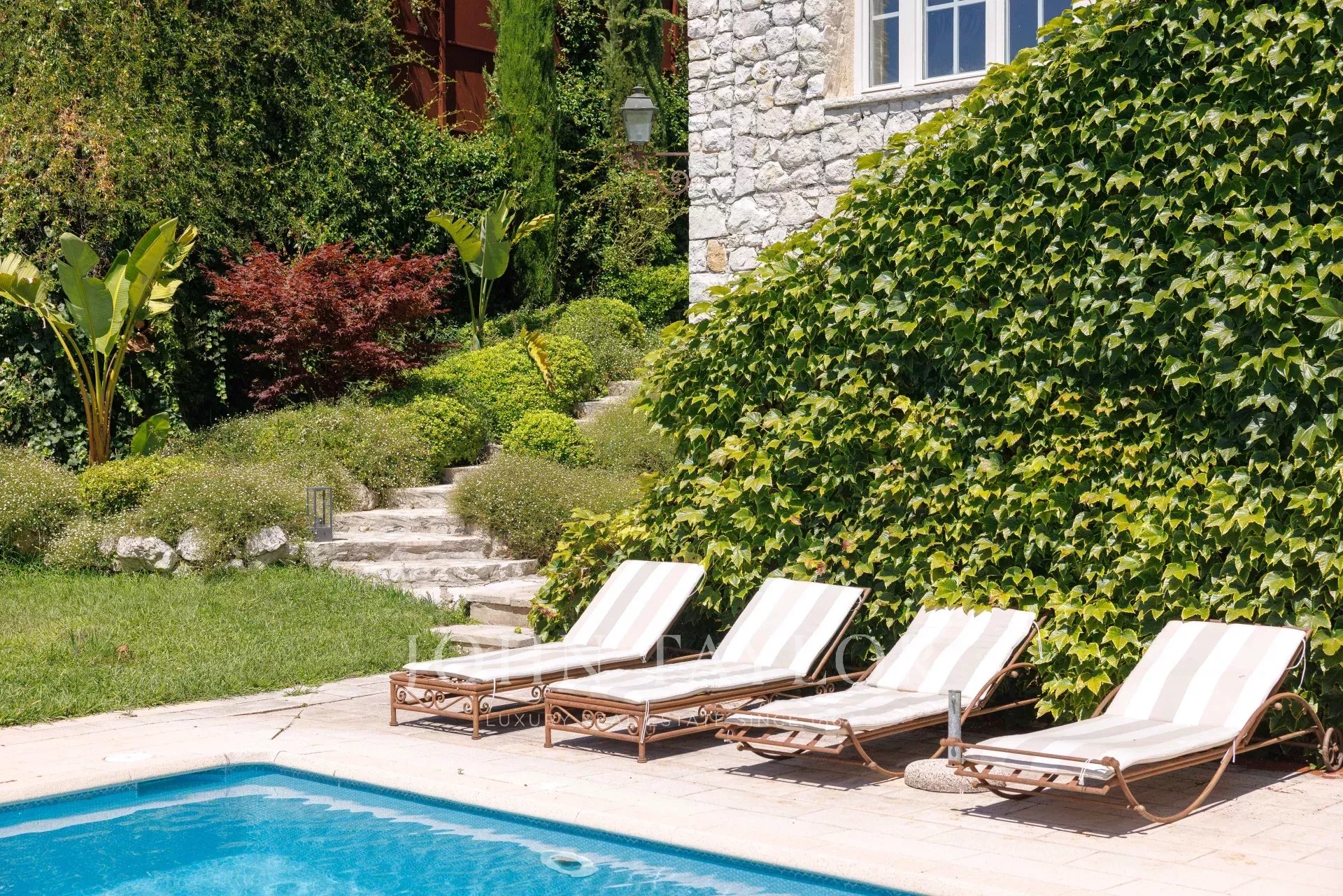 Zahrada byla celá navržena renomovaným zahradním architektem Jeanem Musem a nabízí řadu prostor, včetně velkého nádvoří s přístřeškem pro dvě vozidla a fontánou, jídelní zóny spojené s kuchyní s výhledem na moře na Cap d'Antibes, krásné terasy obývacího pokoje a bazénu s domkem u bazénu a terasou, ideální pro odpočinek a hry s přáteli a rodinou!