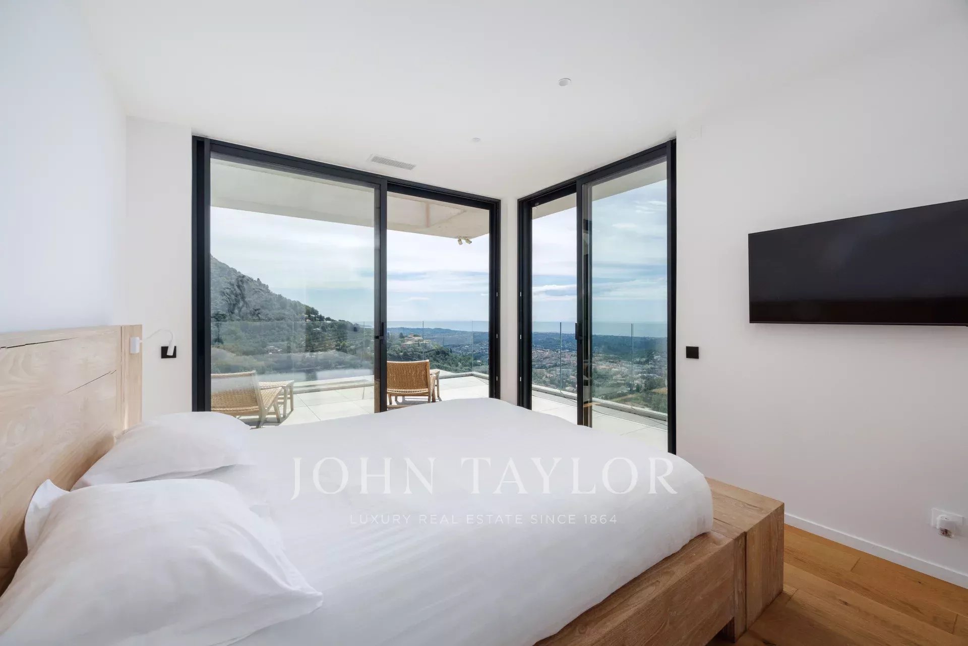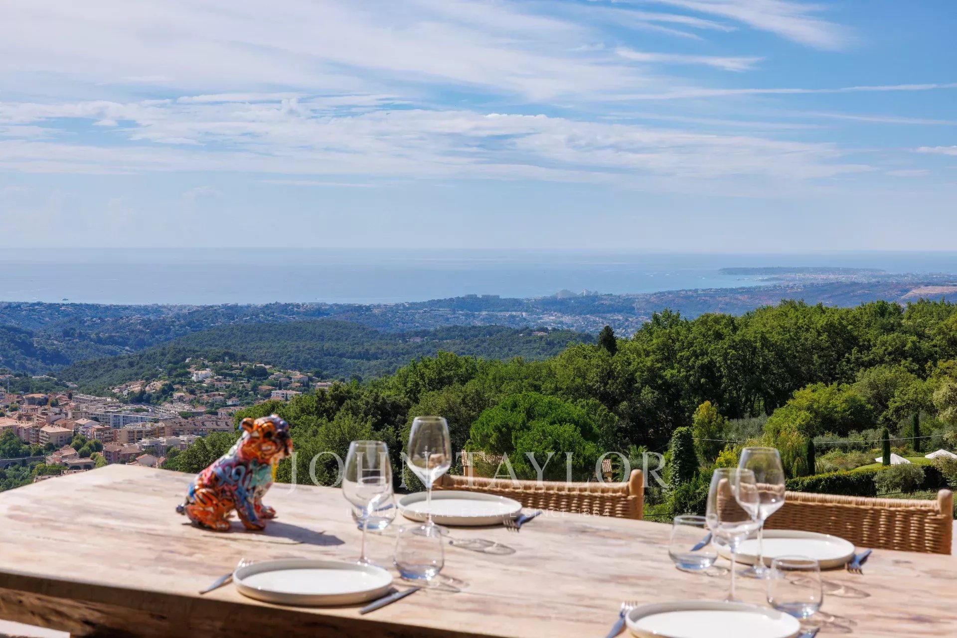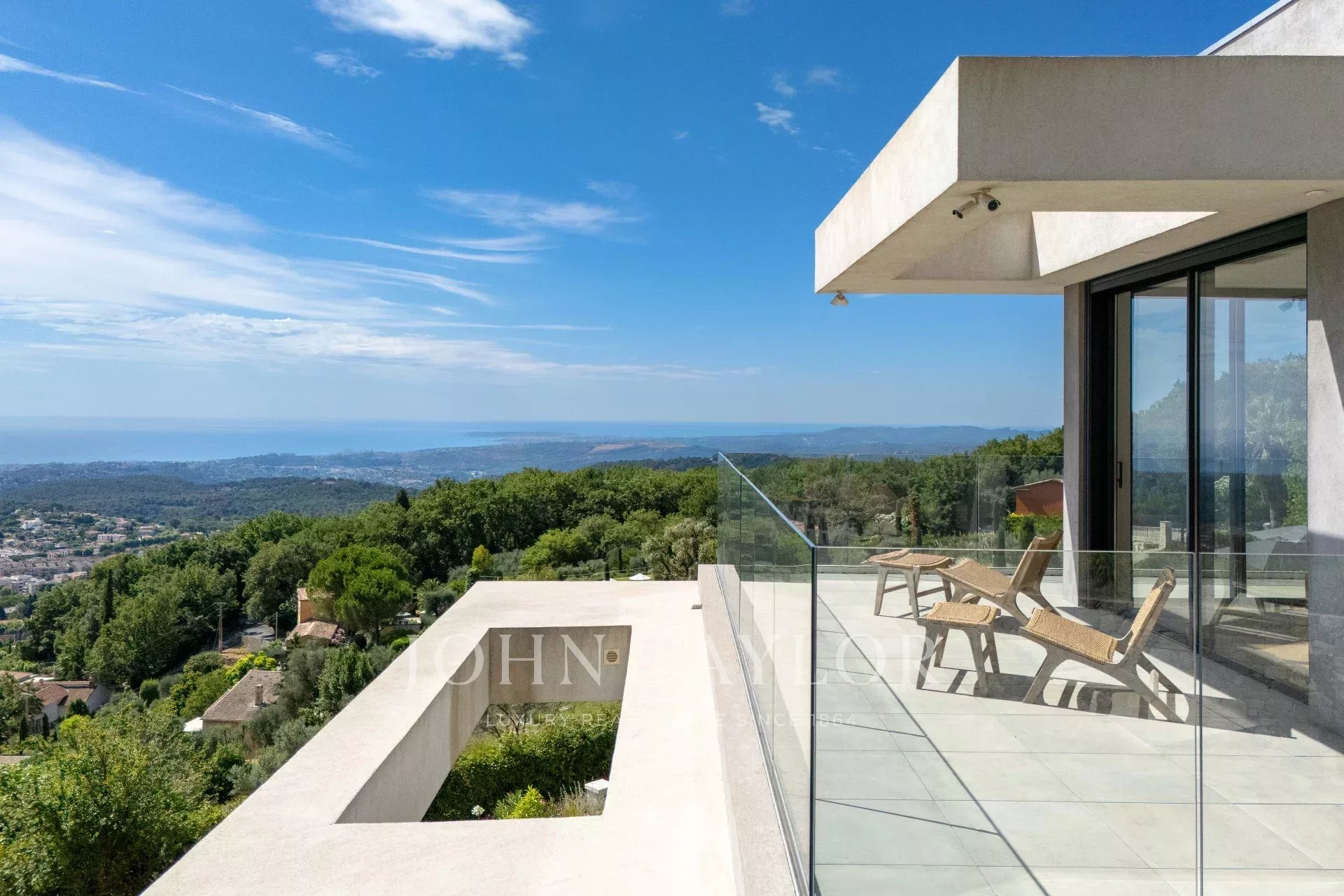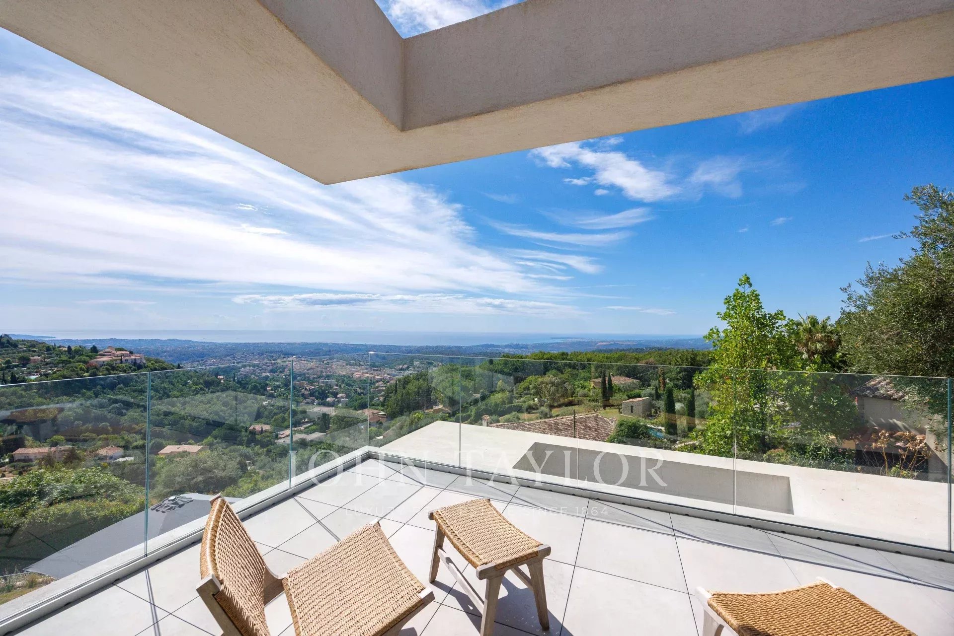 Tato vynikající, nedávno postavená moderní vila (355 m²) má ideální polohu v kopcích nad Vence, uprostřed upraveného pozemku o rozloze 4 000 m². Nabízí výjimečné prostředí s malebným výhledem na moře - od Cap d'Antibes po Baie des Anges a až po Cap Ferrat - a okolní hory.
