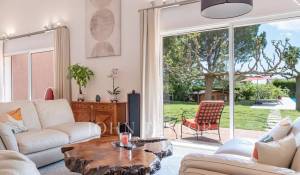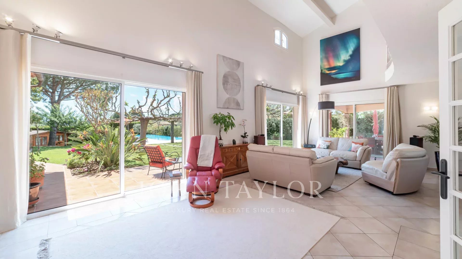 Prostorný a světlý obývací prostor s vysokými stropy a výhledem na udržovanou zahradu a bazén.