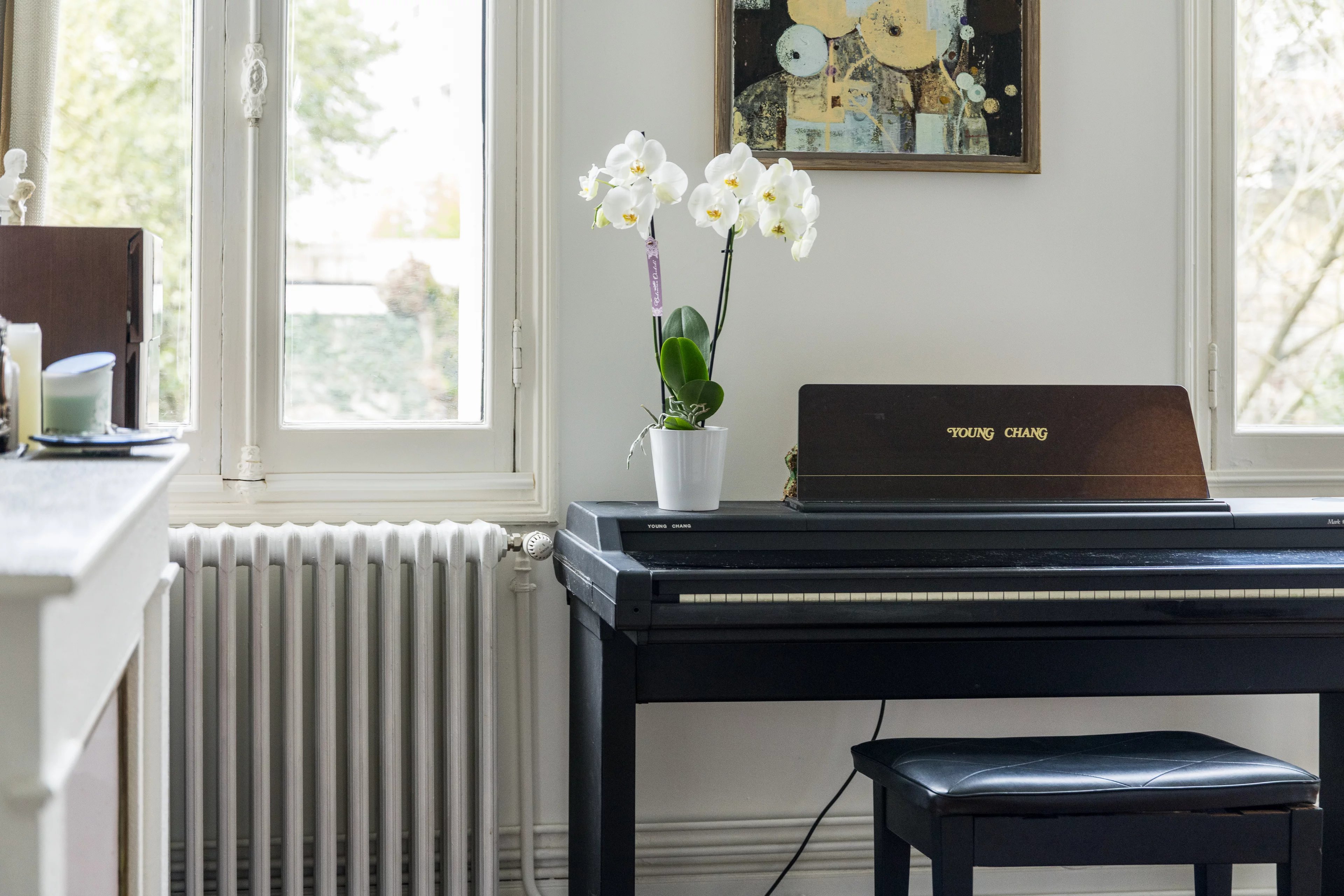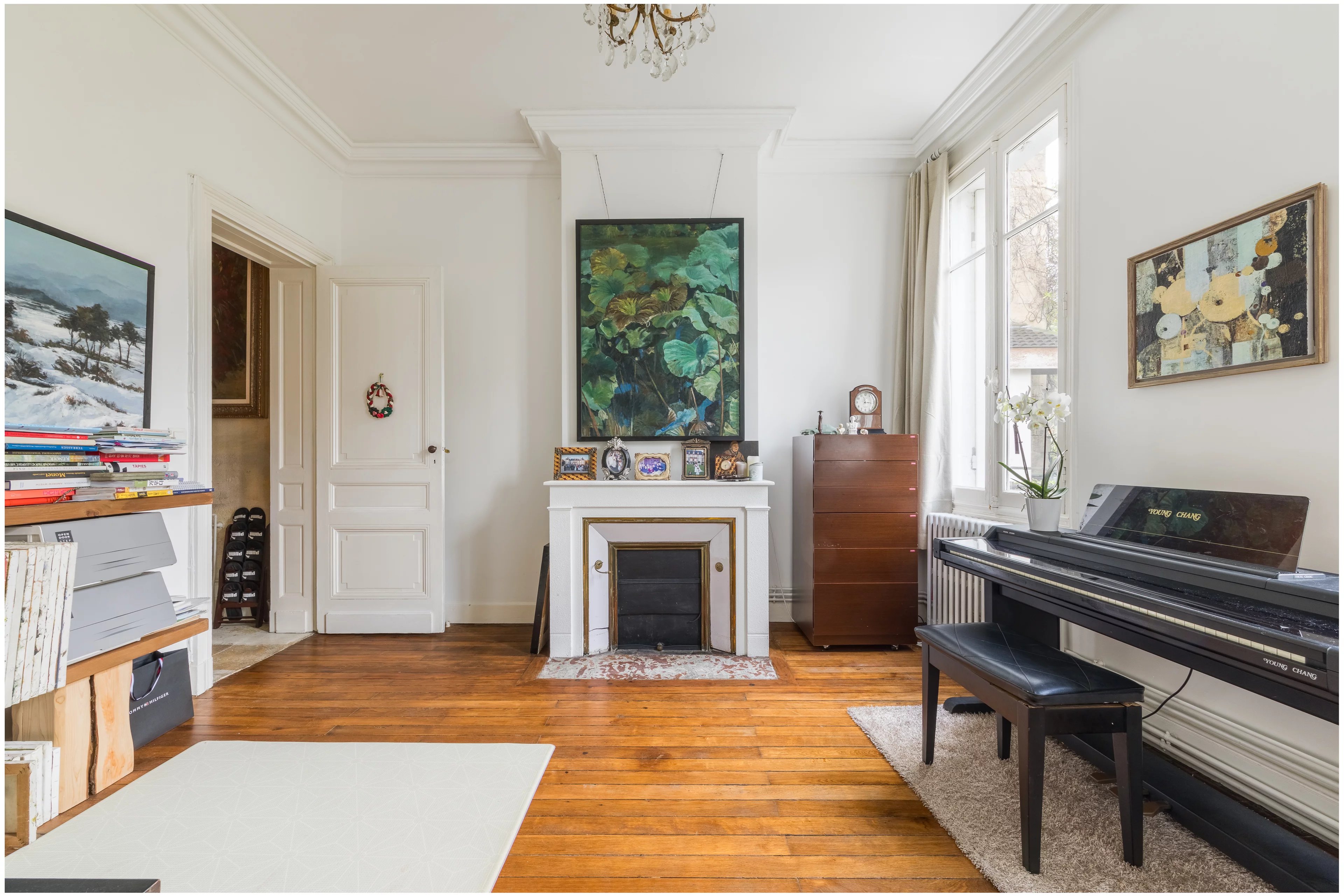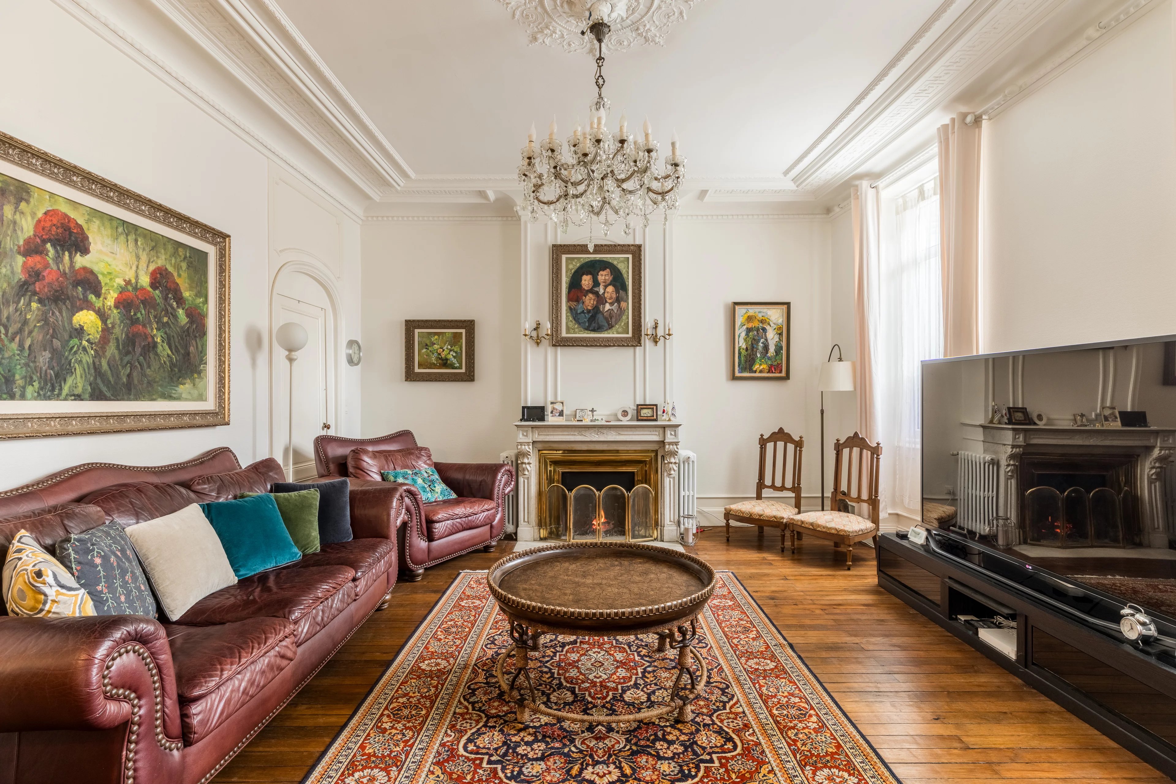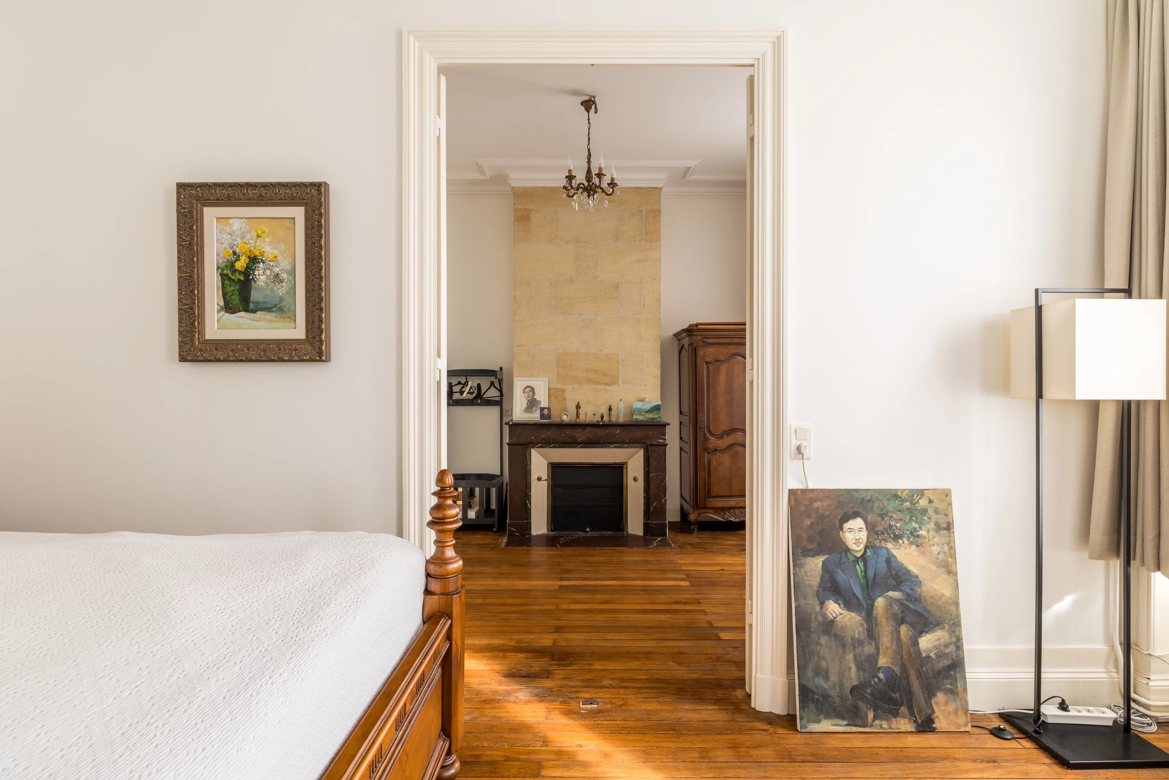 Za vznešenou kamennou fasádou vede vstupní hala s prostorem pro jízdní kolo do velmi elegantního obývacího pokoje o rozloze 30 m², velké kuchyně s jídelnou otevřenou do zahrady a v současnosti dvou přízemních kanceláří, které lze snadno přestavět na ložnice.