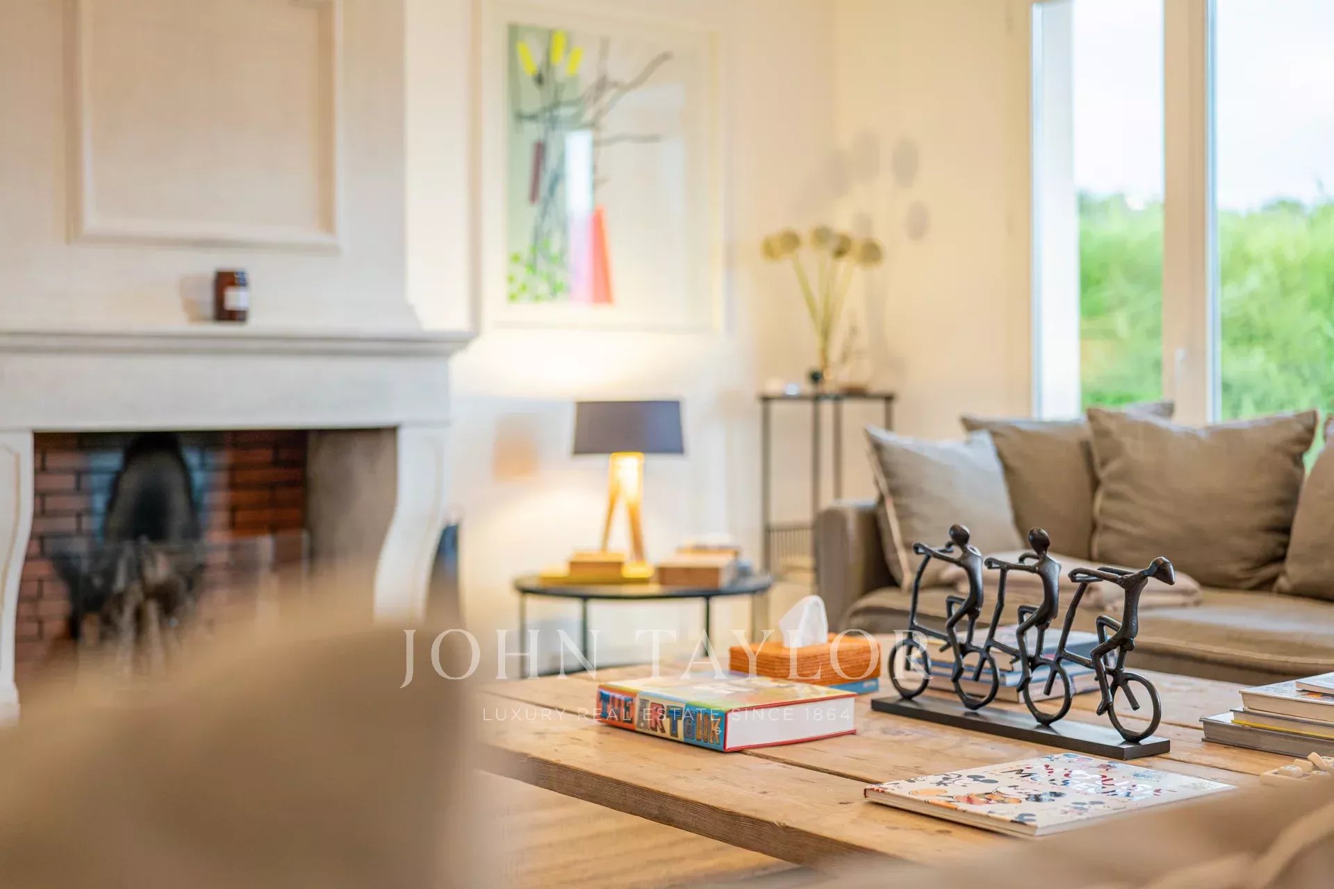 Prostorný obývací pokoj s krbem a televizí