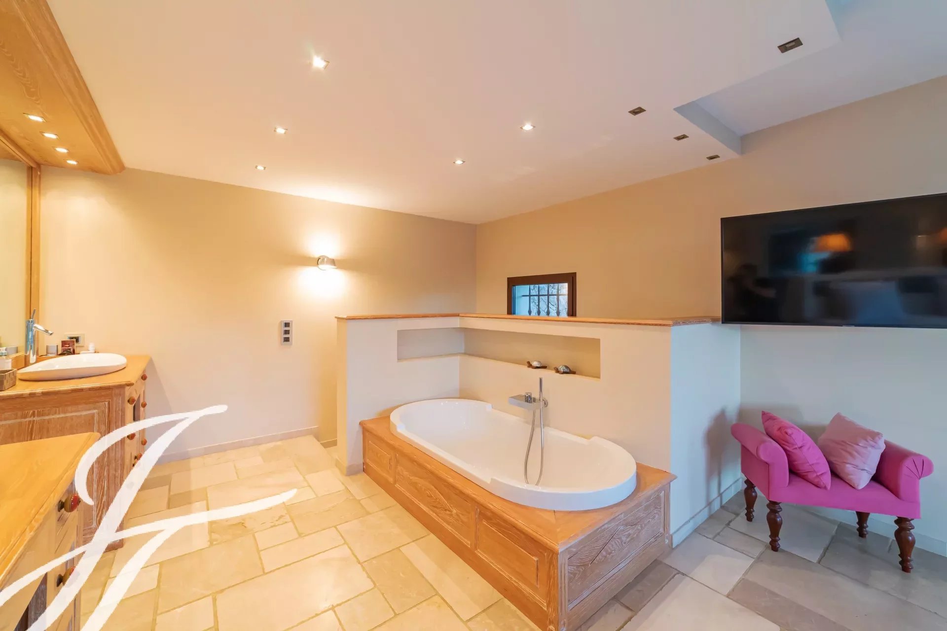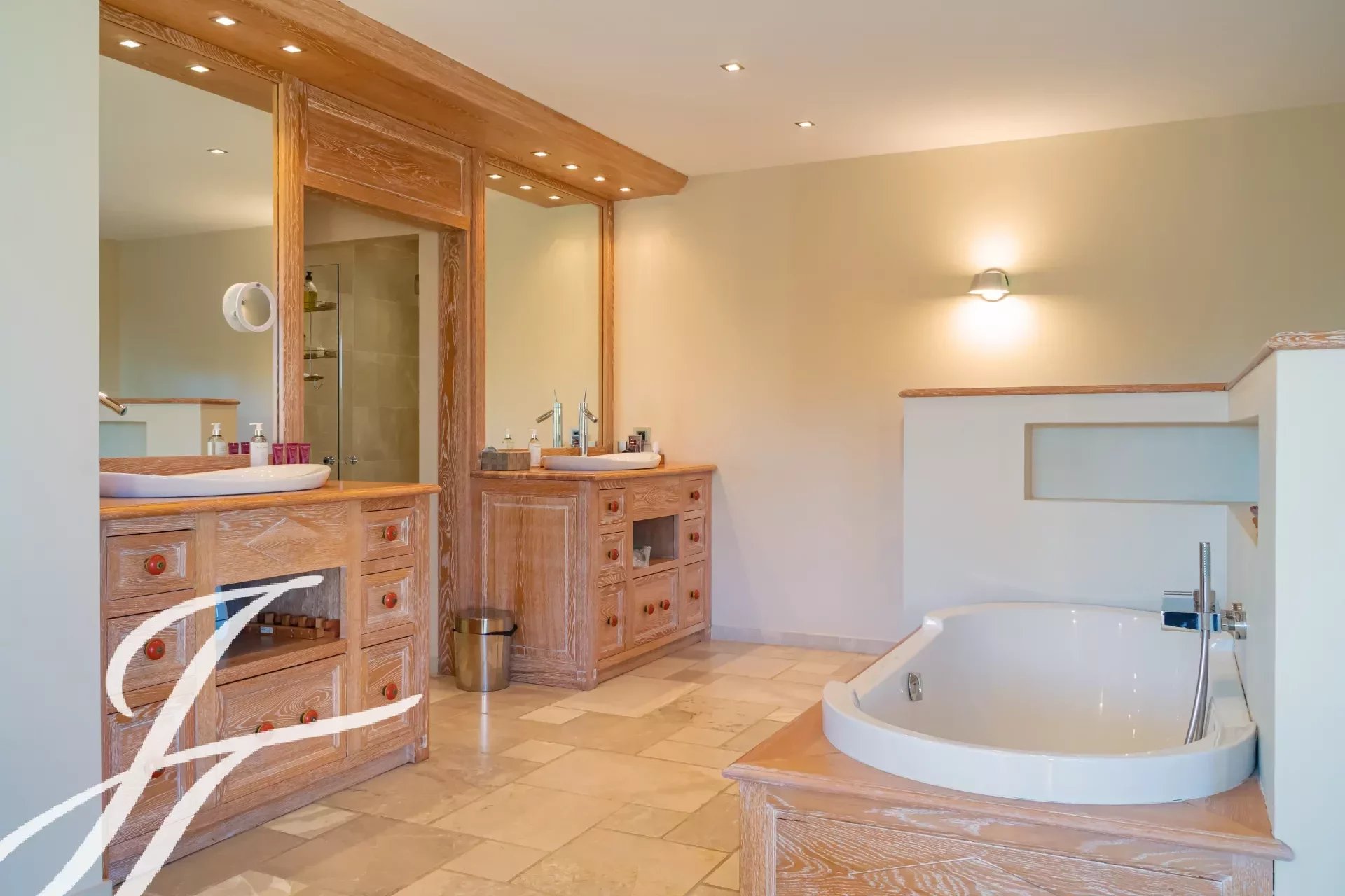 Prostorný hlavní apartmán s vlastní koupelnou s vanou, dvojitým umyvadlem, dvěma sprchami a odděleným WC
