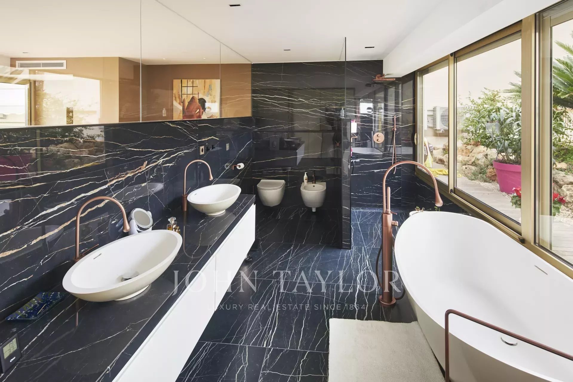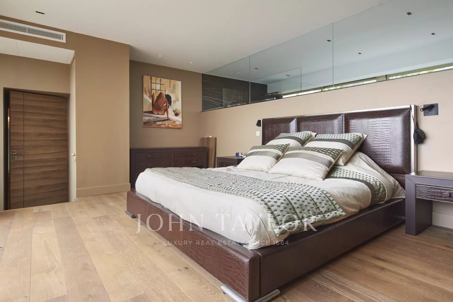 hlavní ložnice s výhledem na hlavní terasu, otevřená koupelna s kompletním příslušenstvím