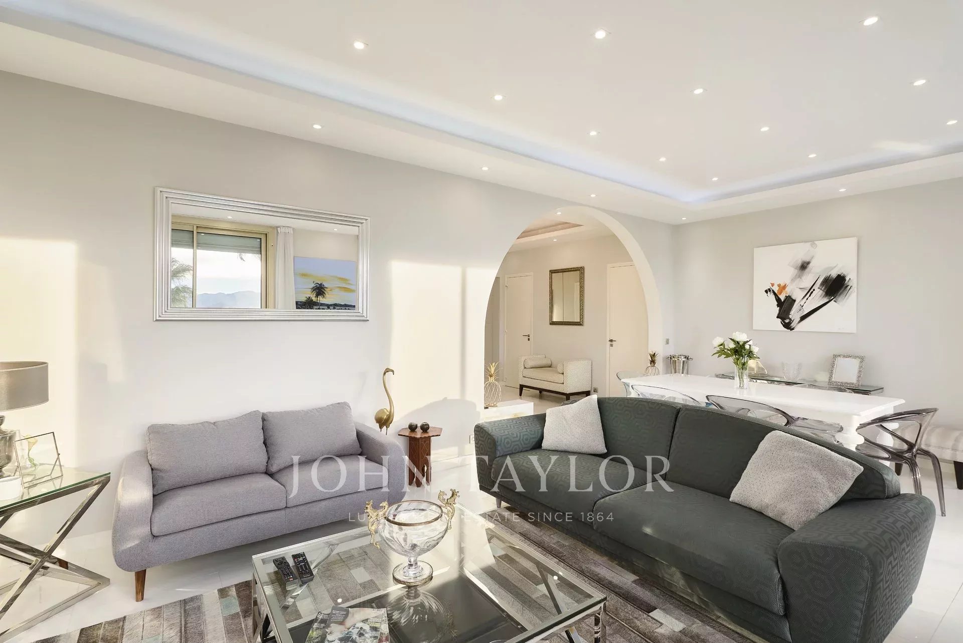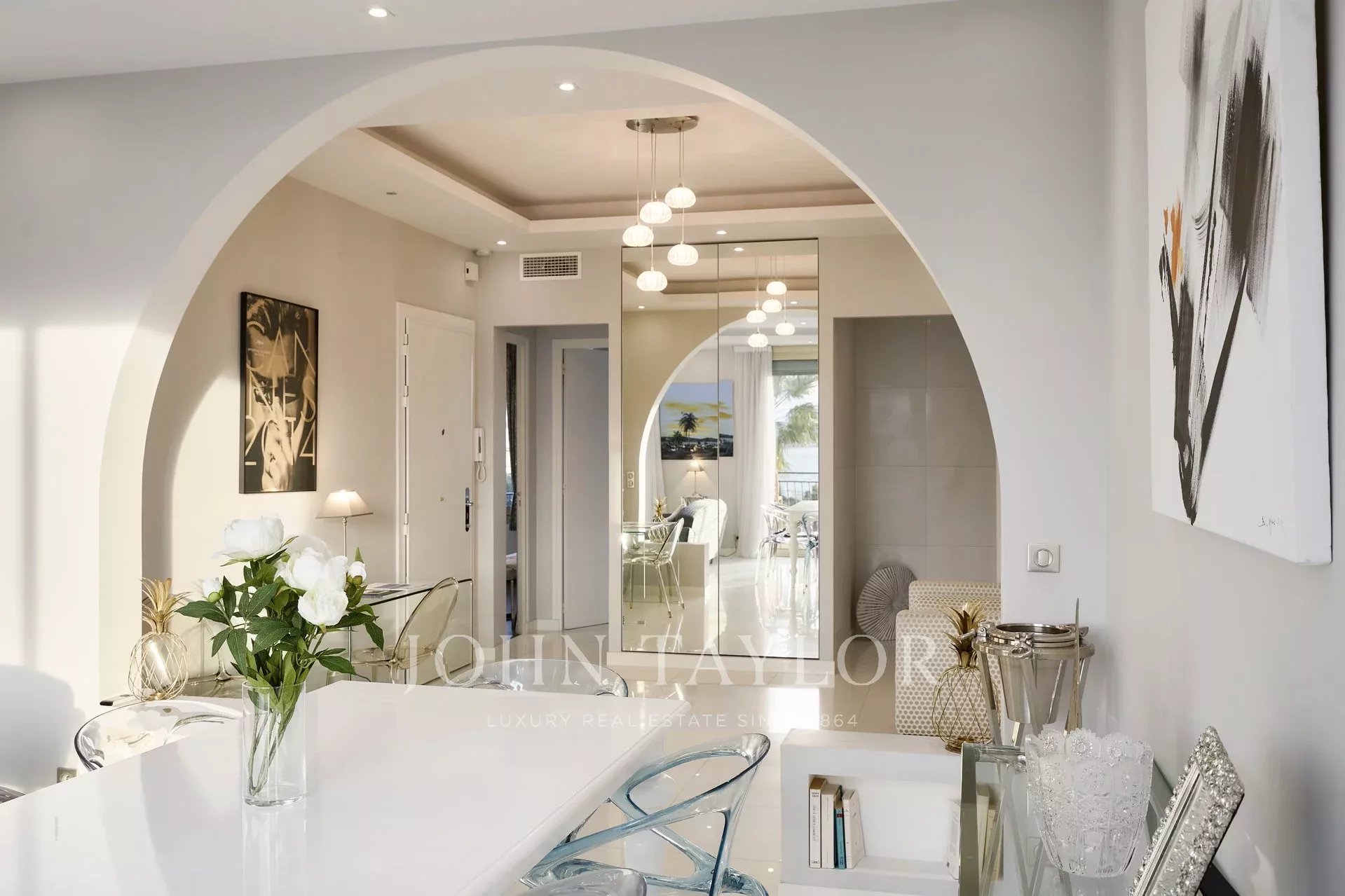 Velká vstupní hala vedoucí do přijímacího pokoje, který se otevírá na terasu a skládá se z obývacího pokoje, jídelny, obývacího pokoje, jídelny, kuchyně a jídelního koutu.