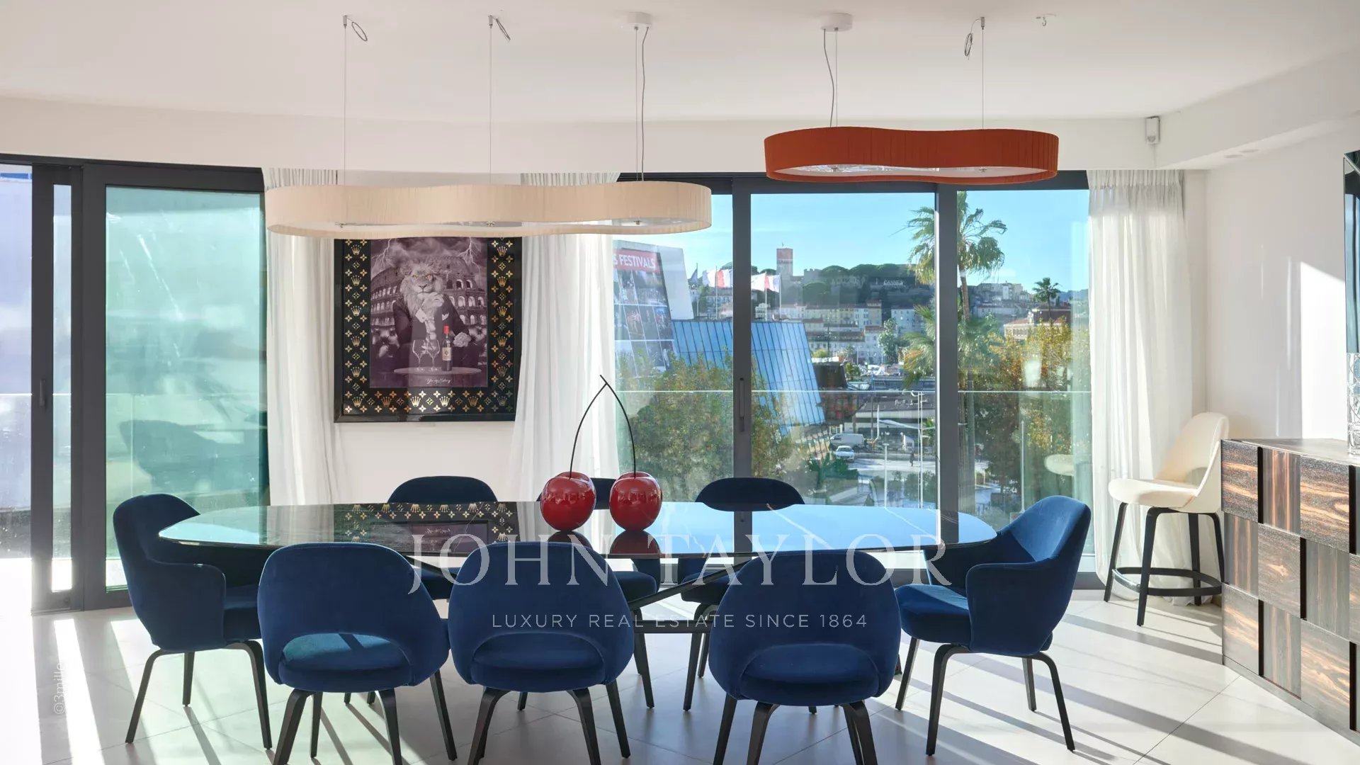Tento nádherný byt o rozloze 231 m² se nachází ve 4. patře prestižní rezidence naproti Palais des Festivals a má terasu o rozloze 25 m2.
