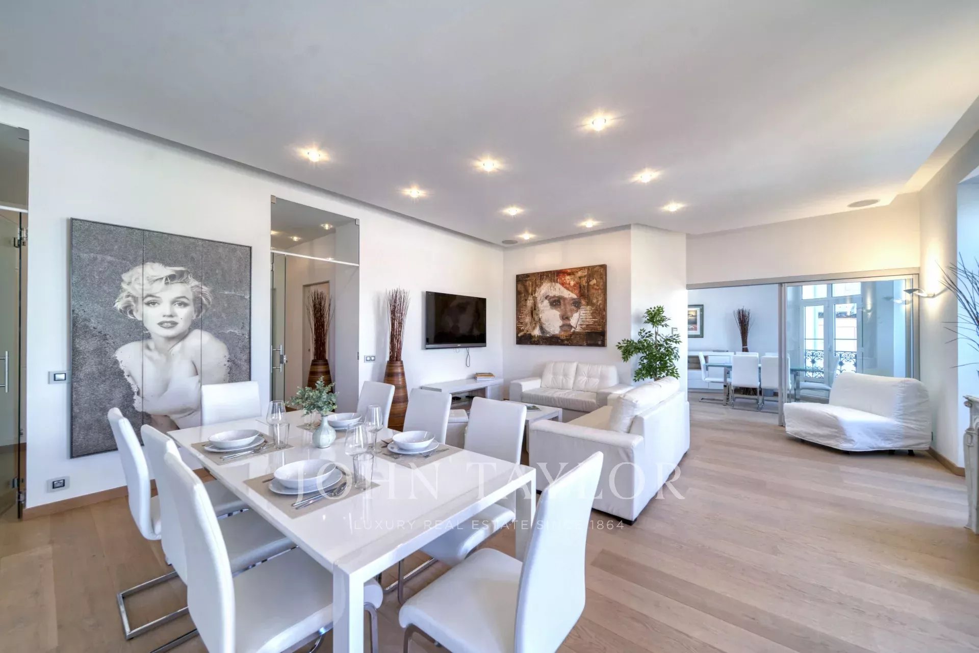 S výhledem na Palais des Festivals, velká přijímací místnost s obývacím pokojem, jídelním koutem a otevřenou vybavenou kuchyní.