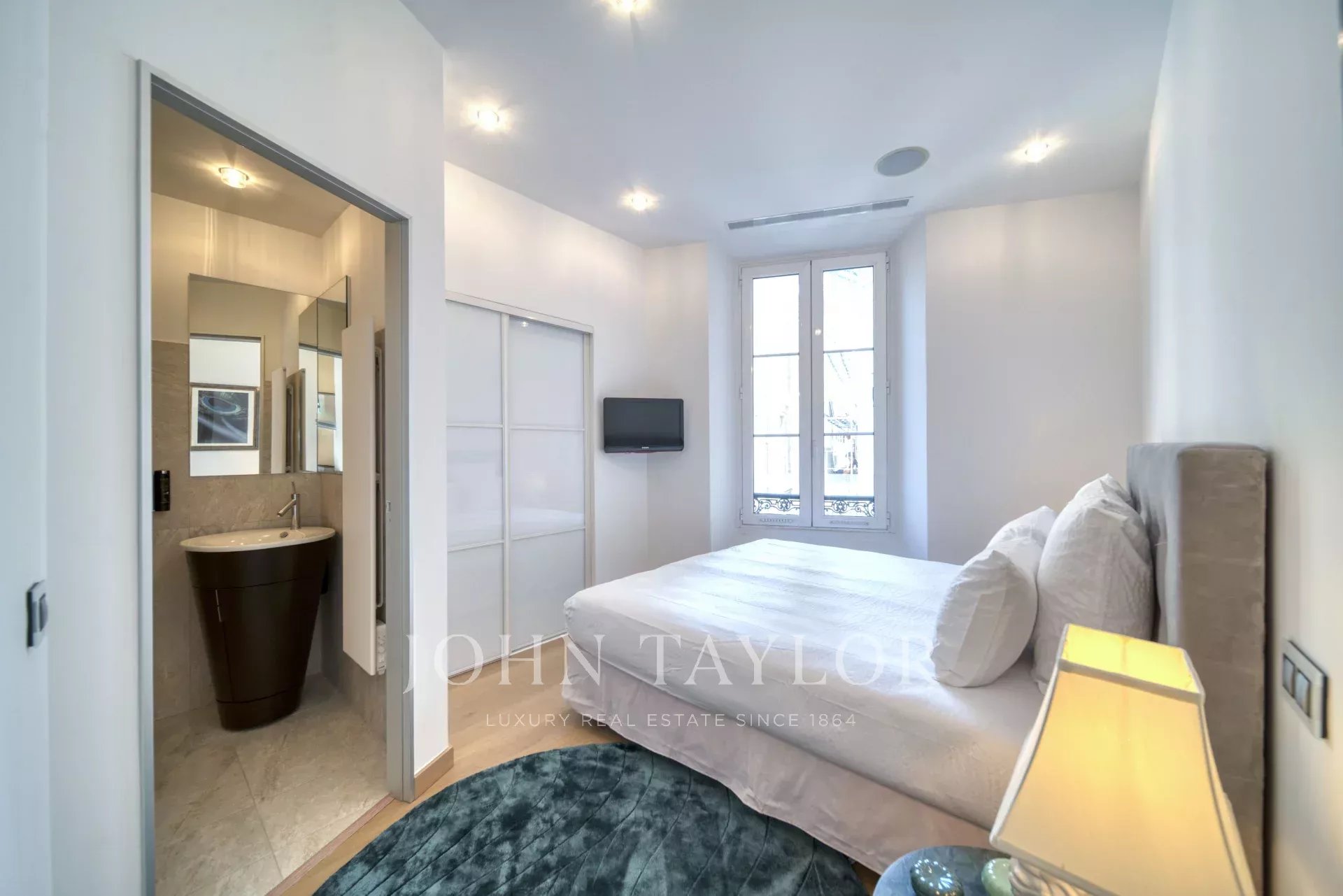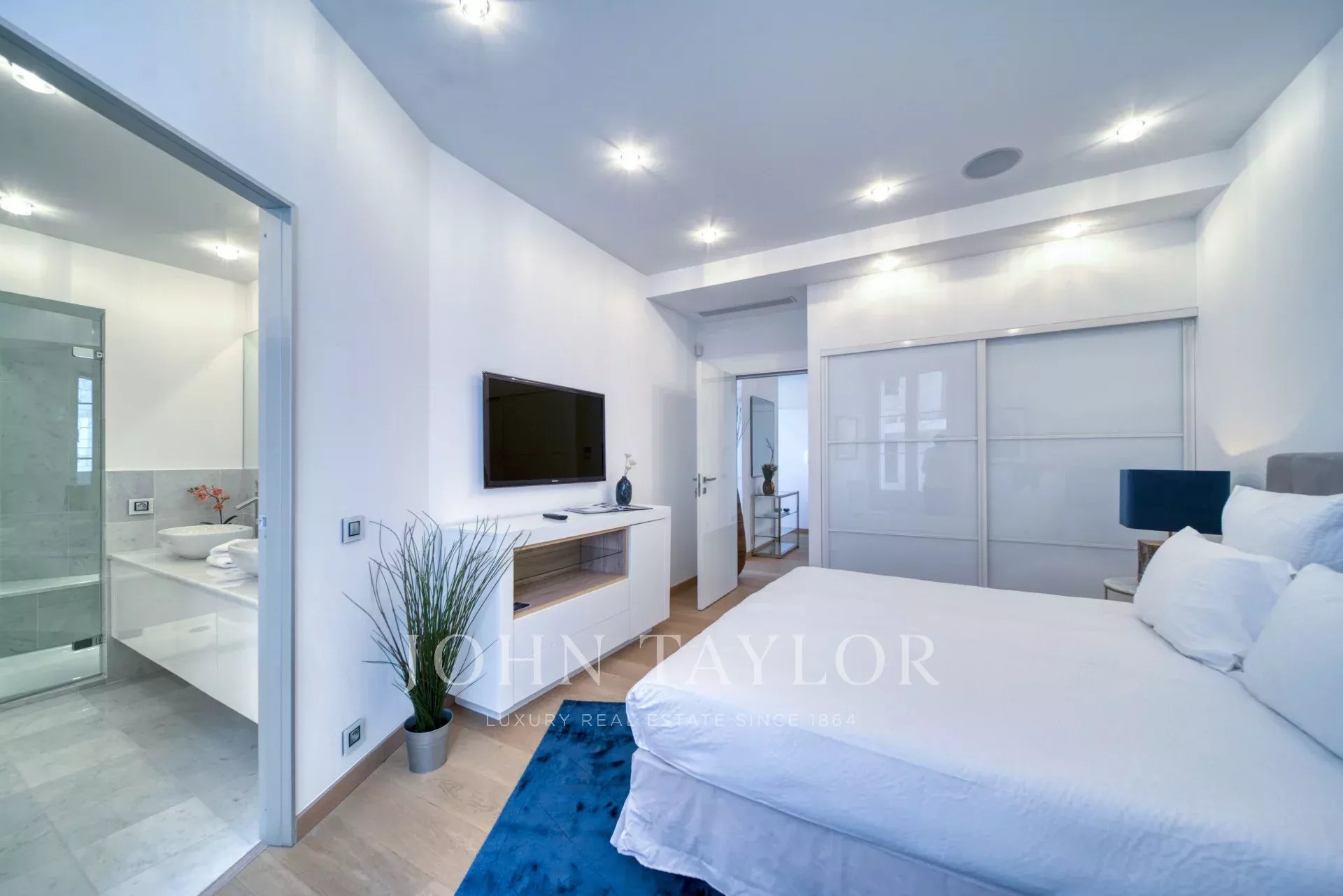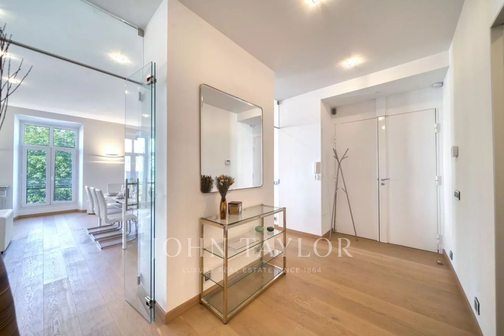 Ve 2. patře budovy střední třídy, naproti Palais des Festivals a plážím Croisette, v blízkosti ulice d'Antibes, trhu Forville a starého města Cannes "Le Suquet", kompletně zrekonstruovaný moderní klimatizovaný byt o obytné ploše 141 m2:
