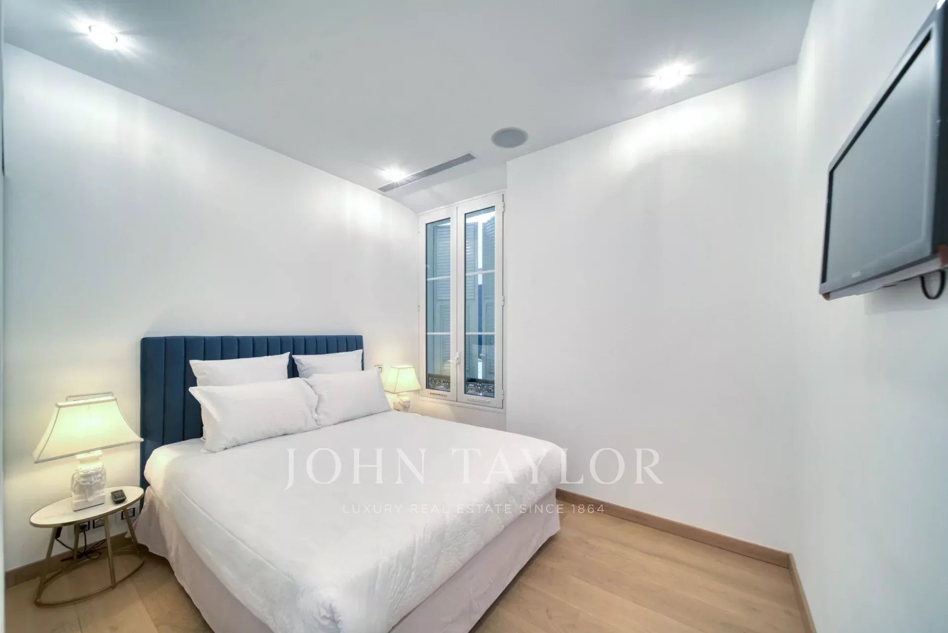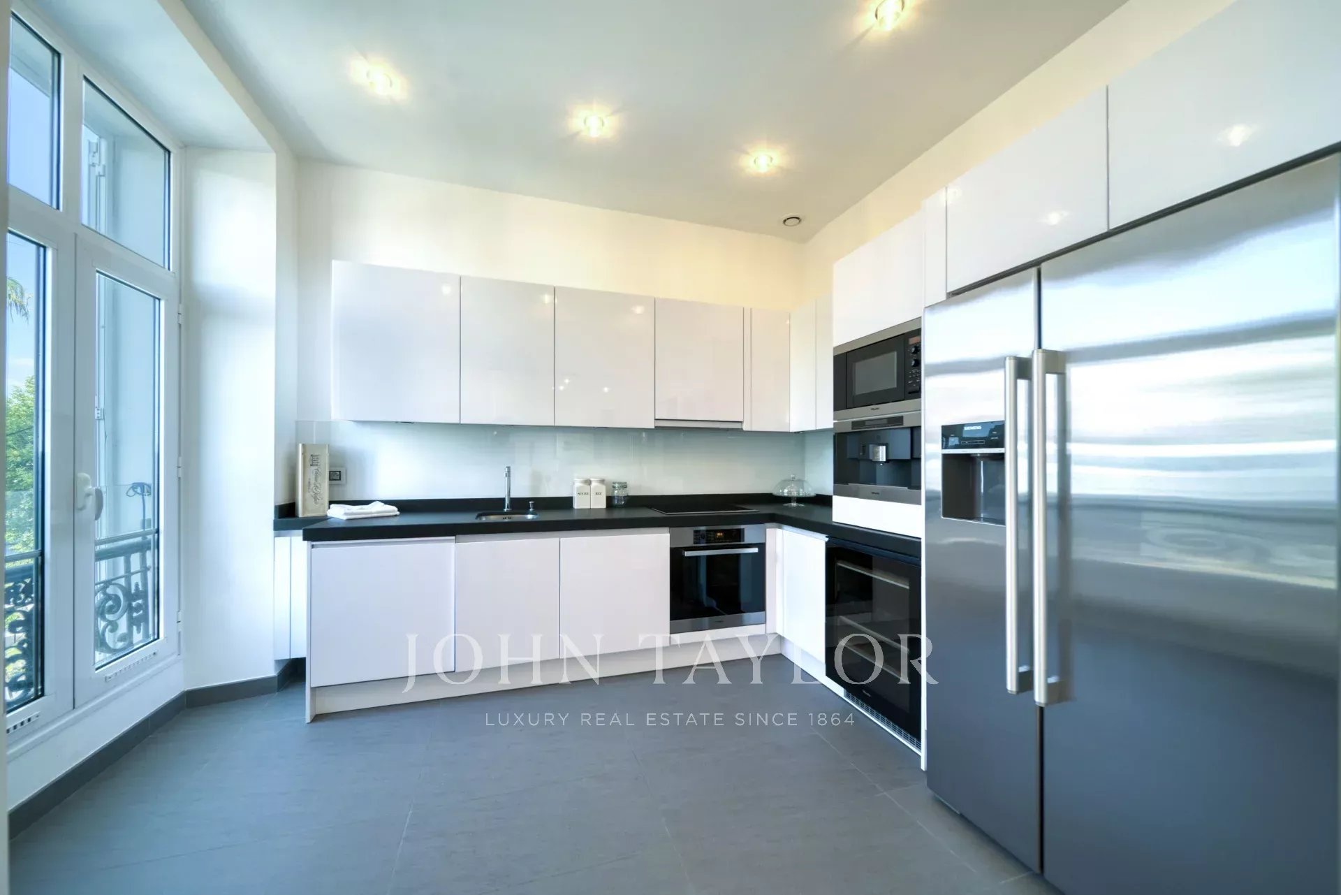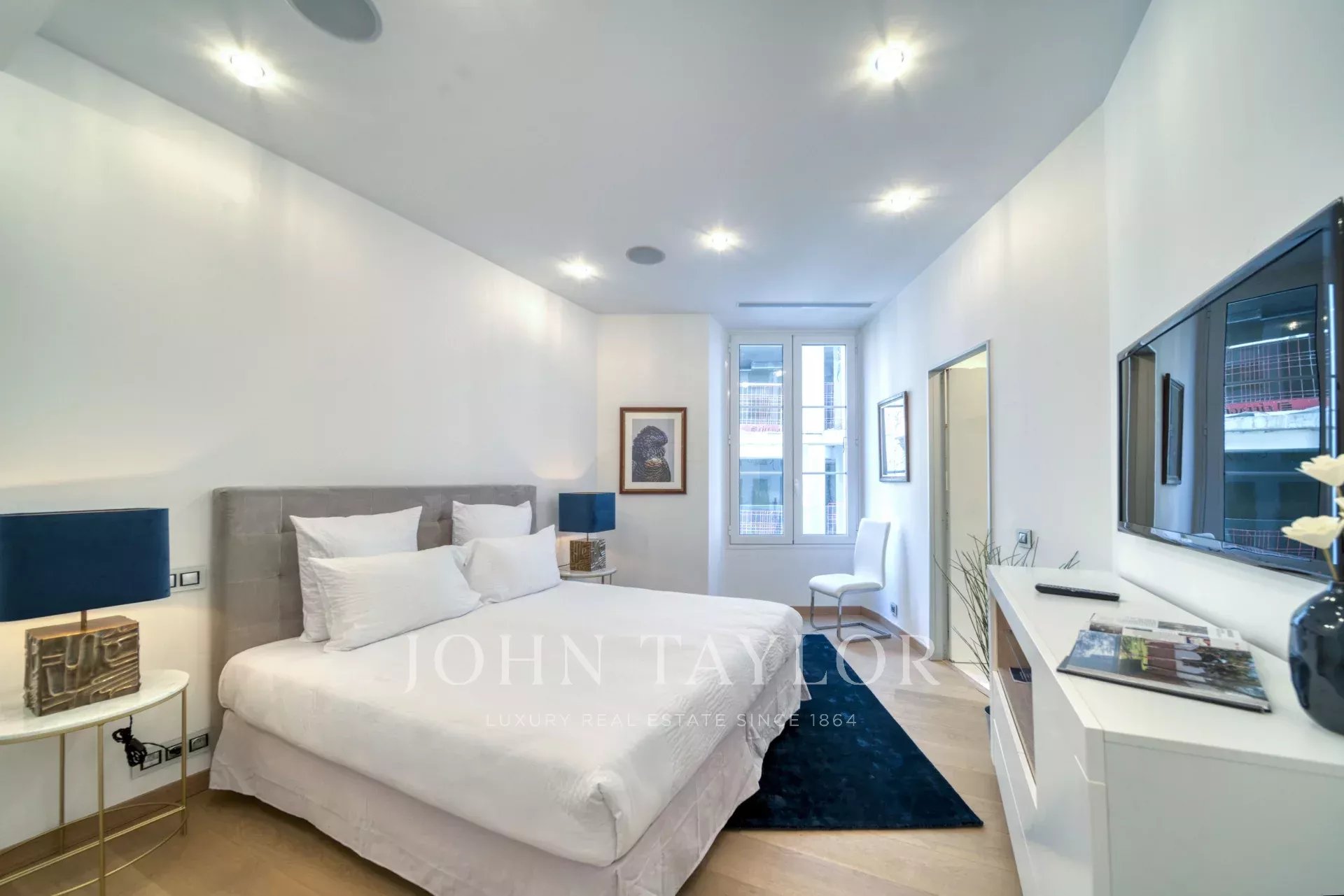 Ve 2. patře budovy střední třídy, naproti Palais des Festivals a plážím Croisette, v blízkosti ulice d'Antibes, trhu Forville a starého města Cannes "Le Suquet", kompletně zrekonstruovaný moderní klimatizovaný byt o obytné ploše 141 m2: