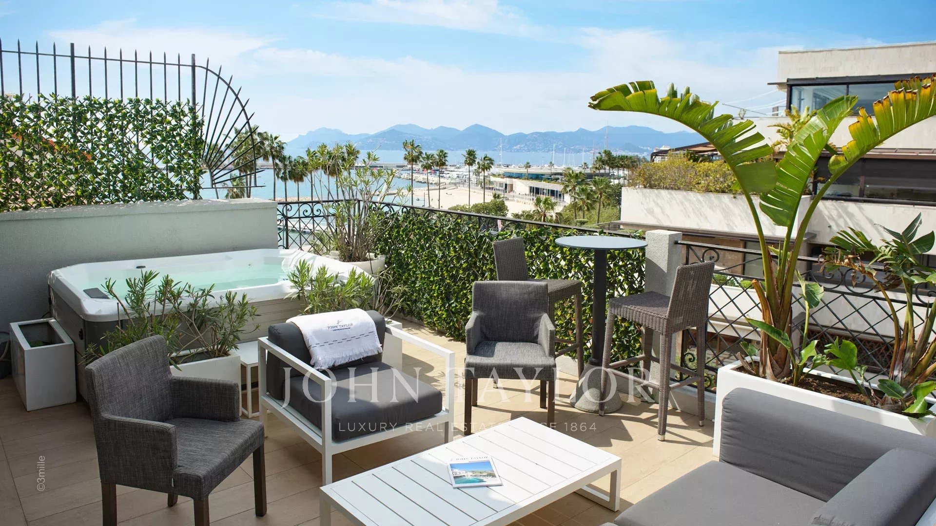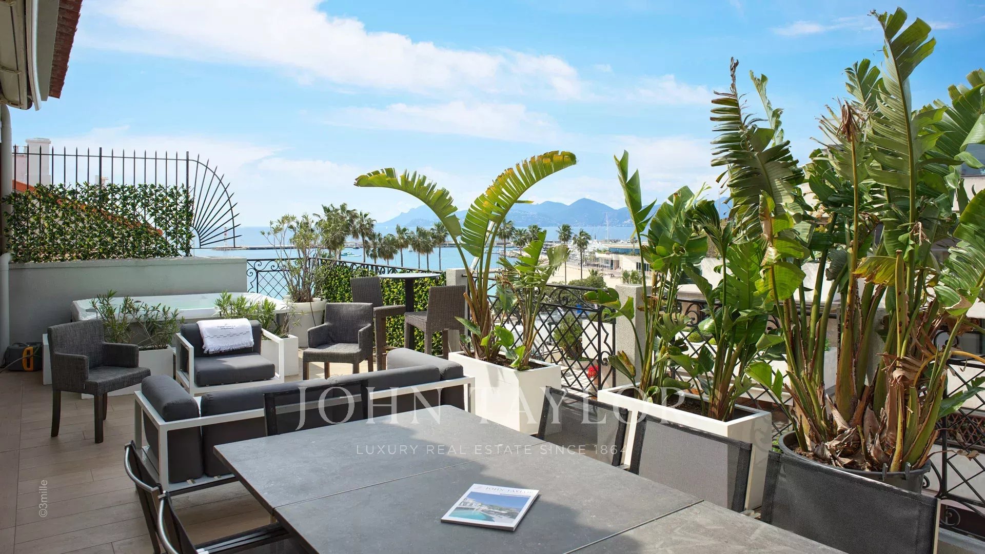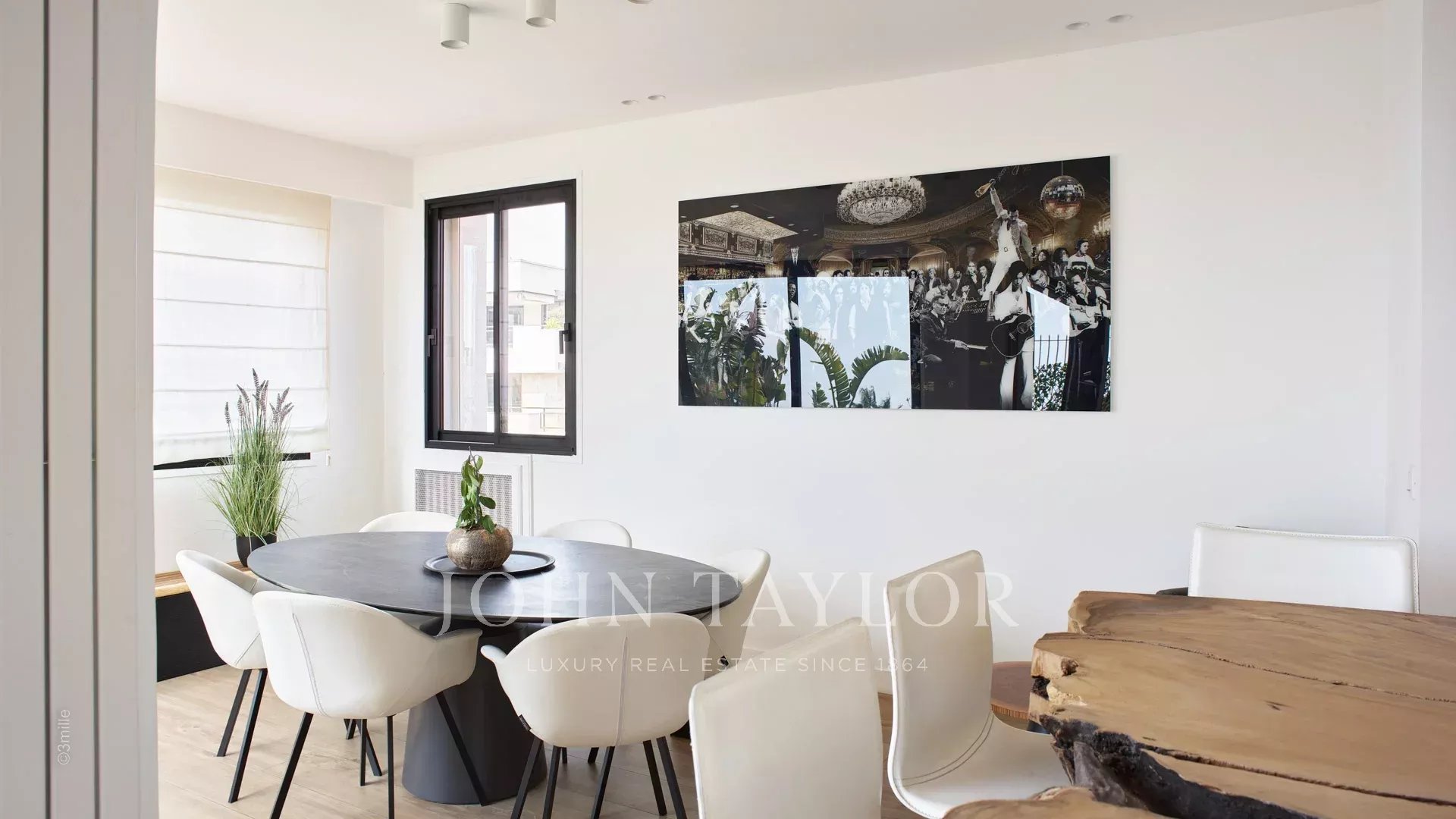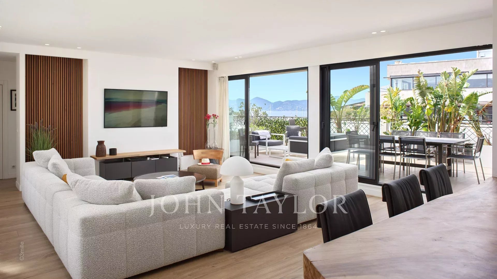 Tento vynikající moderní byt se nachází na klidném místě v blízkosti Palais des Festivals, nabízí 130 m2 obytné plochy, je plně klimatizovaný, kvalitně zrekonstruovaný, má dvě velké terasy a krásný výhled na moře.