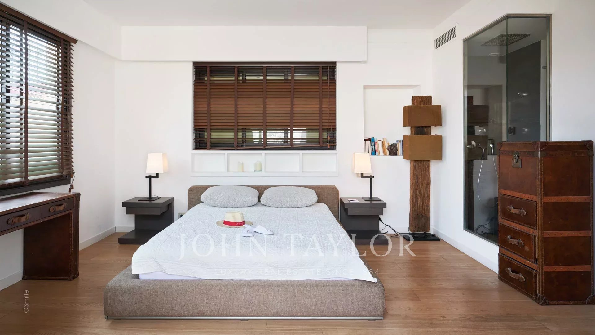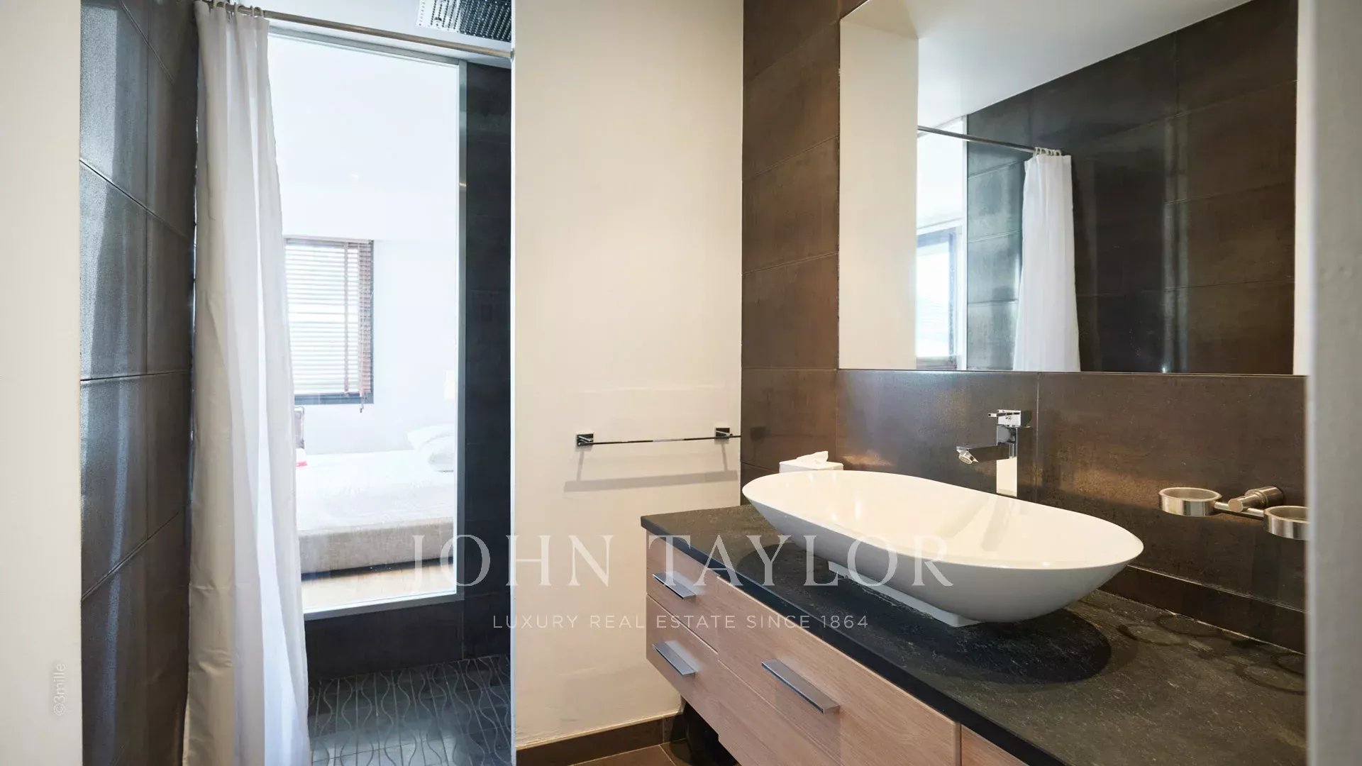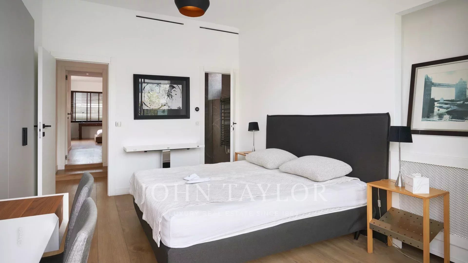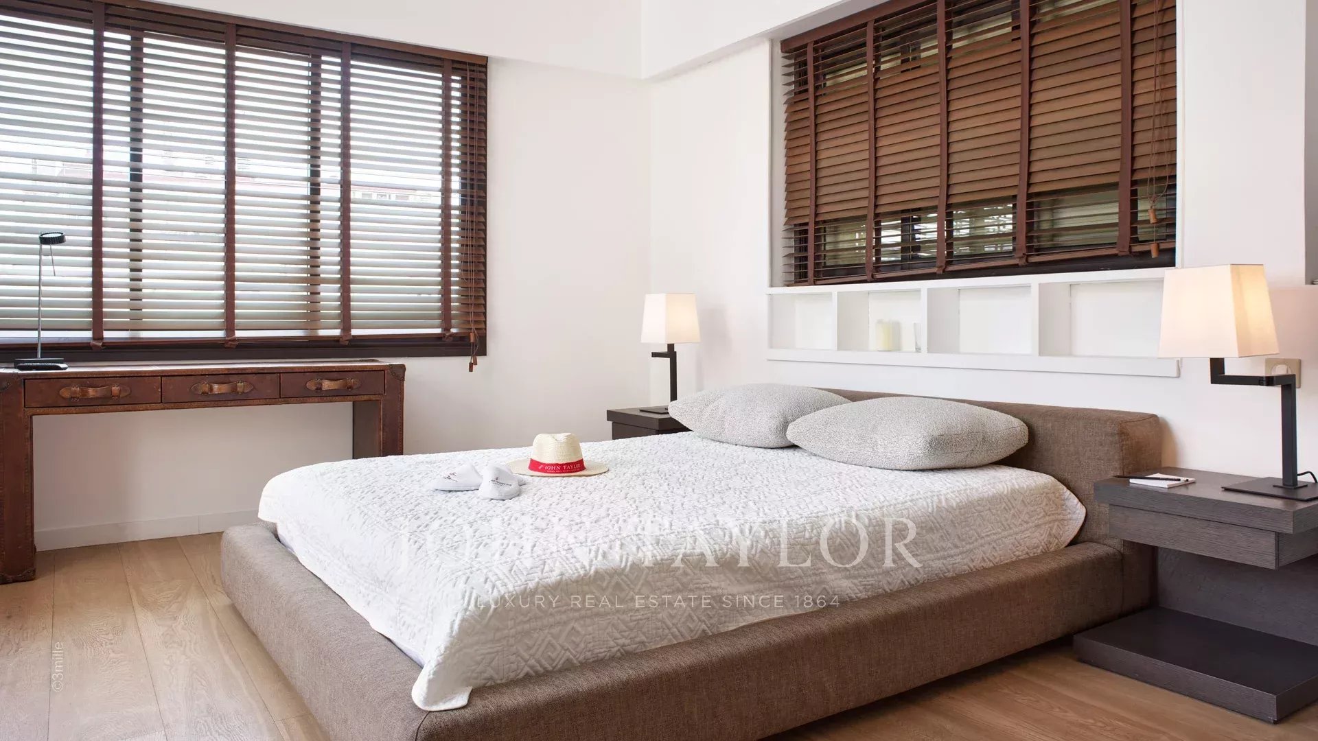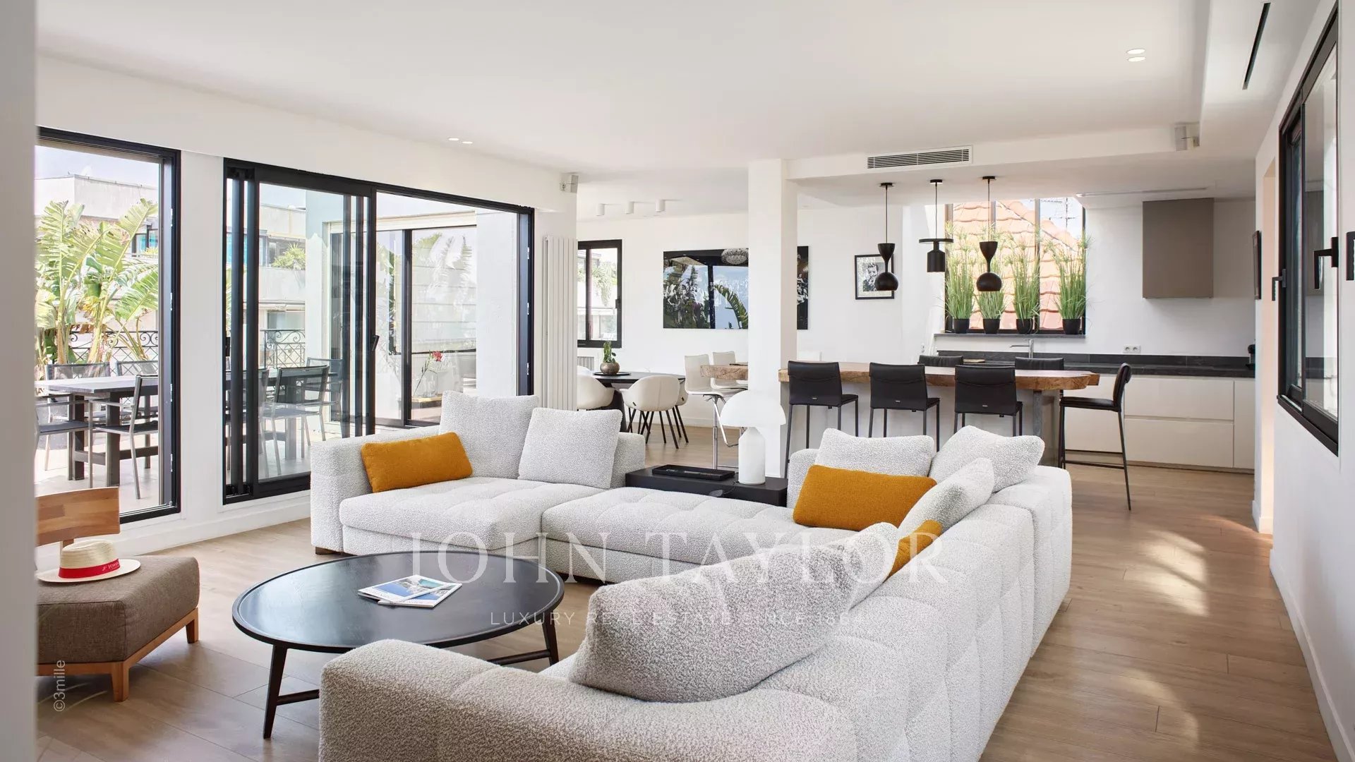 Tento vynikající moderní byt se nachází na klidném místě v blízkosti Palais des Festivals, nabízí 130 m2 obytné plochy, je plně klimatizovaný, kvalitně zrekonstruovaný, má dvě velké terasy a krásný výhled na moře.
