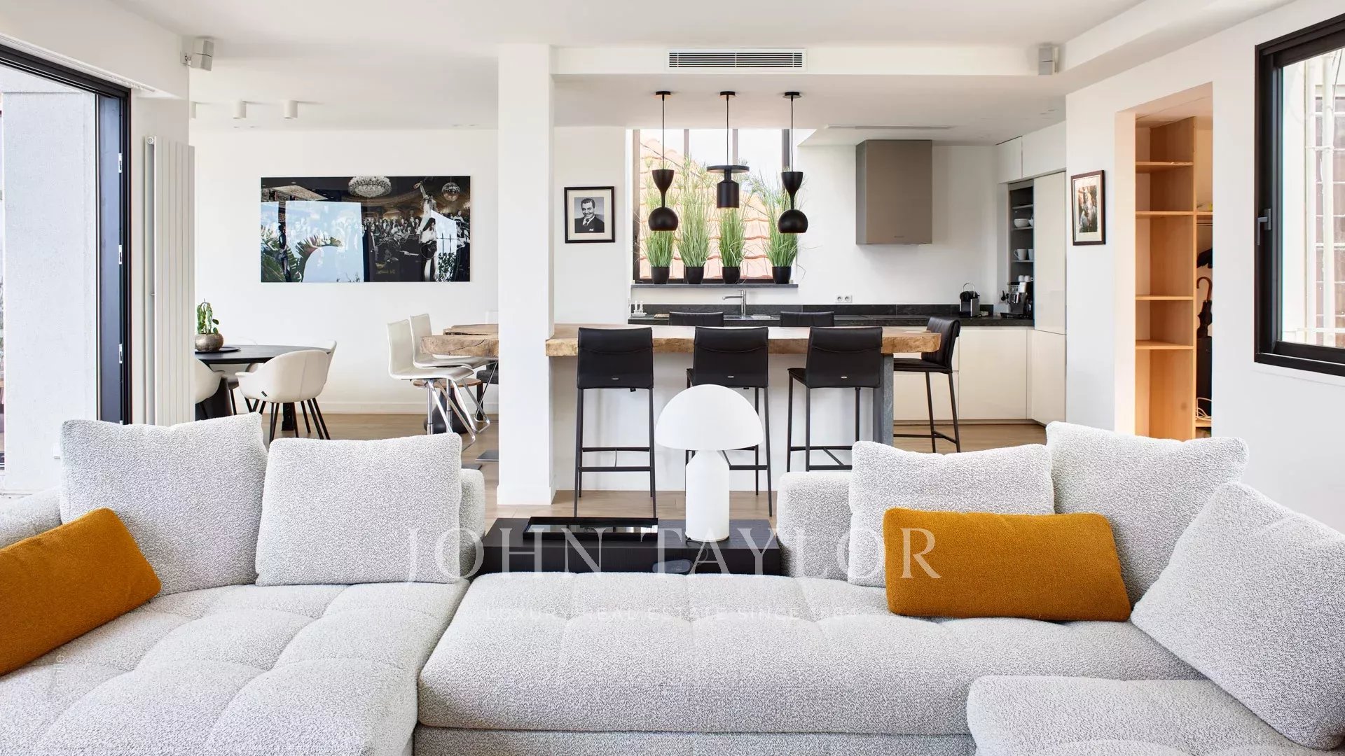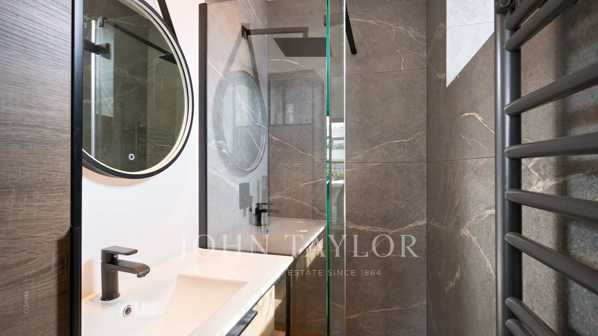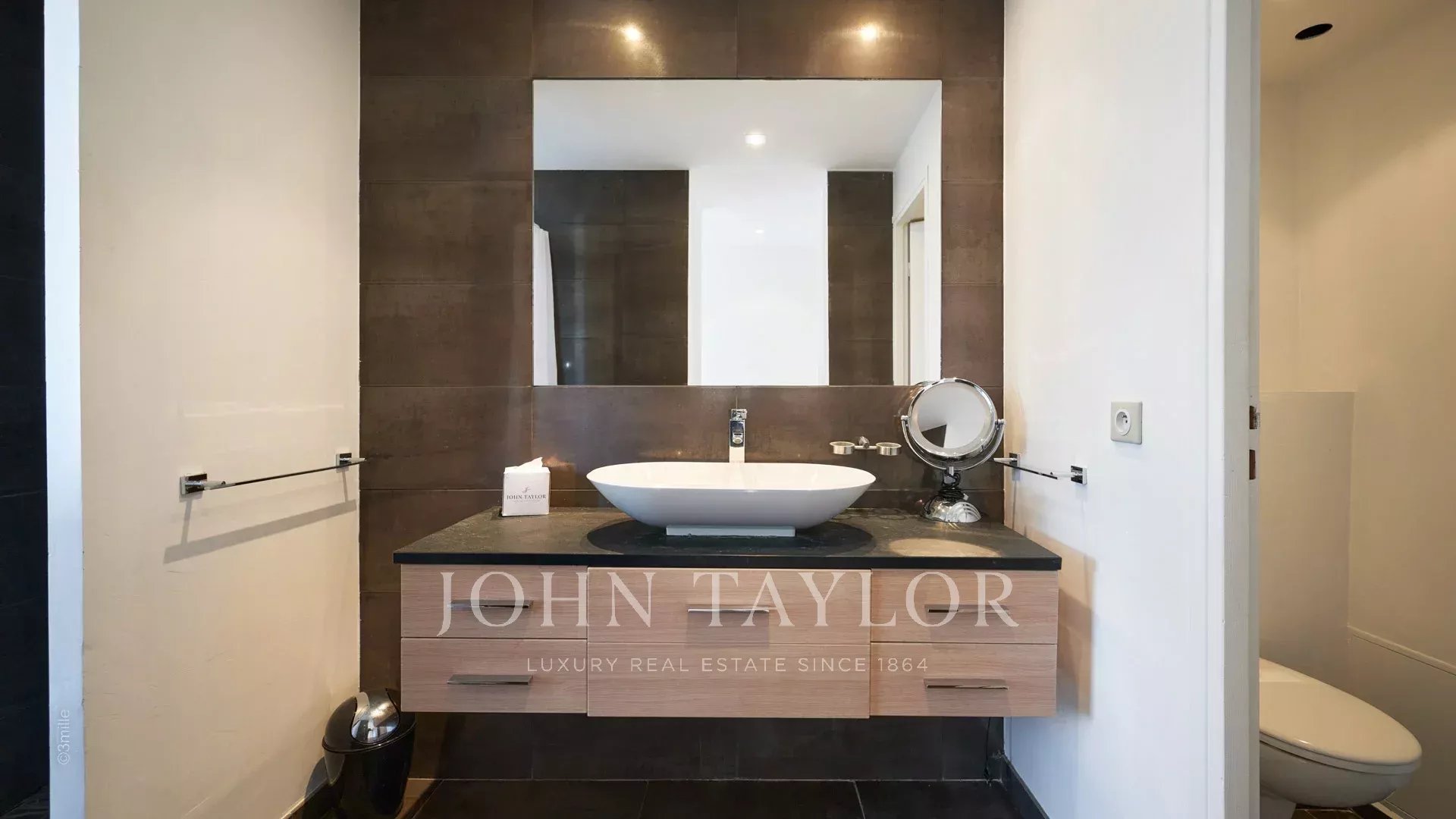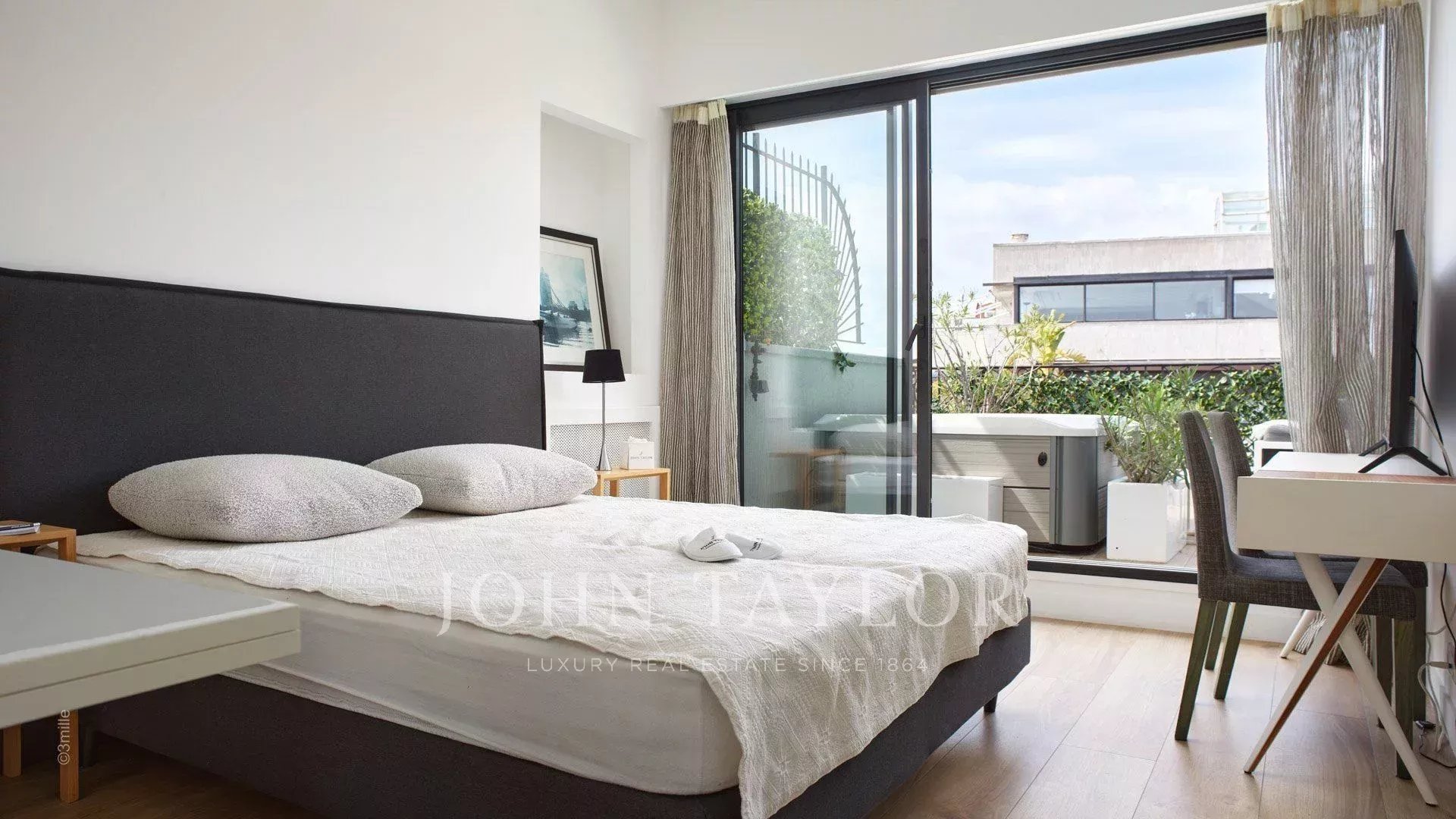 Tento vynikající moderní byt se nachází na klidném místě v blízkosti Palais des Festivals, nabízí 130 m2 obytné plochy, je plně klimatizovaný, kvalitně zrekonstruovaný, má dvě velké terasy a krásný výhled na moře.