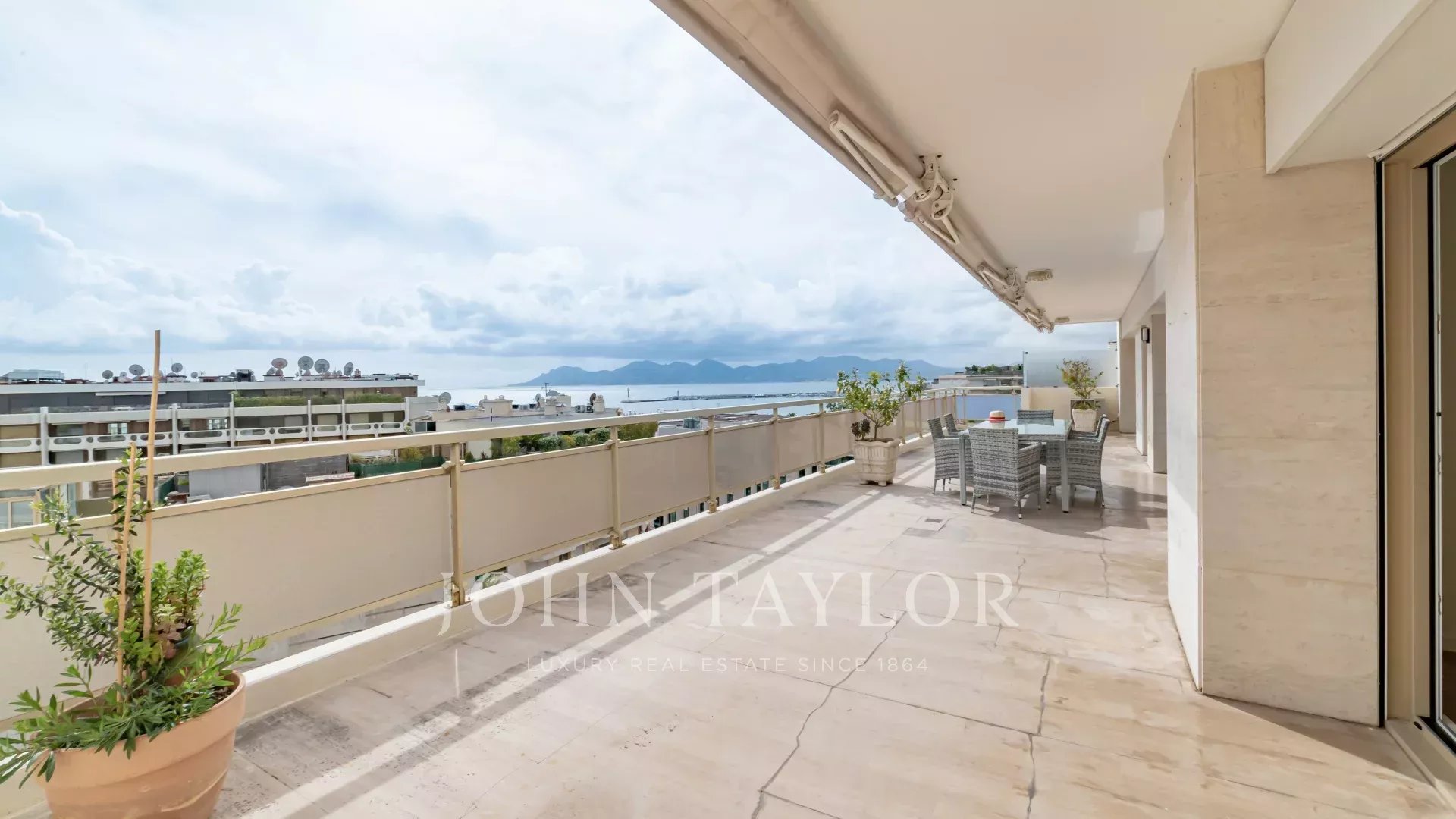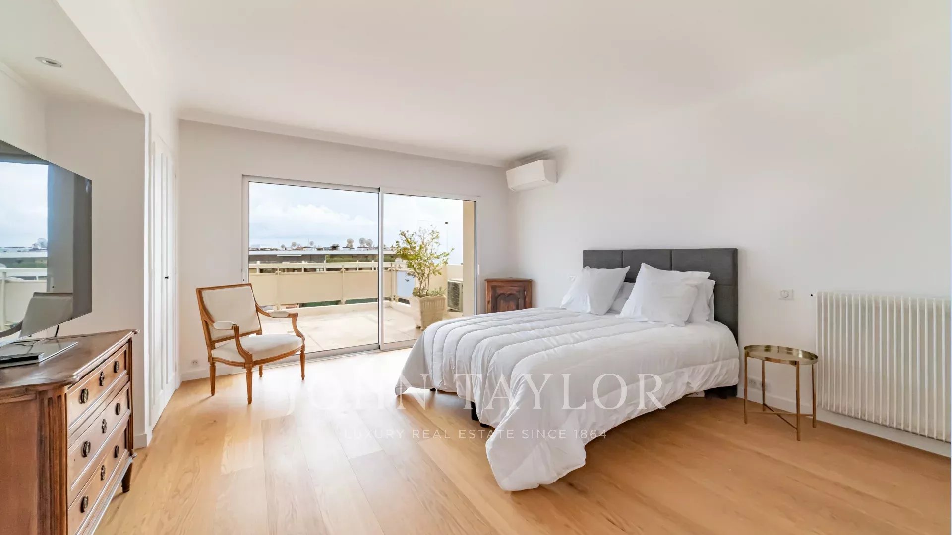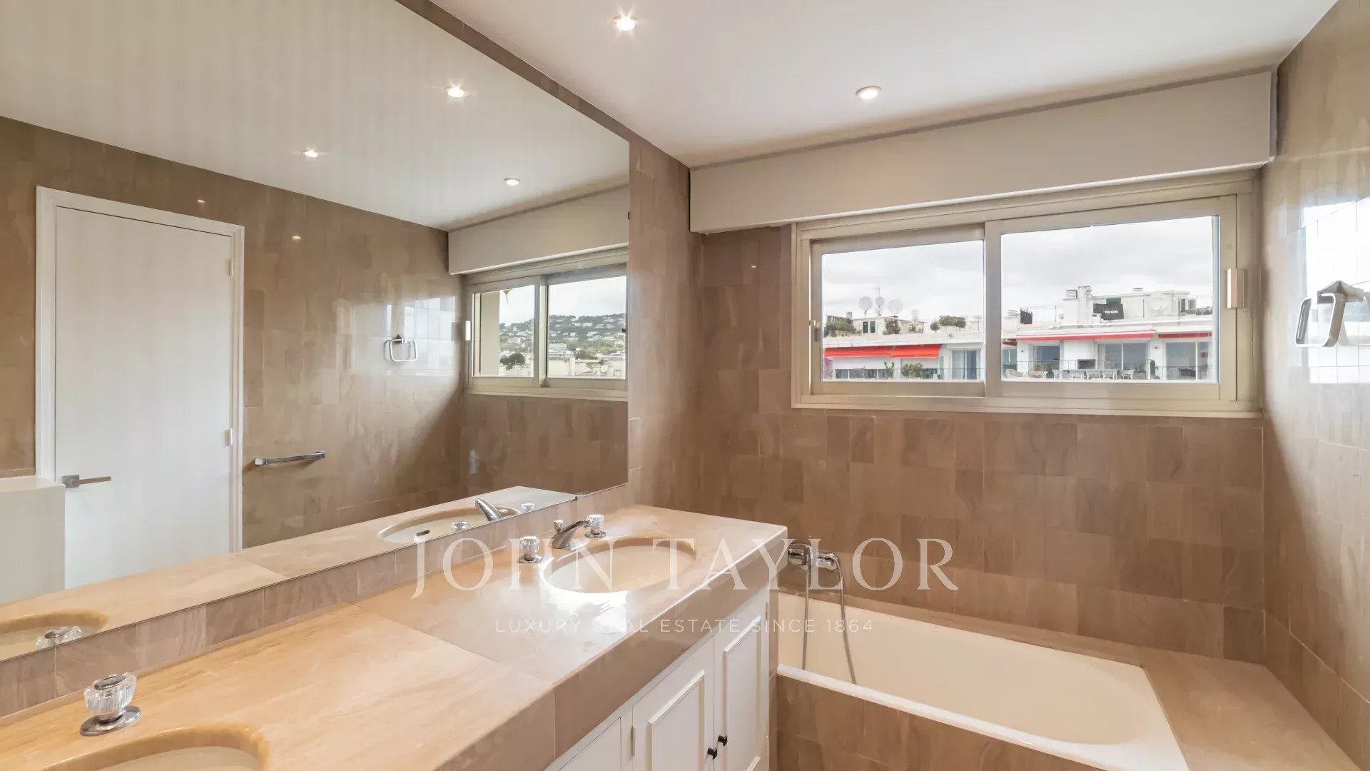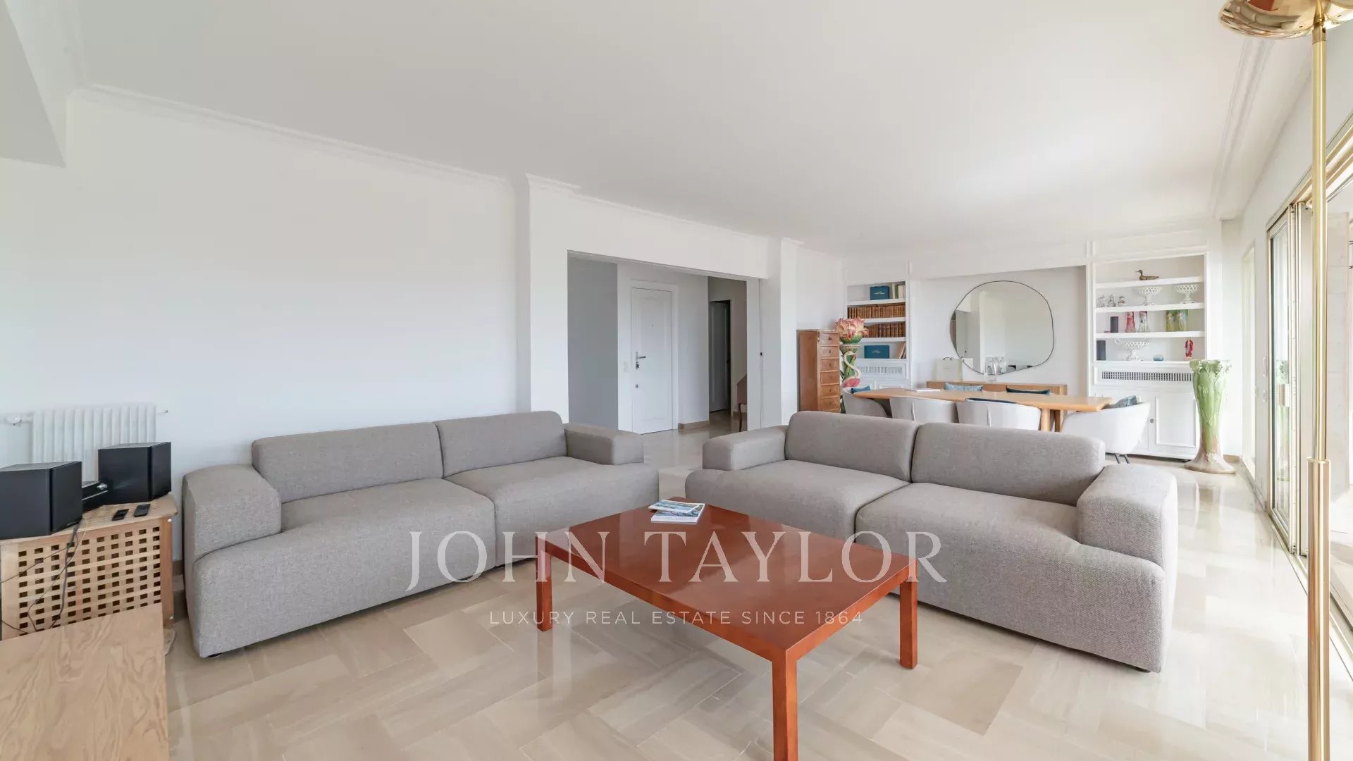 Tento jižně orientovaný, plně klimatizovaný byt o rozloze 140 m2 se nachází v nejvyšším (8.) patře rezidence v centru města, jen několik minut chůze od pláží a Palais des Festivals.