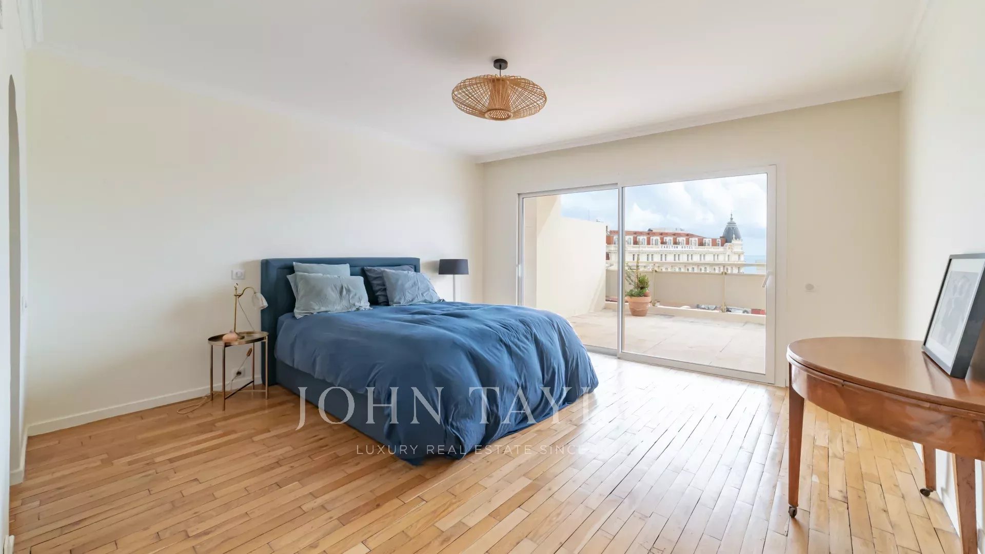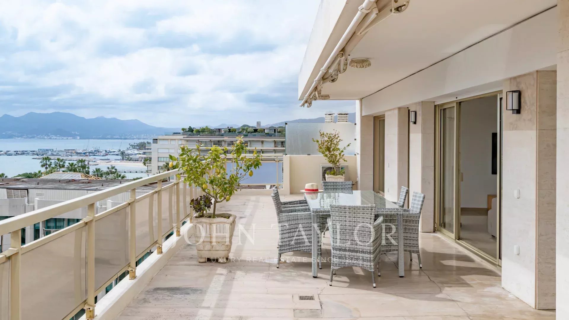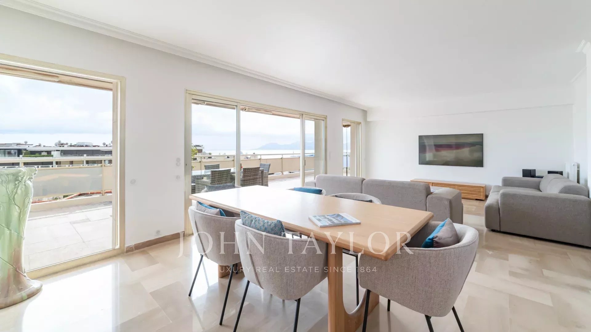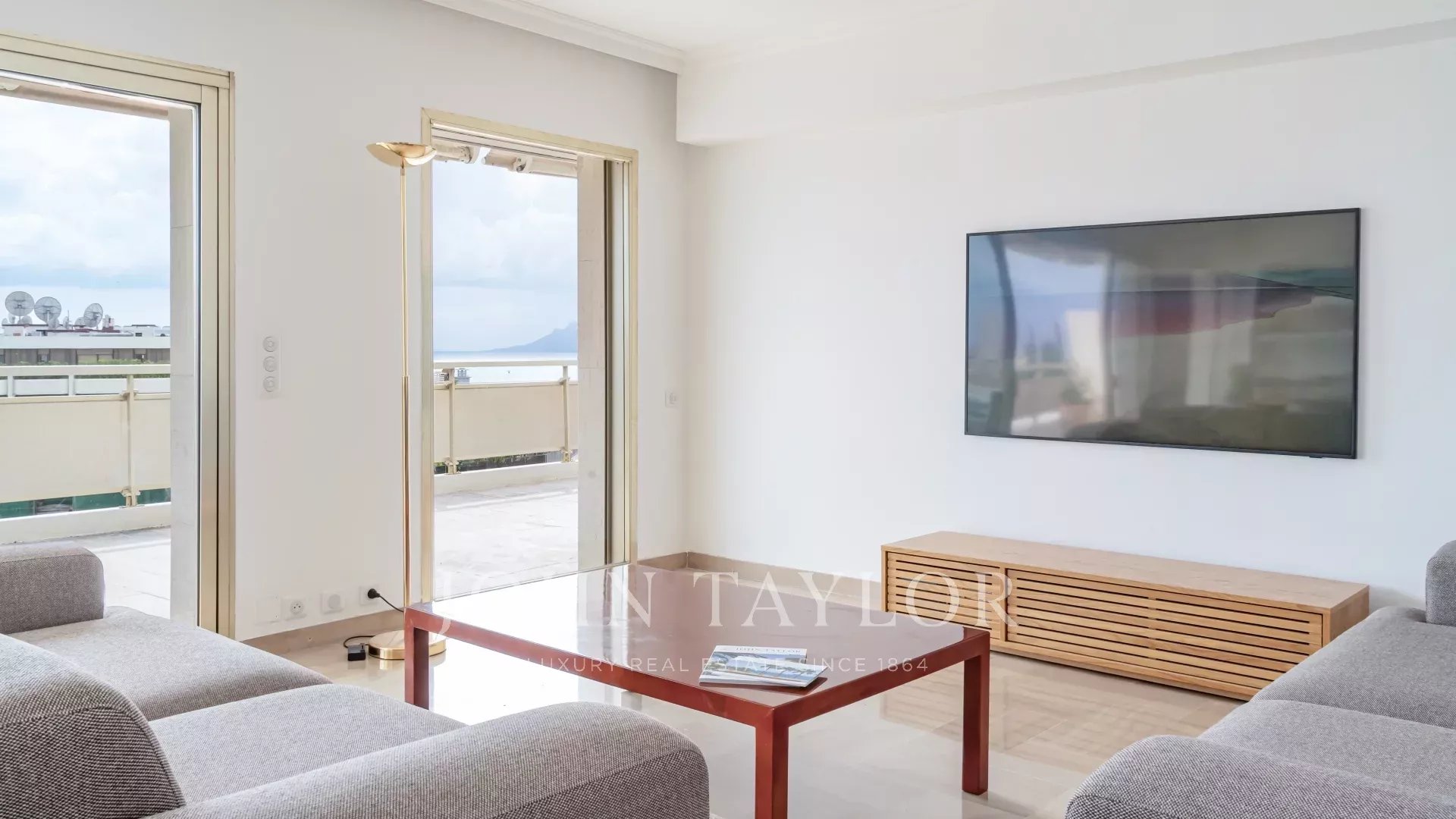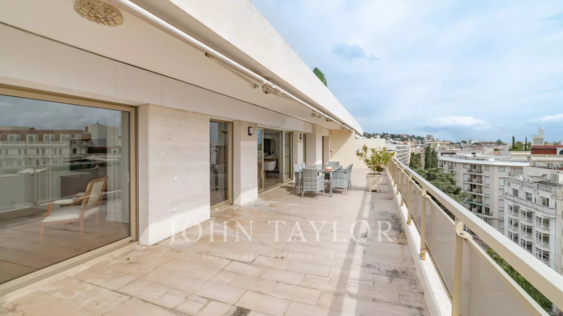 Tento jižně orientovaný, plně klimatizovaný byt o rozloze 140 m2 se nachází v nejvyšším (8.) patře rezidence v centru města, jen několik minut chůze od pláží a Palais des Festivals.