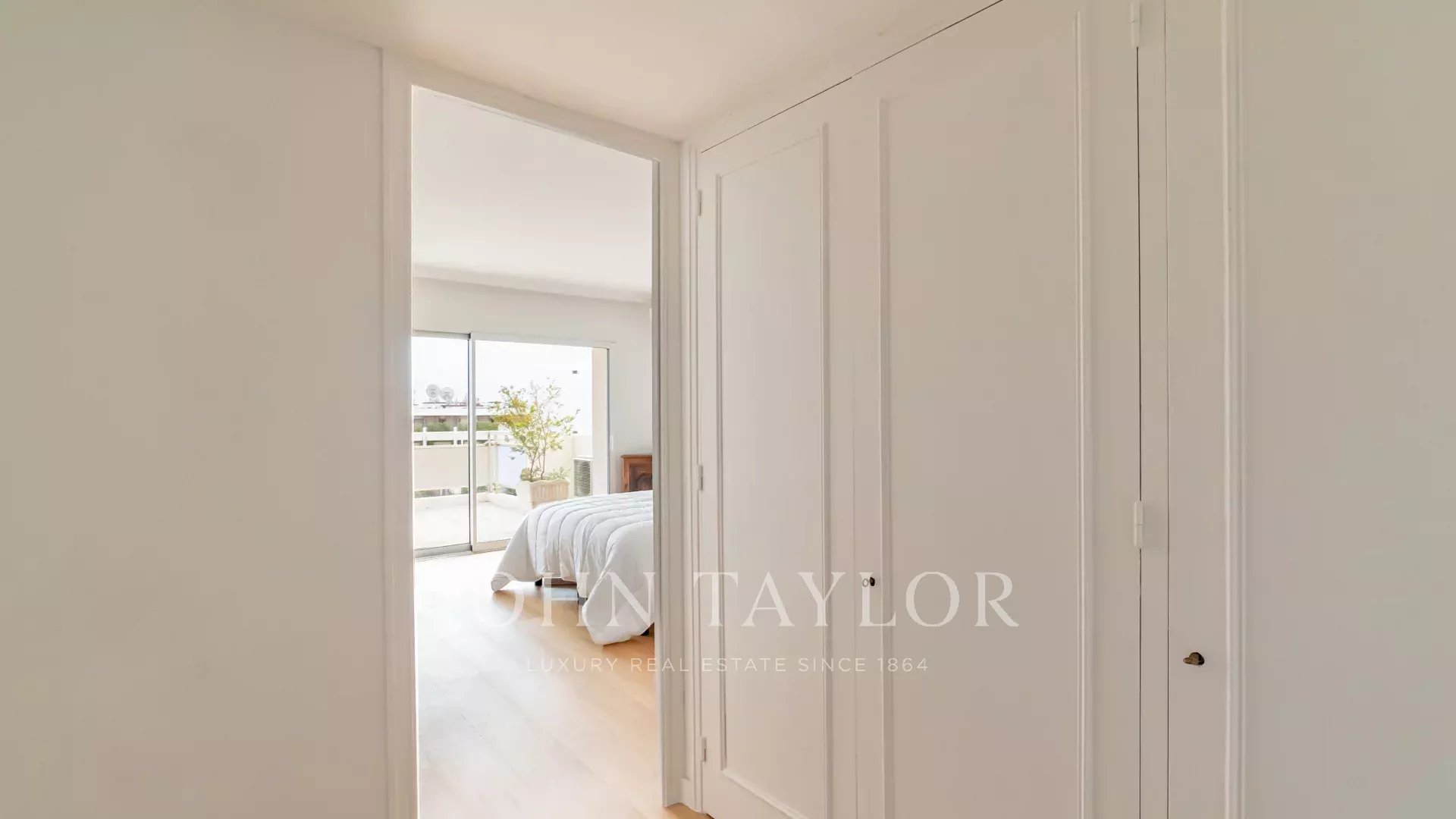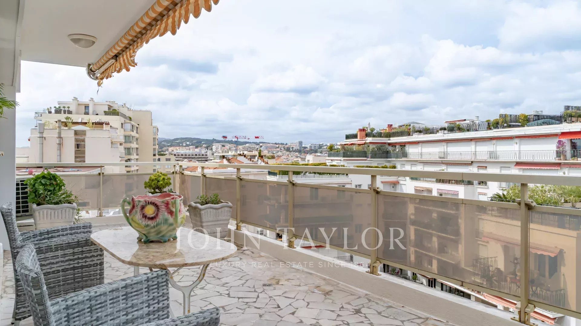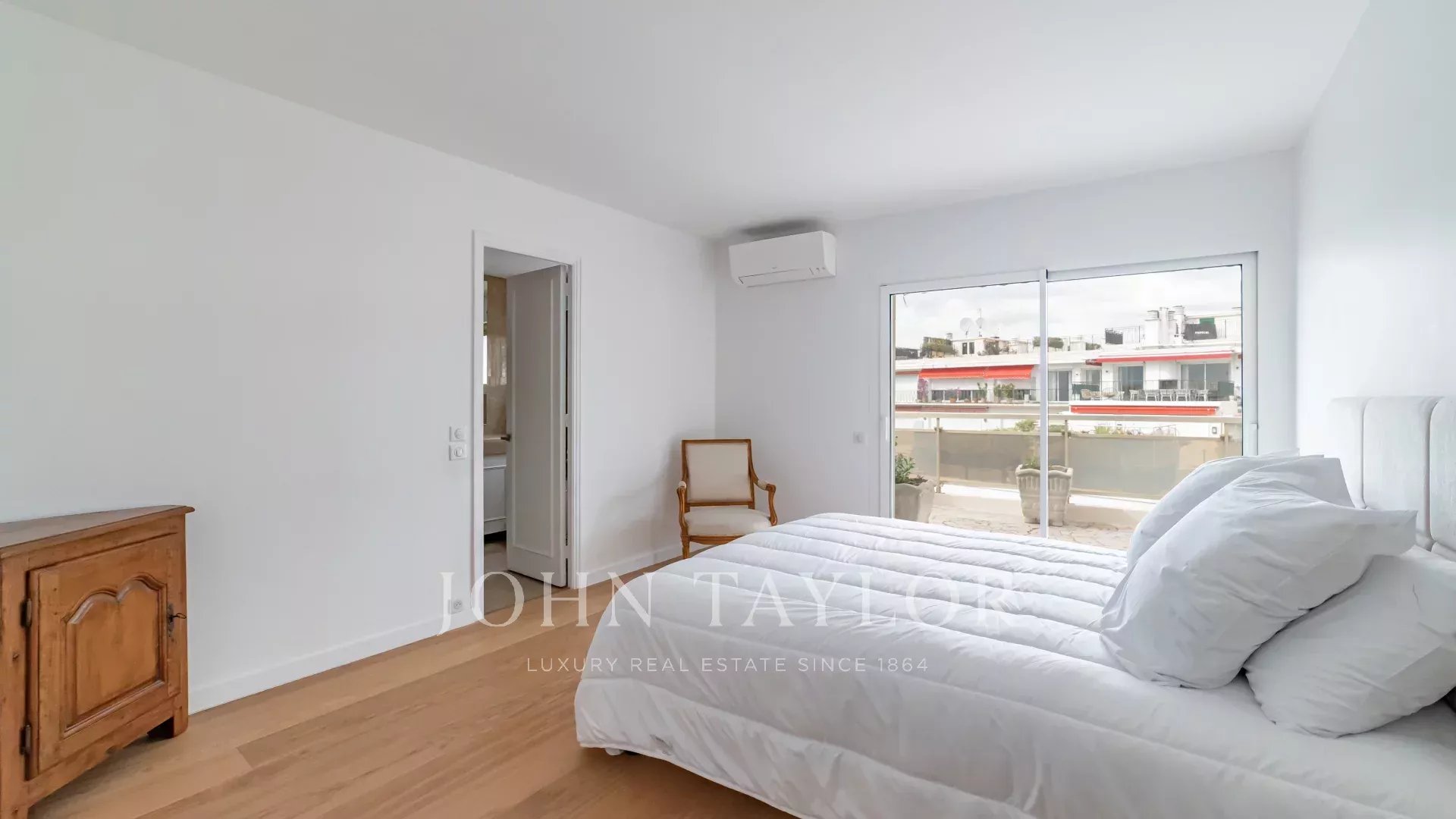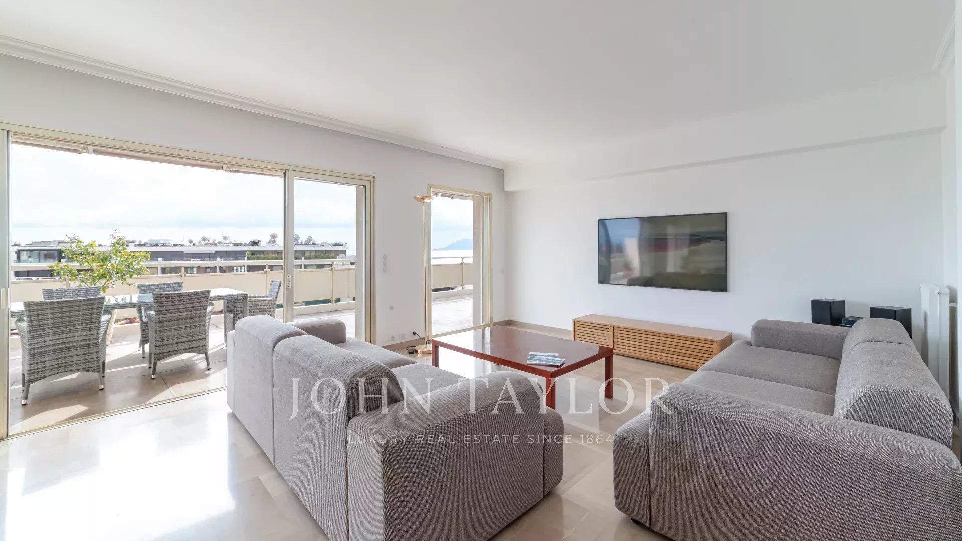 Tento jižně orientovaný, plně klimatizovaný byt o rozloze 140 m2 se nachází v nejvyšším (8.) patře rezidence v centru města, jen několik minut chůze od pláží a Palais des Festivals.