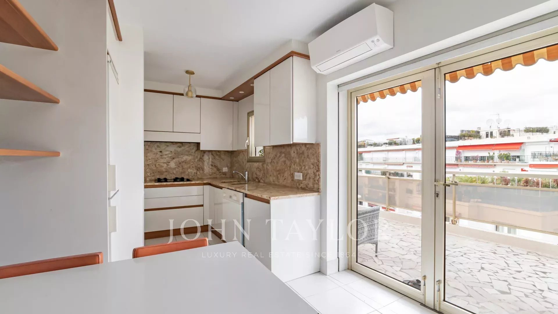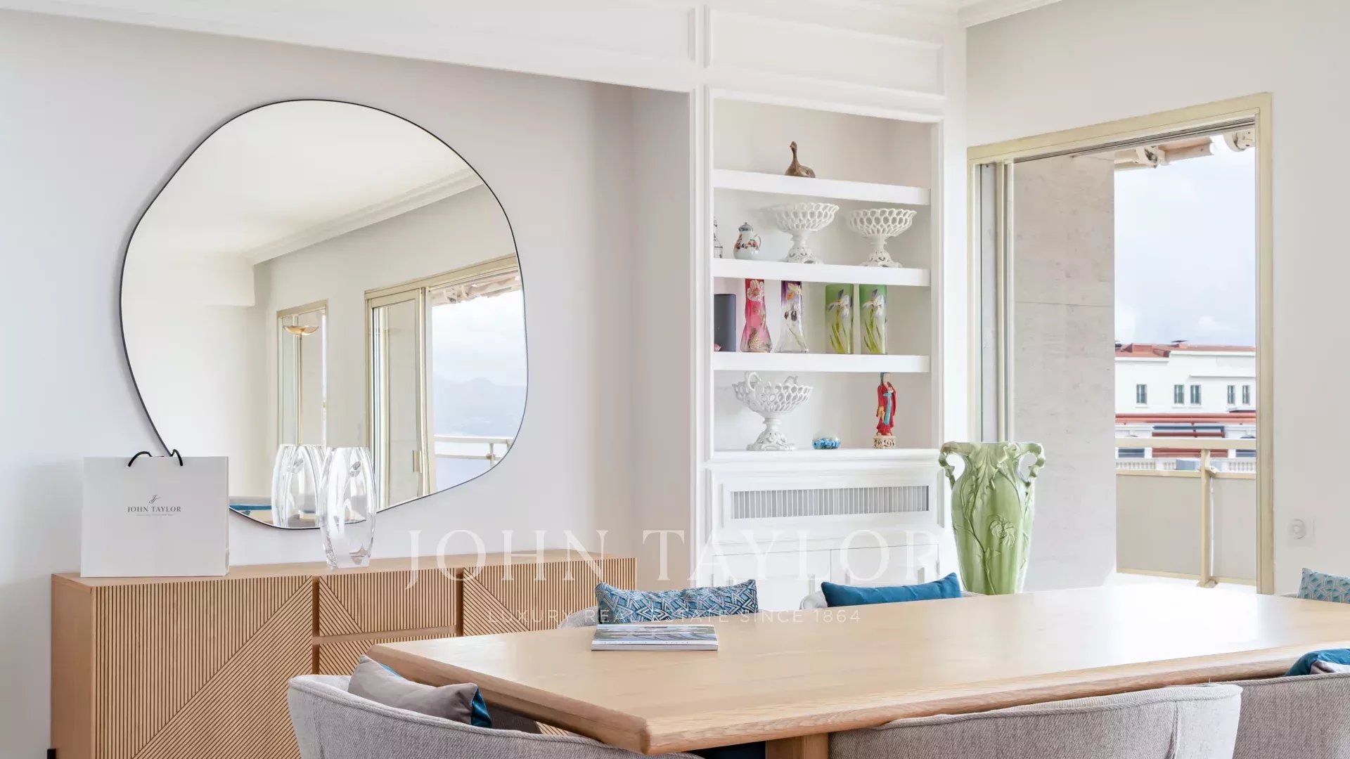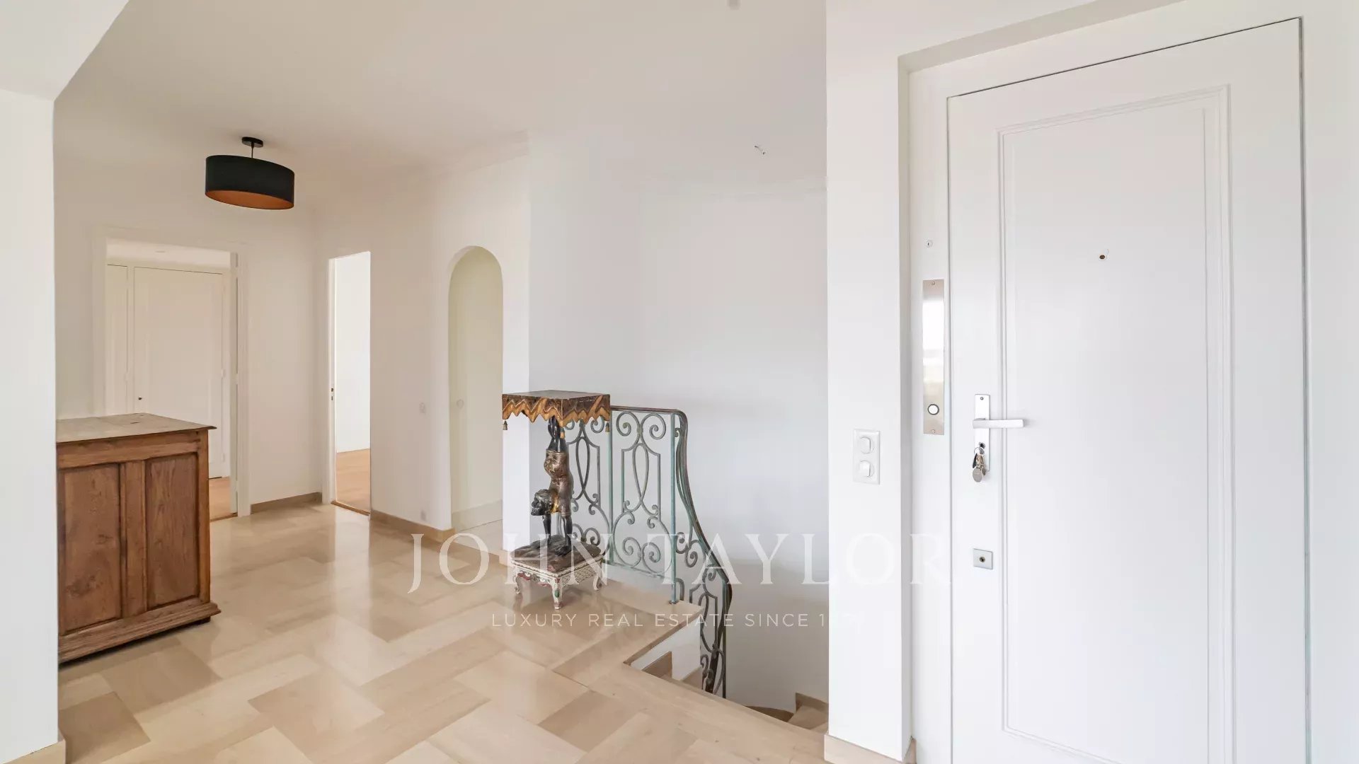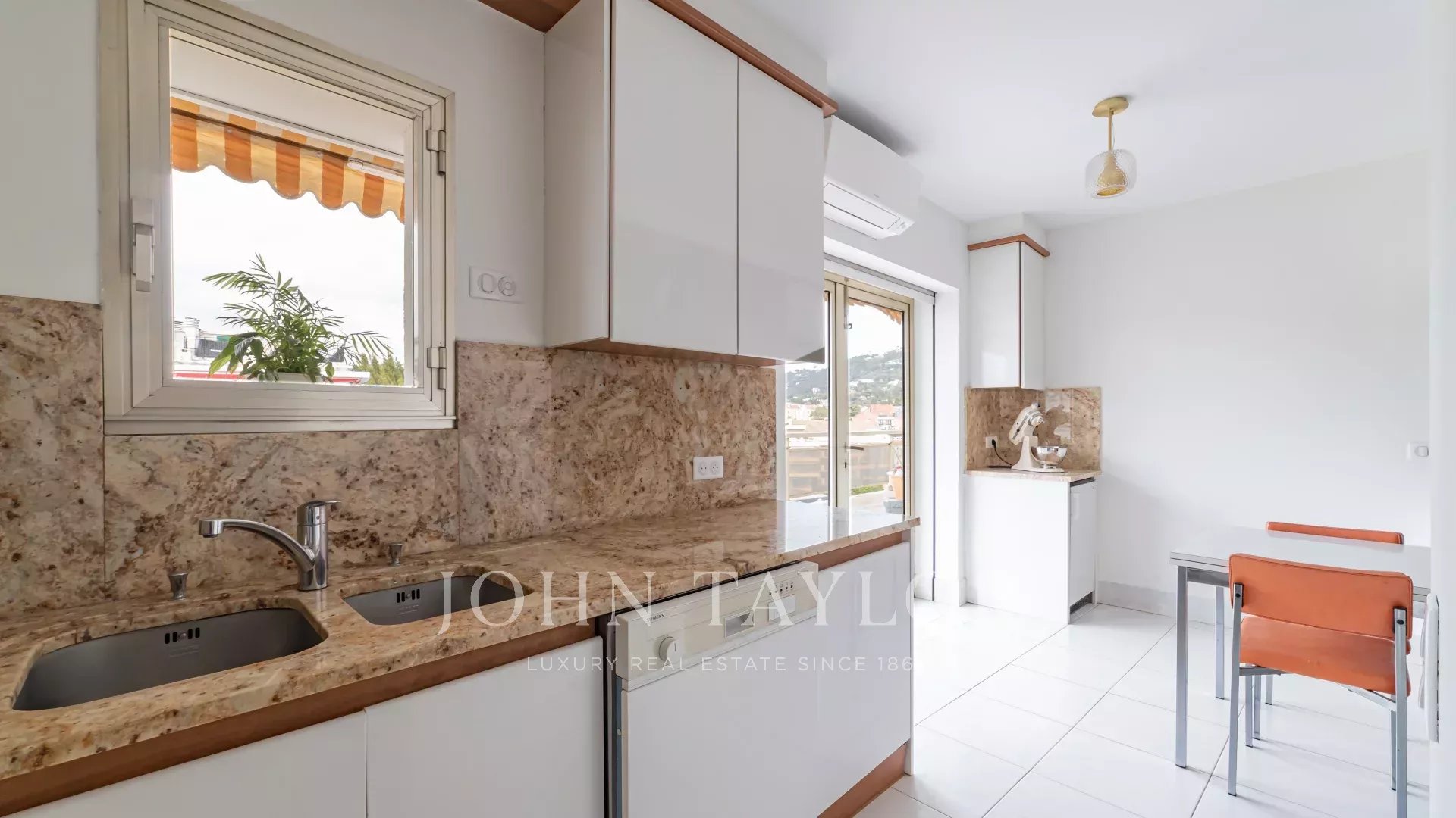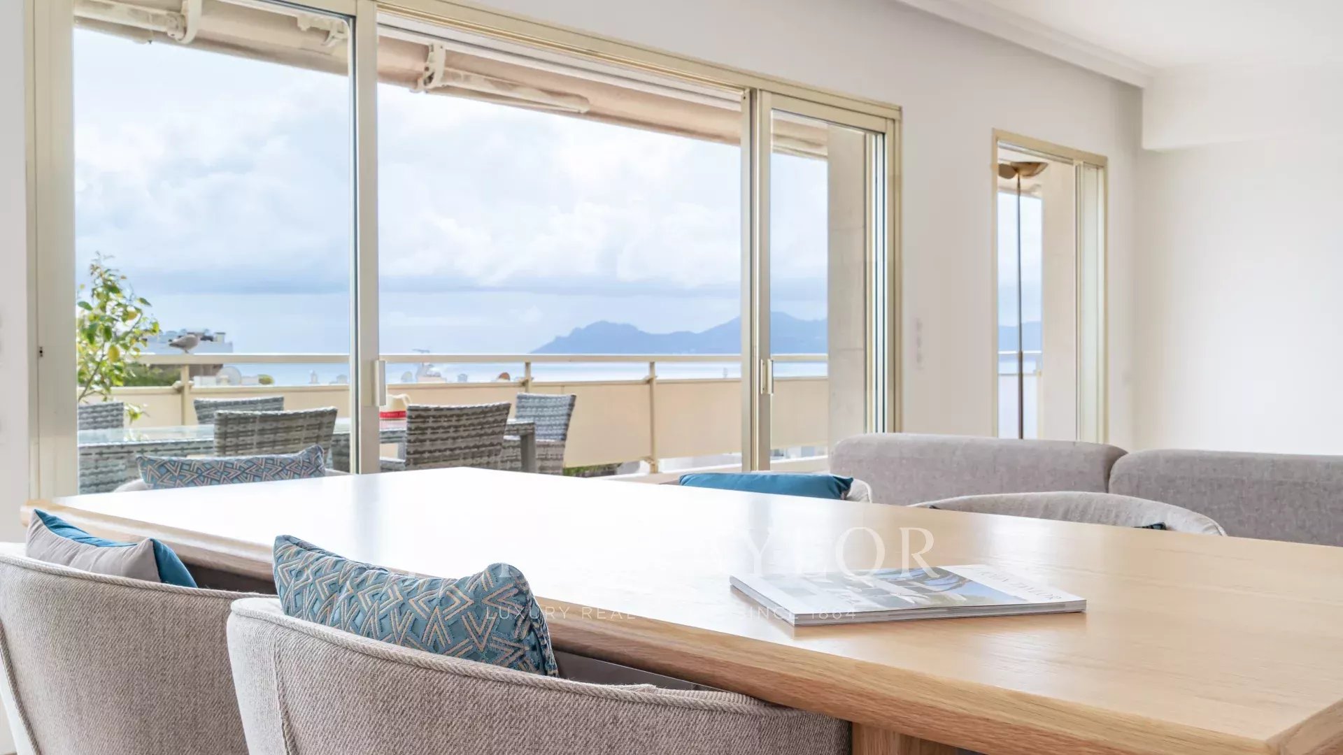 Tento jižně orientovaný, plně klimatizovaný byt o rozloze 140 m2 se nachází v nejvyšším (8.) patře rezidence v centru města, jen několik minut chůze od pláží a Palais des Festivals.