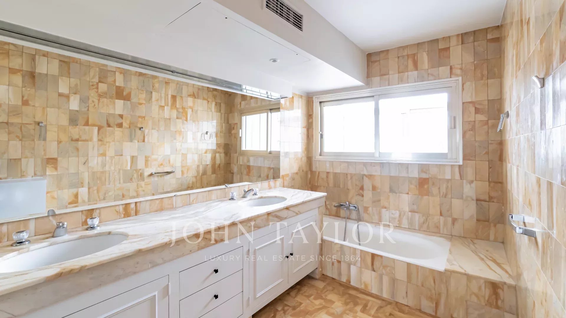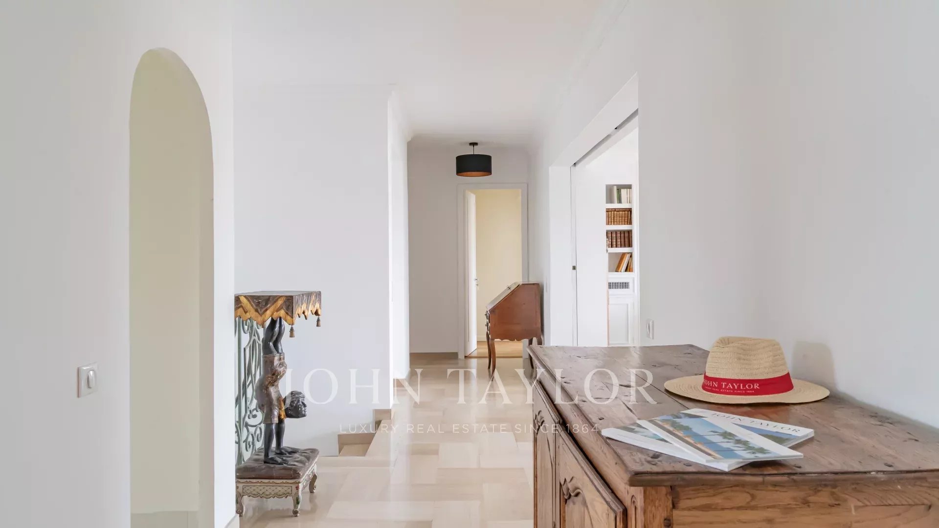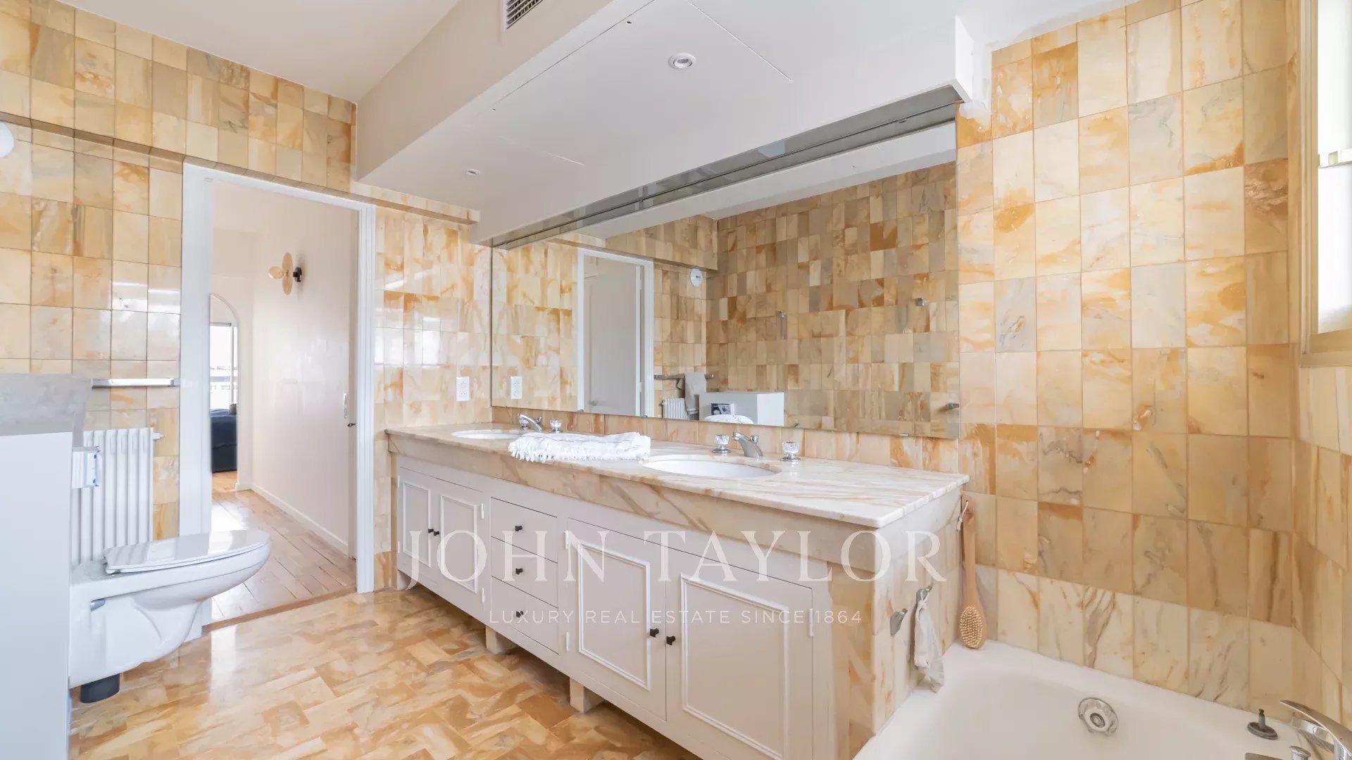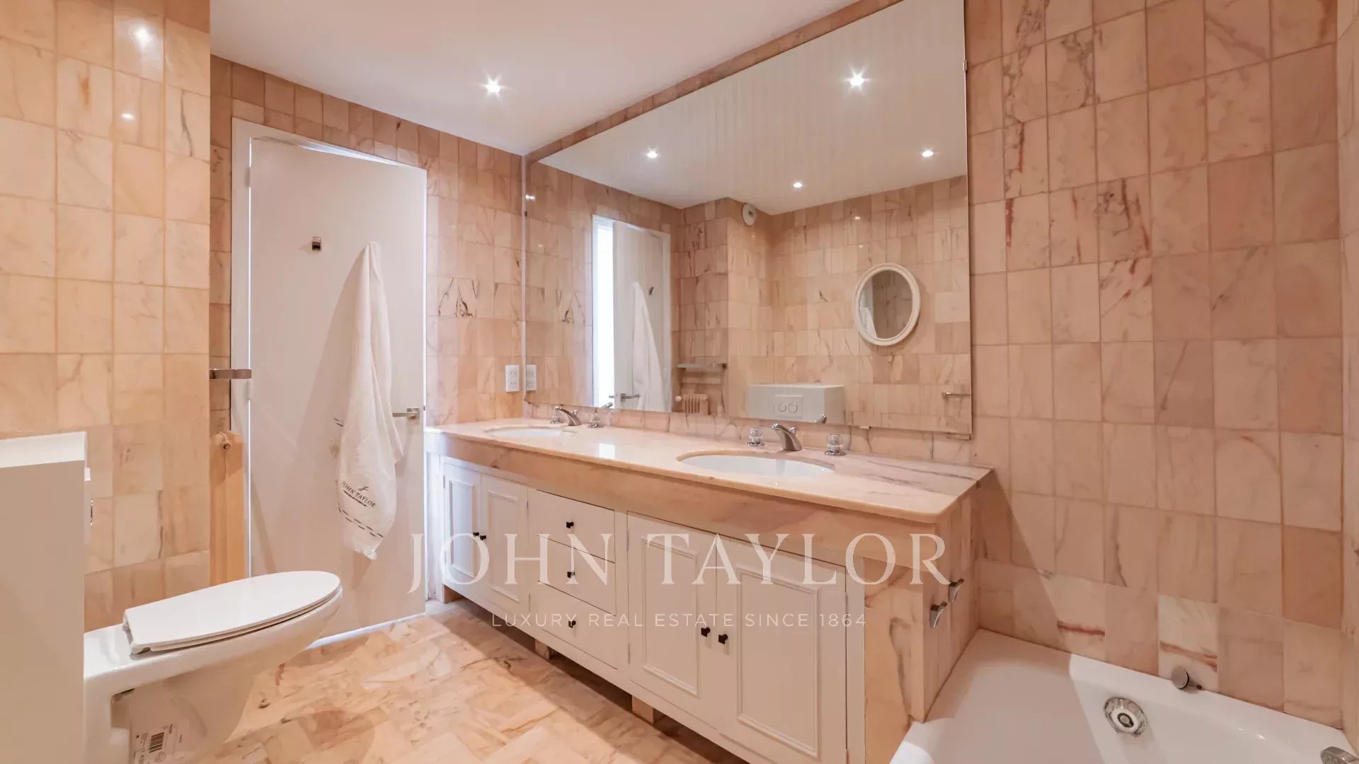 Tento jižně orientovaný, plně klimatizovaný byt o rozloze 140 m2 se nachází v nejvyšším (8.) patře rezidence v centru města, jen několik minut chůze od pláží a Palais des Festivals.