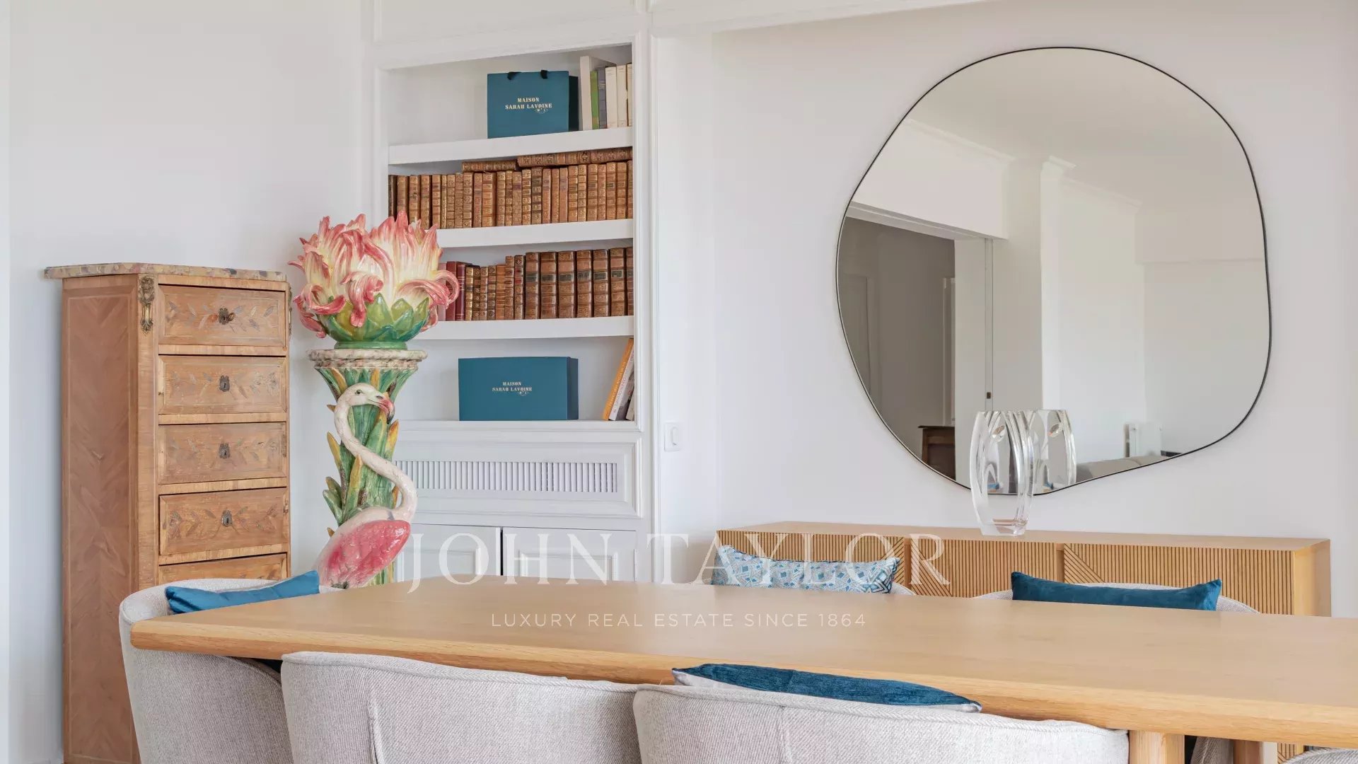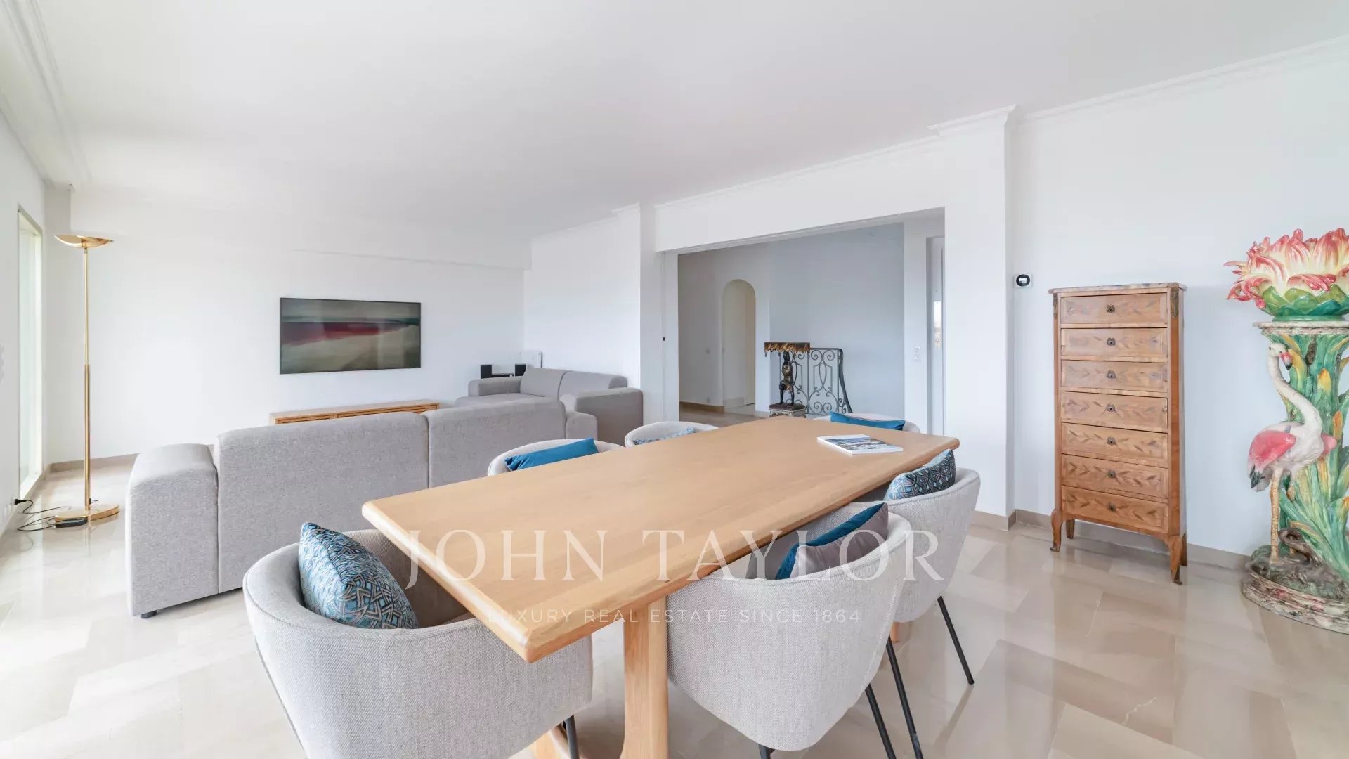 krásný přijímací pokoj s obývacím pokojem a jídelnou, z něhož se vychází na terasu o rozloze 60 m² orientovanou na jih.