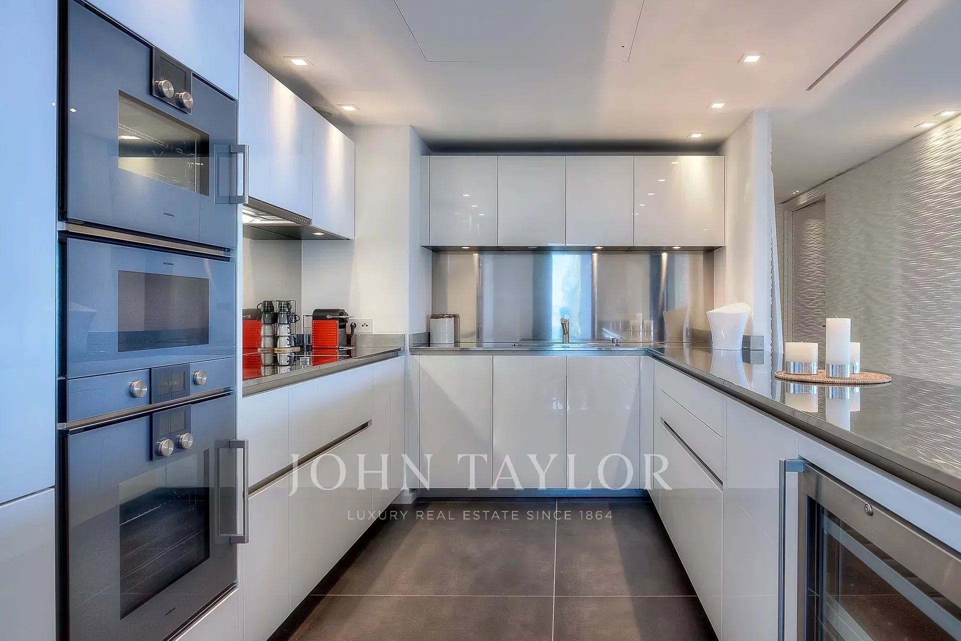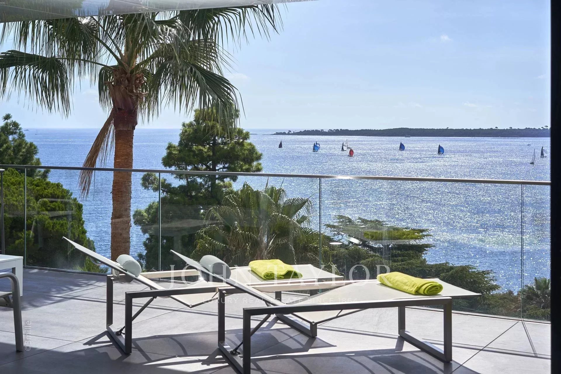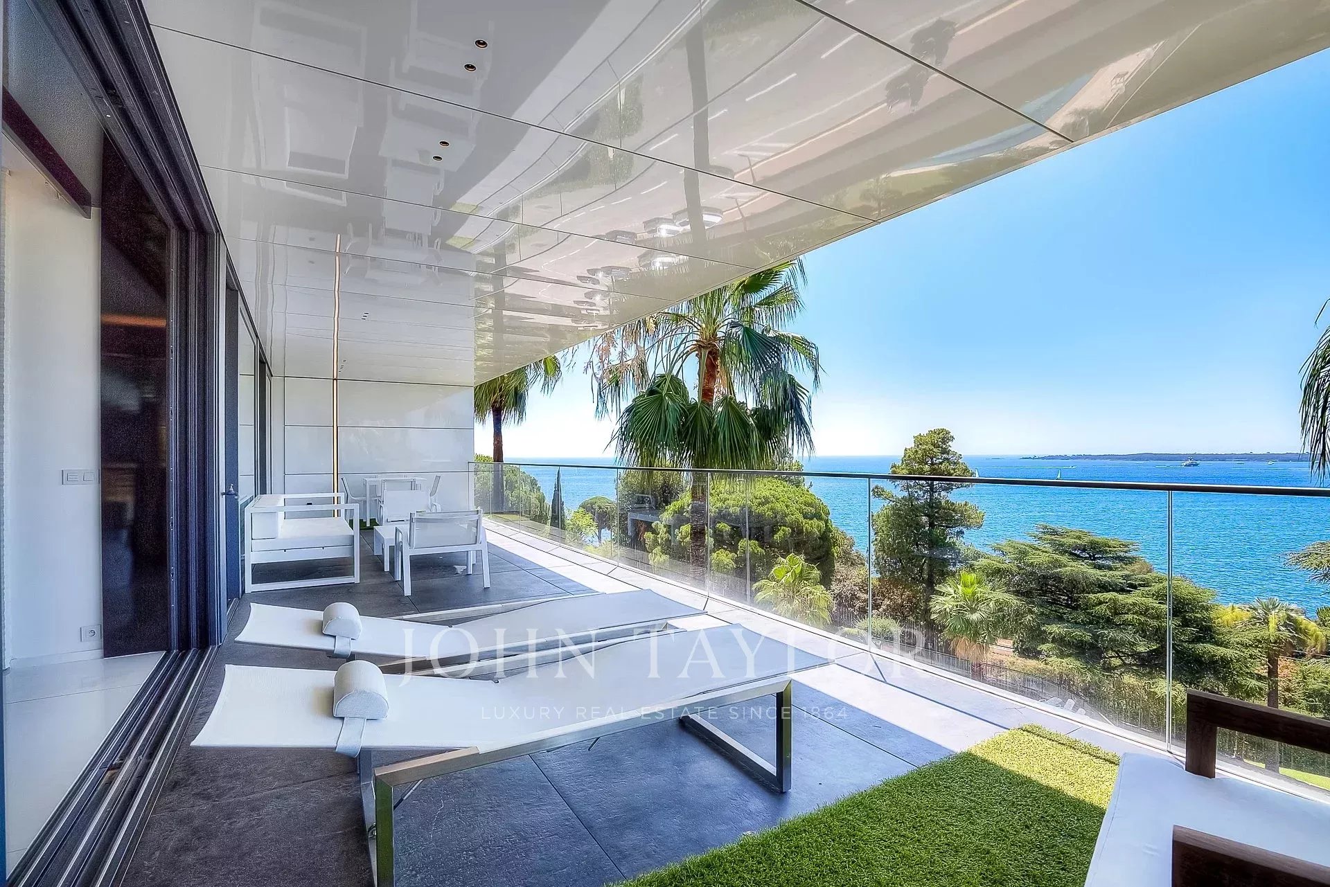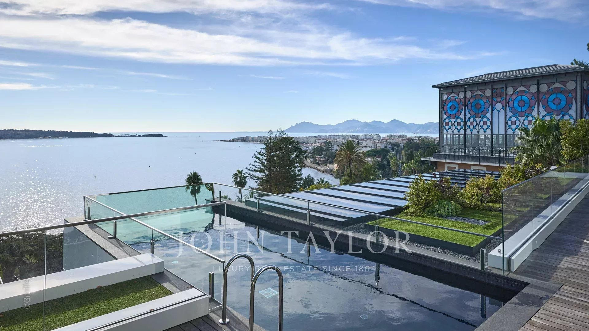 Tento nádherný byt o rozloze 144 m² v nové luxusní rezidenci má velkou a hlubokou terasu o rozloze 54 m². Je orientovaná na jih a nabízí panoramatický výhled na moře a ostrovy Lérins.