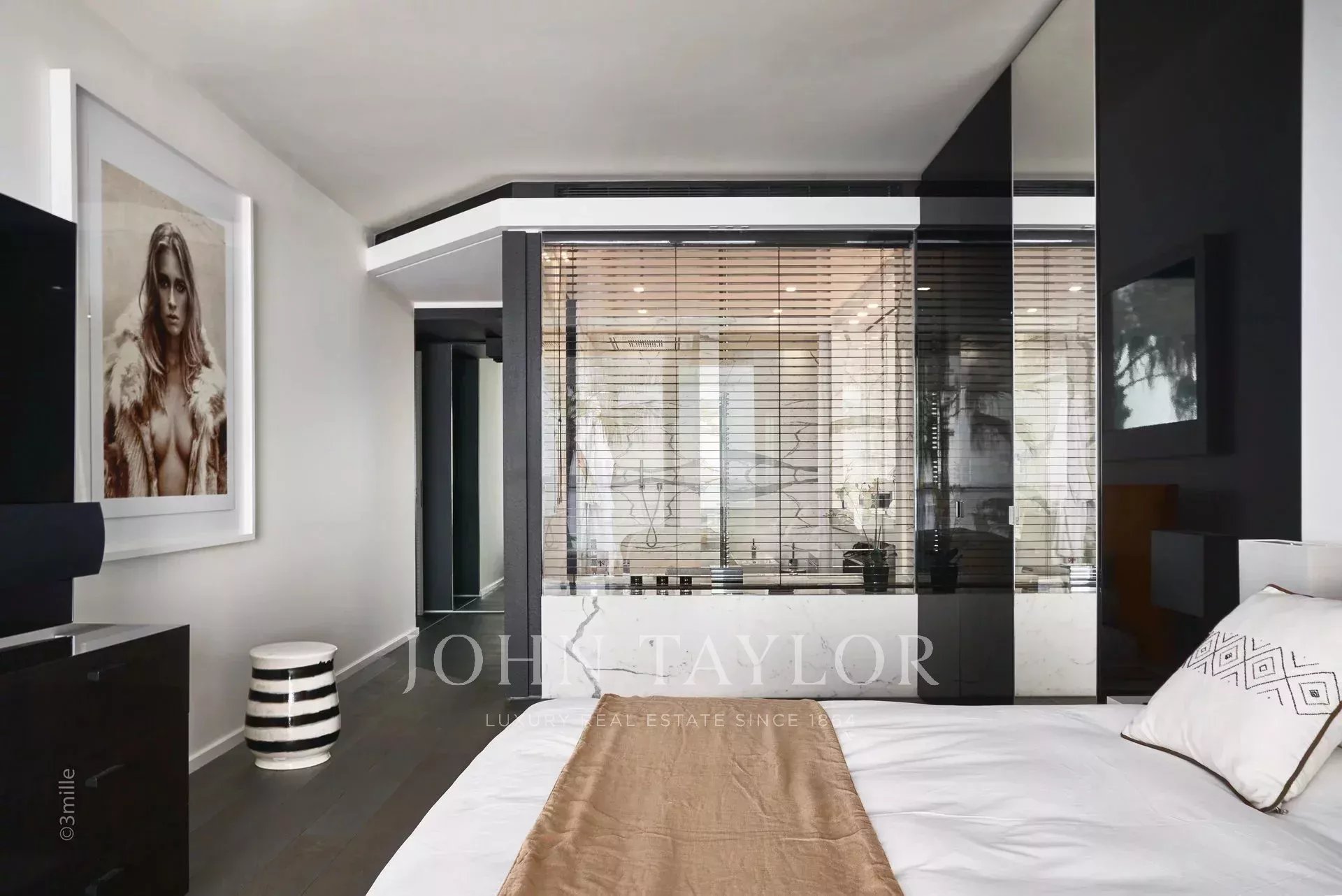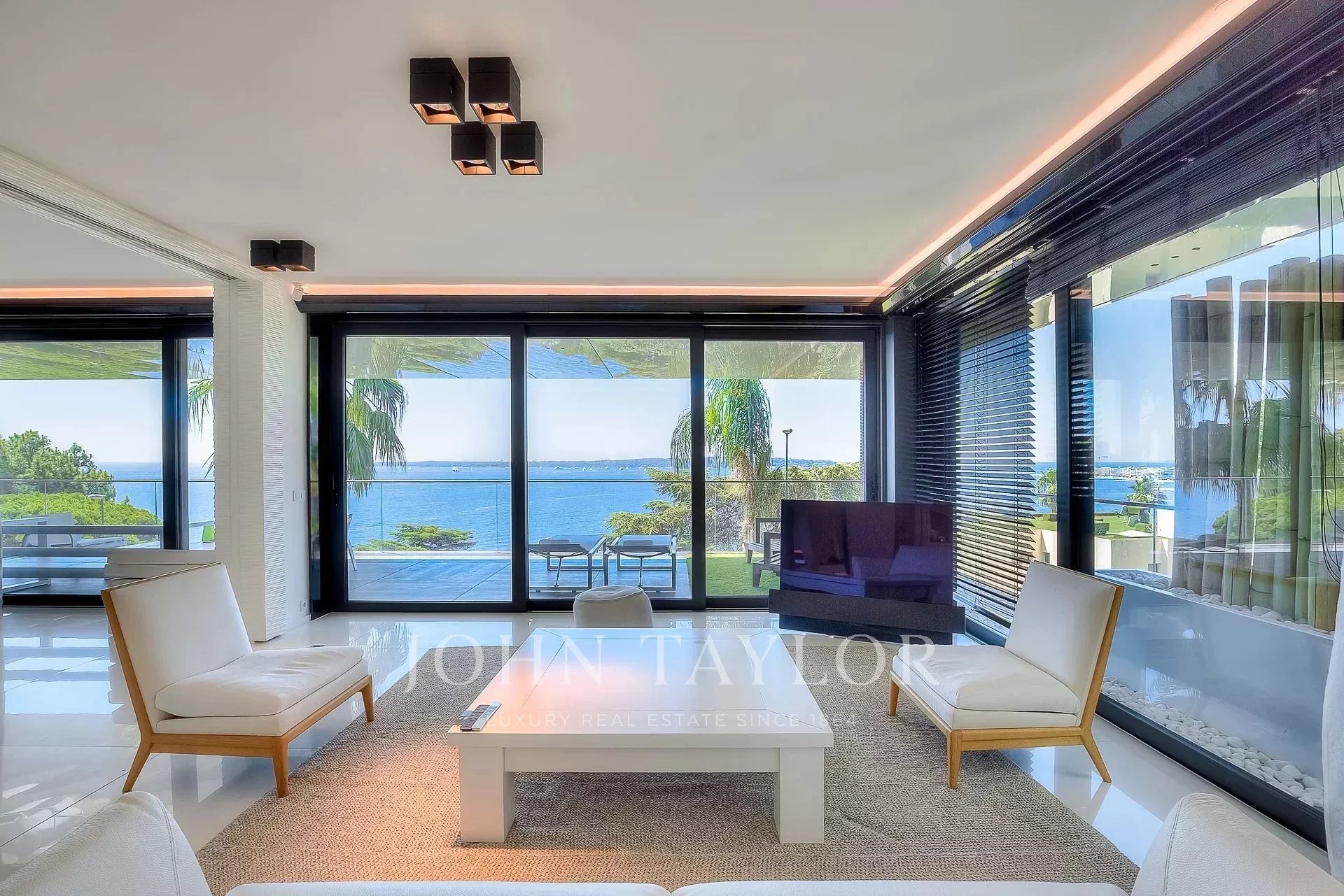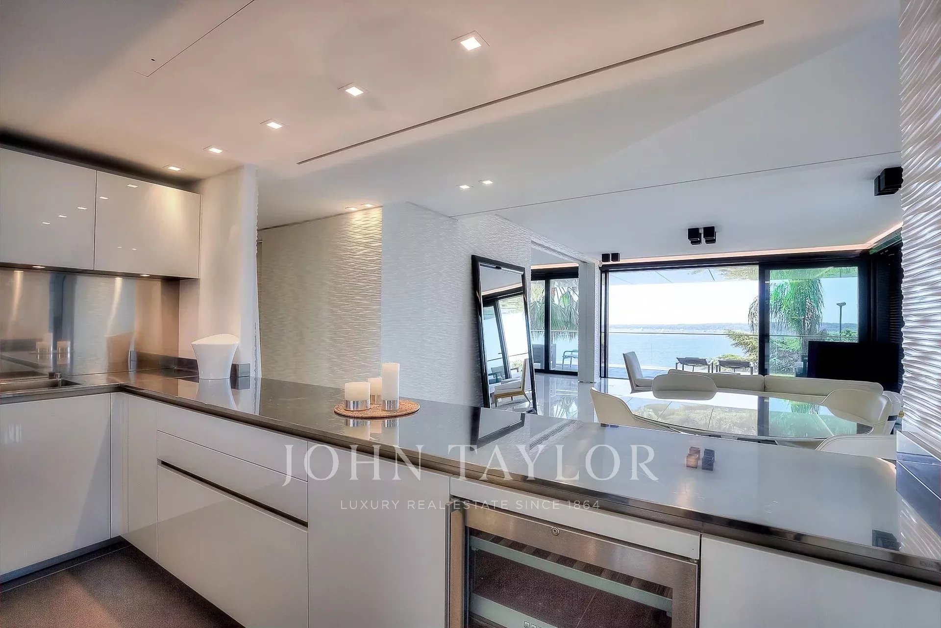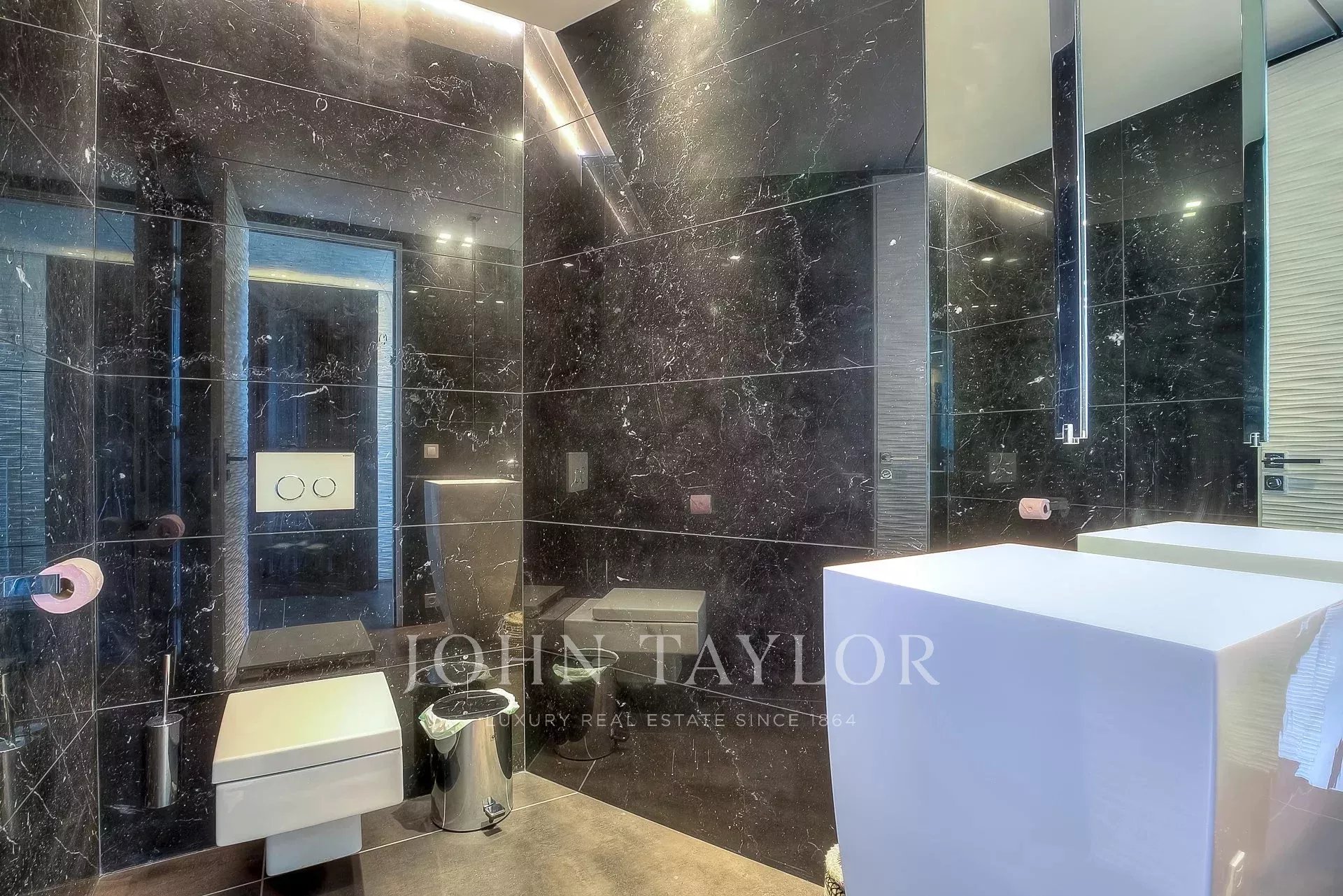 Tento nádherný byt o rozloze 144 m² v nové luxusní rezidenci má velkou a hlubokou terasu o rozloze 54 m². Je orientovaná na jih a nabízí panoramatický výhled na moře a ostrovy Lérins.