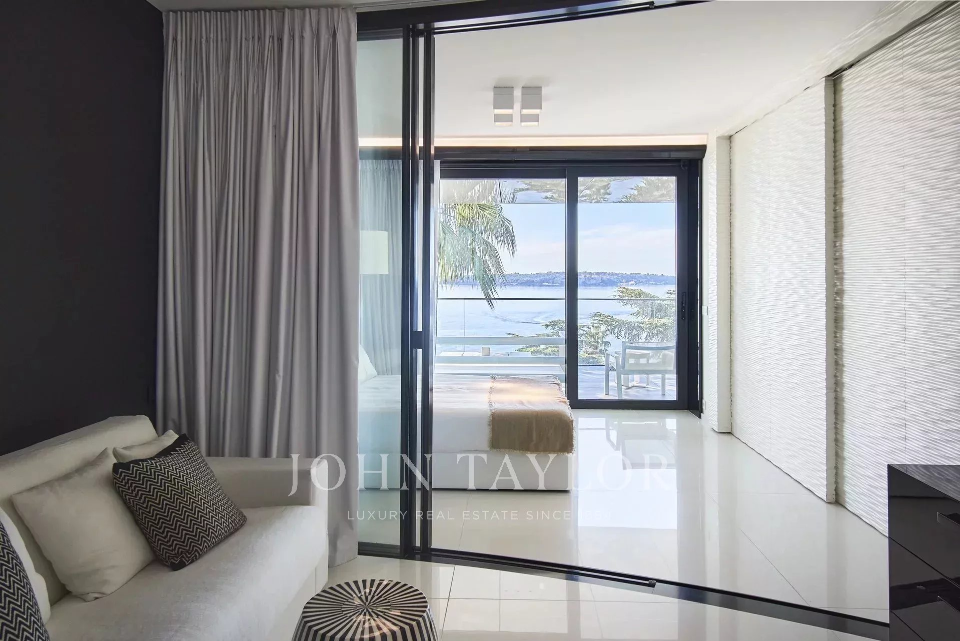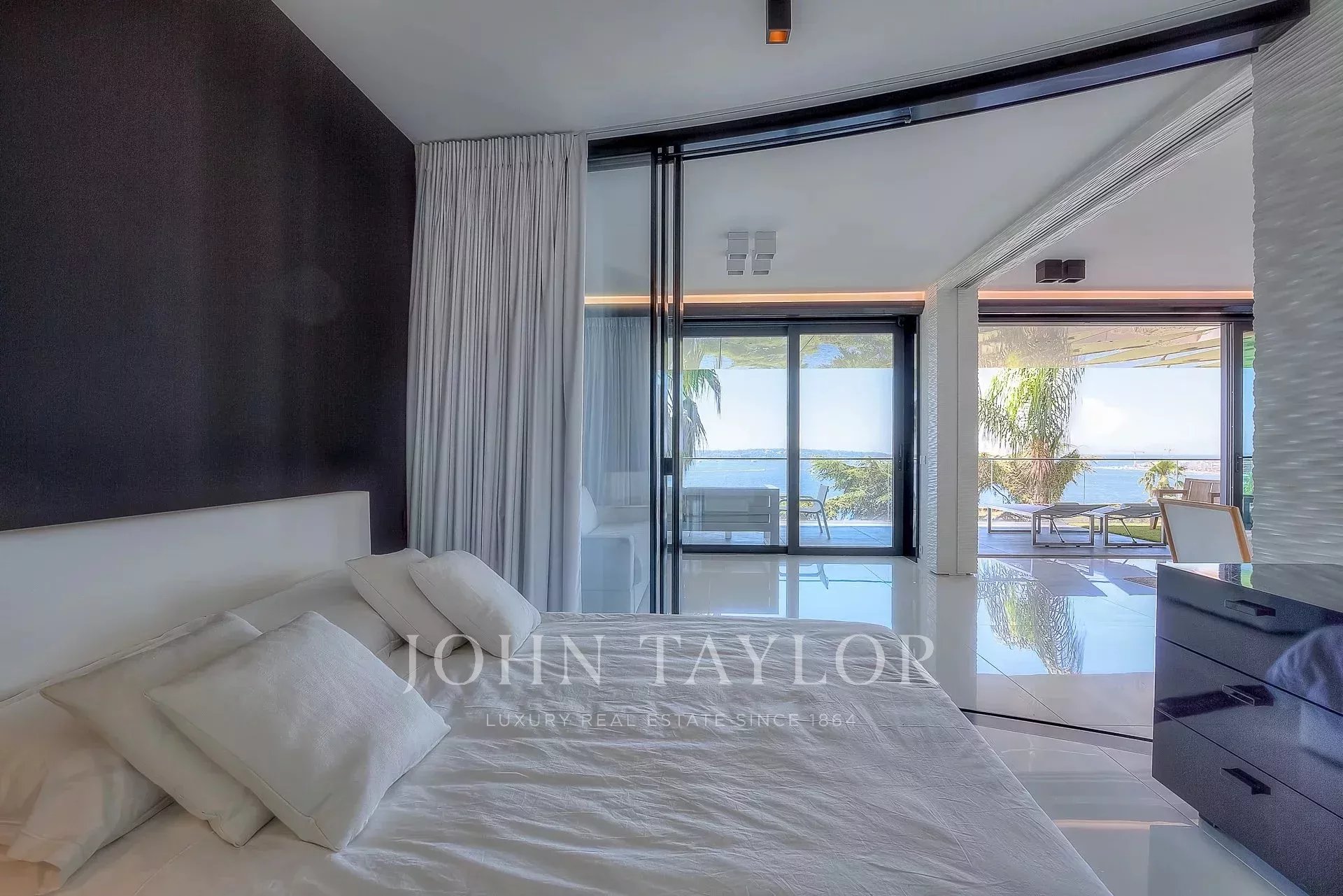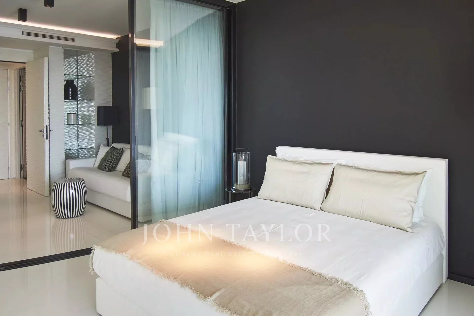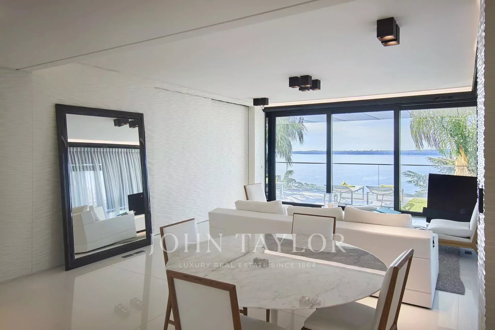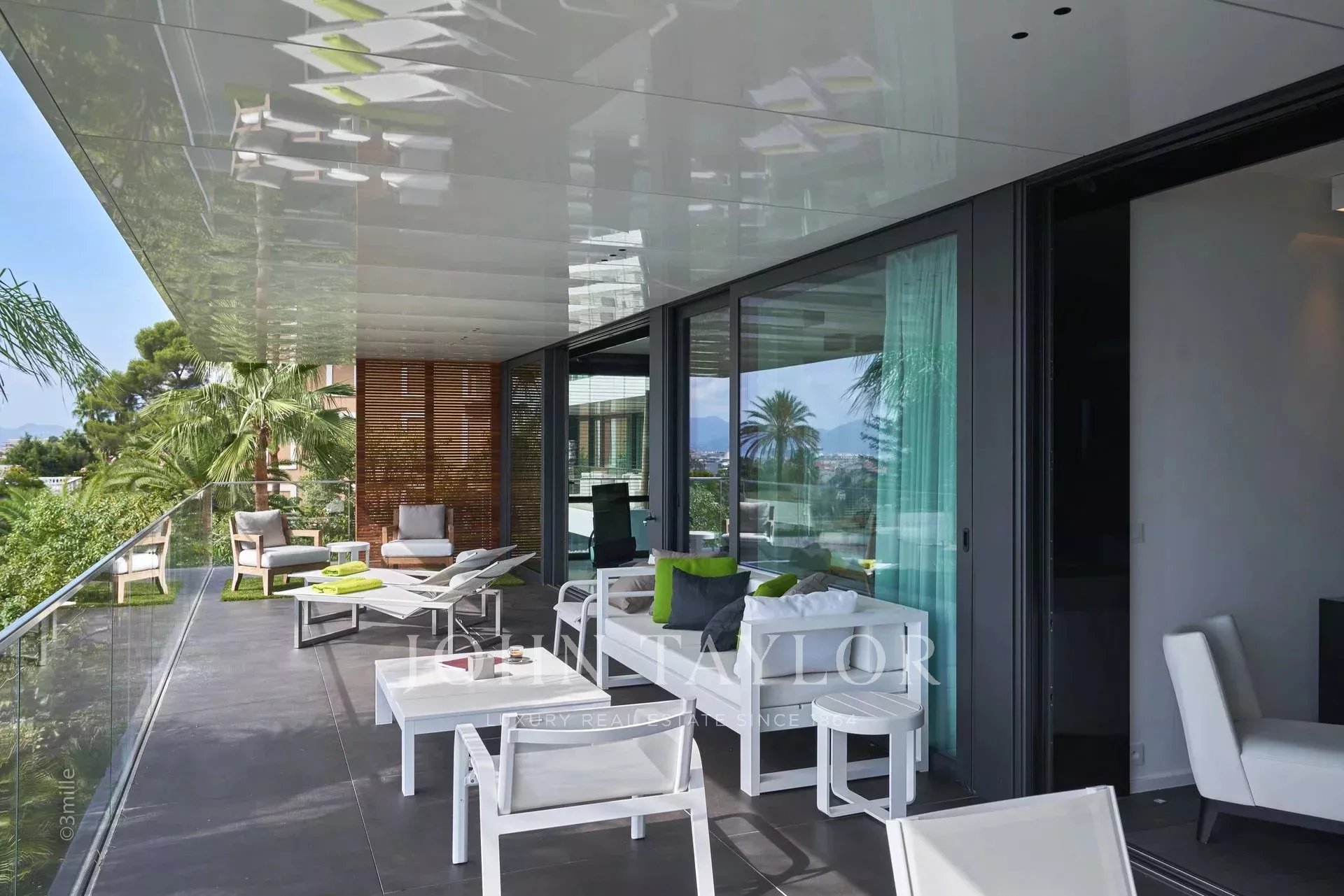 Tento nádherný byt o rozloze 144 m² v nové luxusní rezidenci má velkou a hlubokou terasu o rozloze 54 m². Je orientovaná na jih a nabízí panoramatický výhled na moře a ostrovy Lérins.