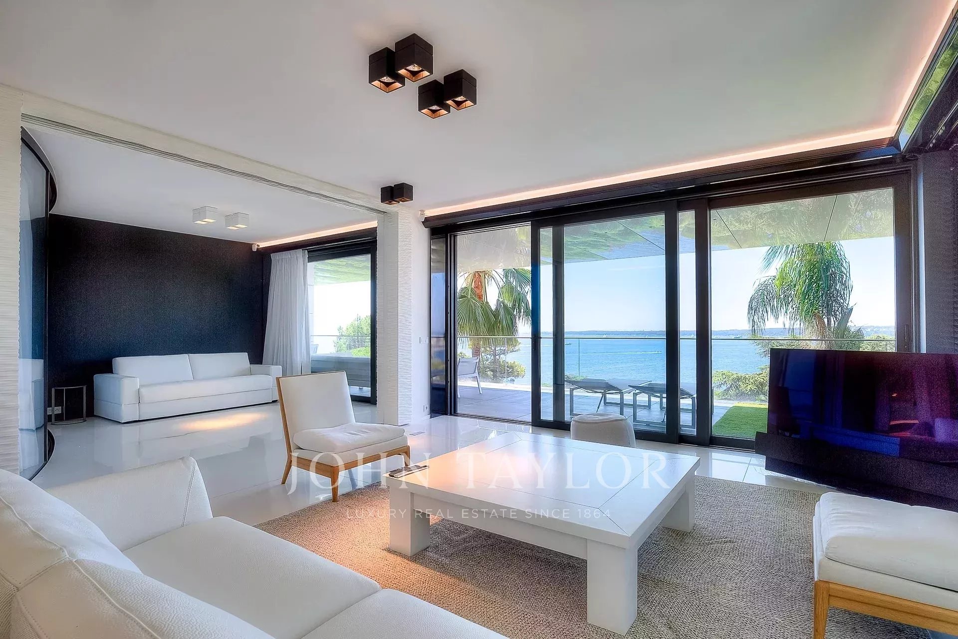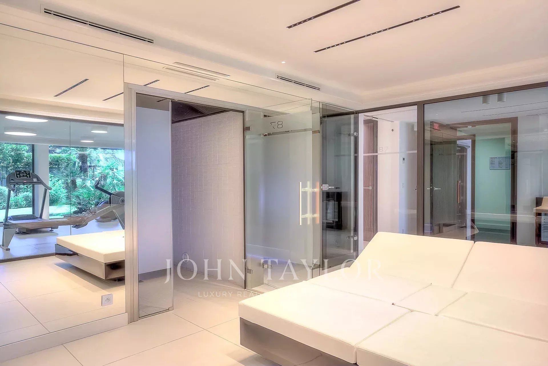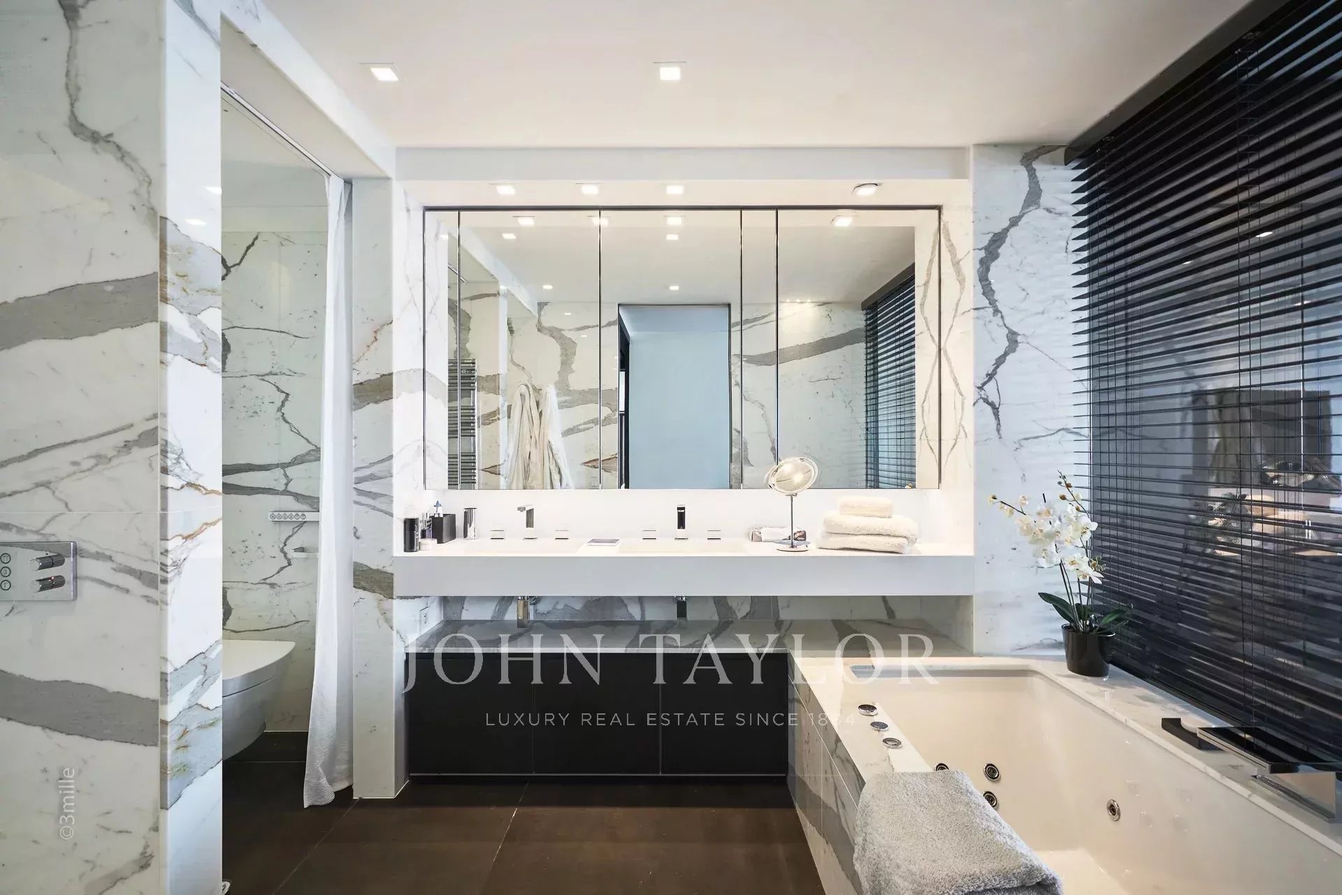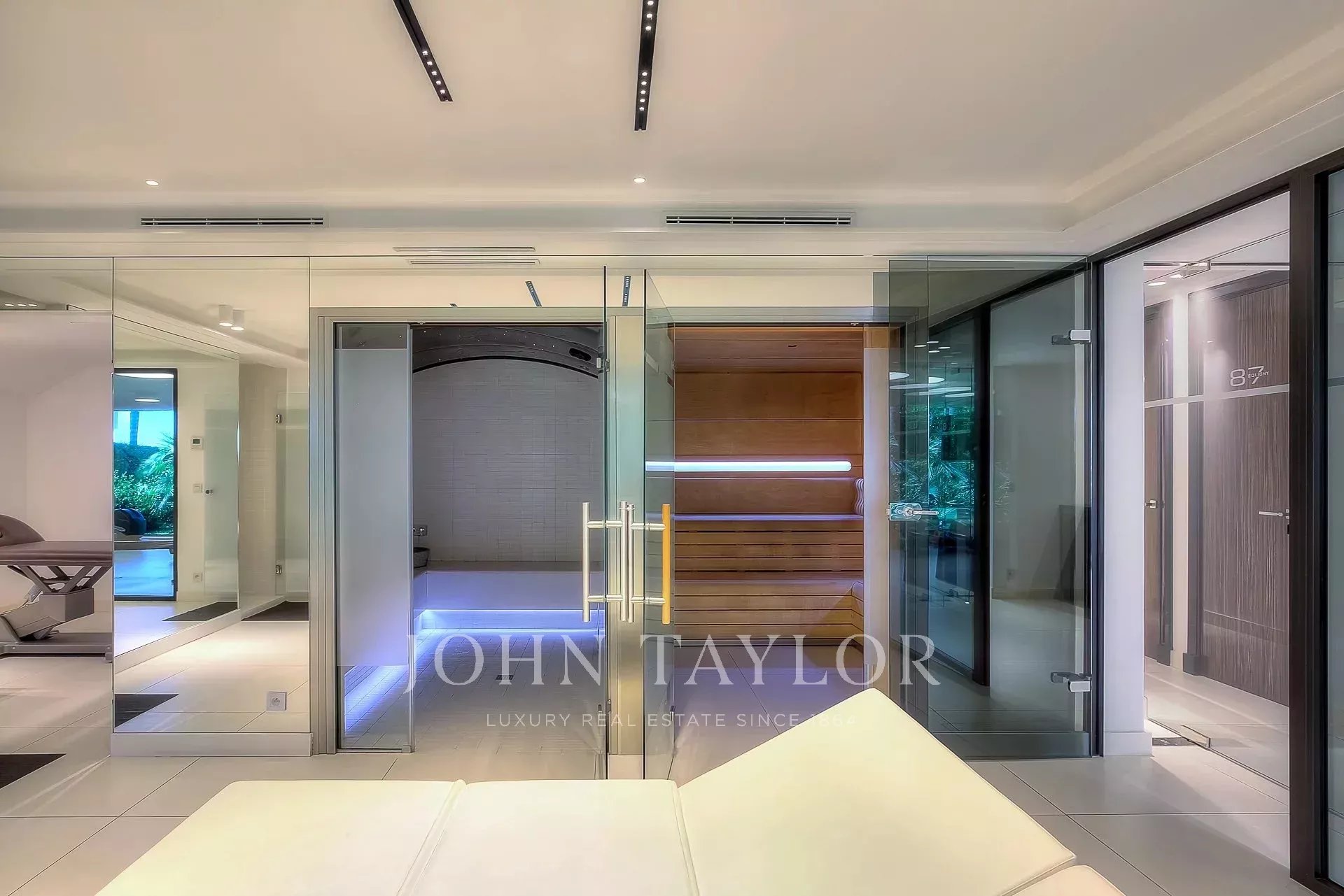 Tento nádherný byt o rozloze 144 m² v nové luxusní rezidenci má velkou a hlubokou terasu o rozloze 54 m². Je orientovaná na jih a nabízí panoramatický výhled na moře a ostrovy Lérins.