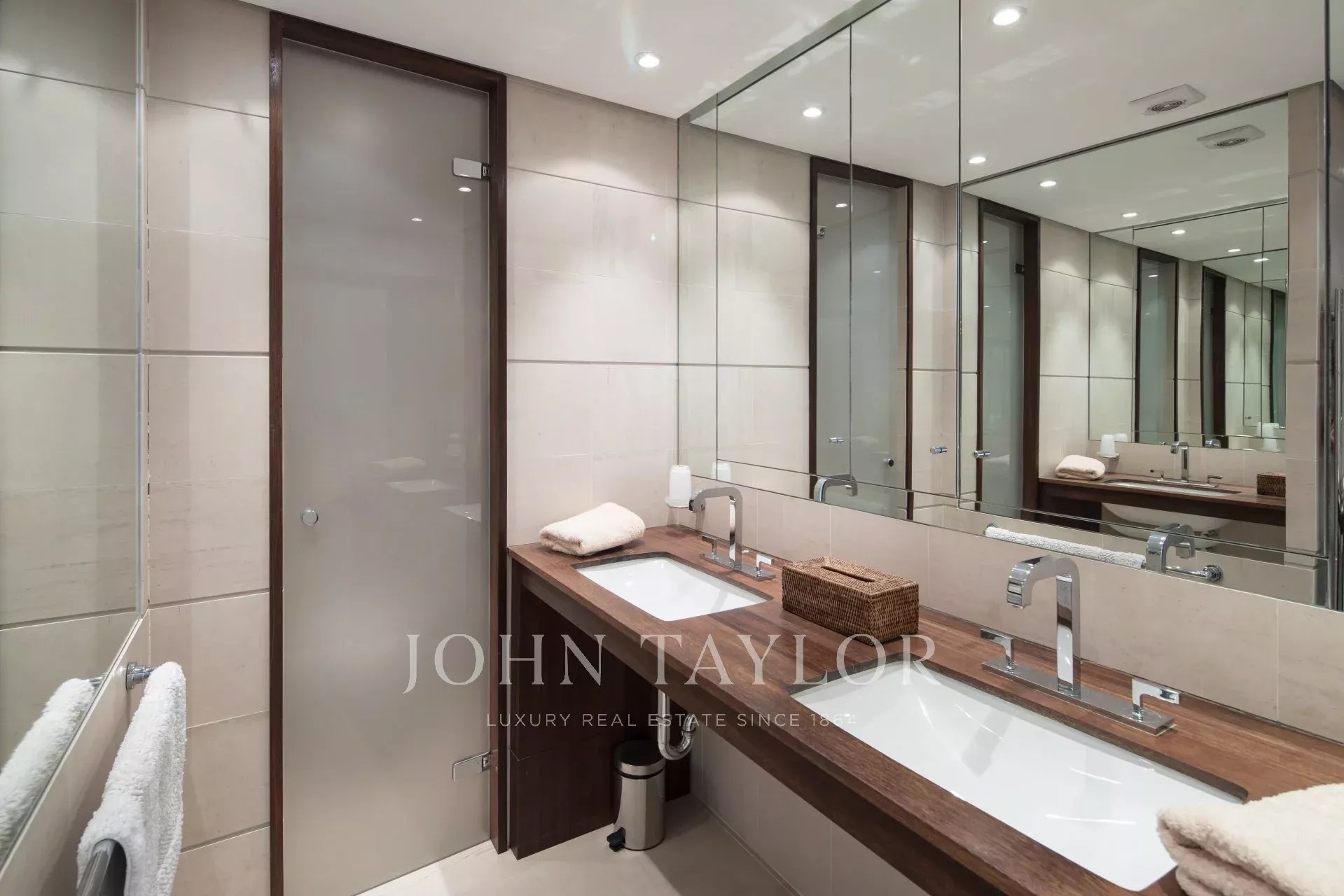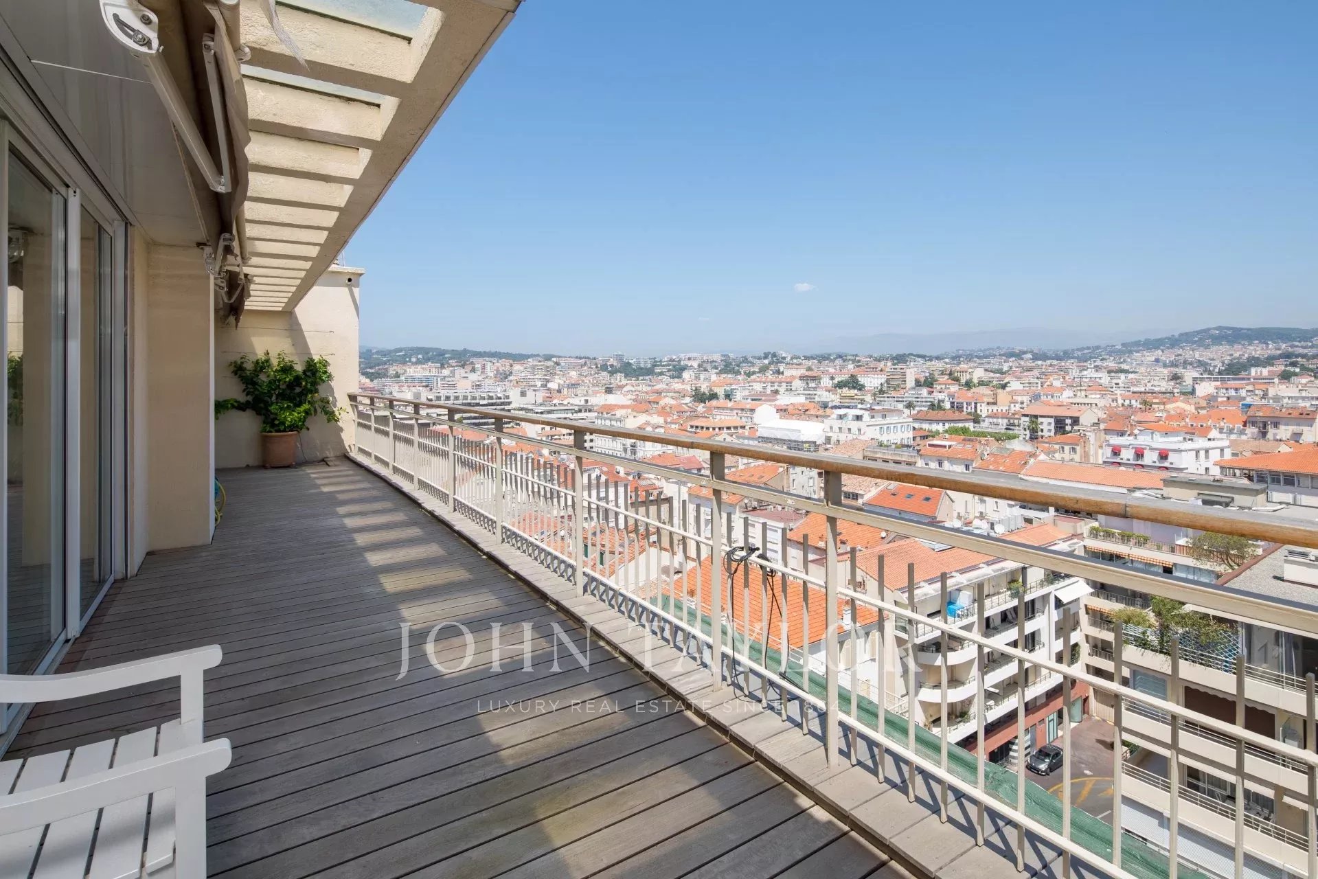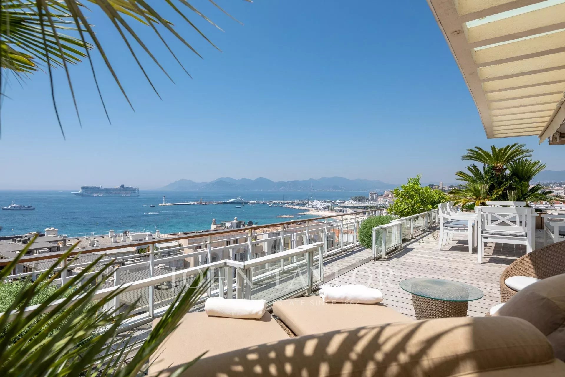 V luxusní rezidenci v srdci Croisette, velký byt o rozloze 150 m² s terasou o rozloze 182 m² s panoramatickým výhledem na Canneský záliv.
