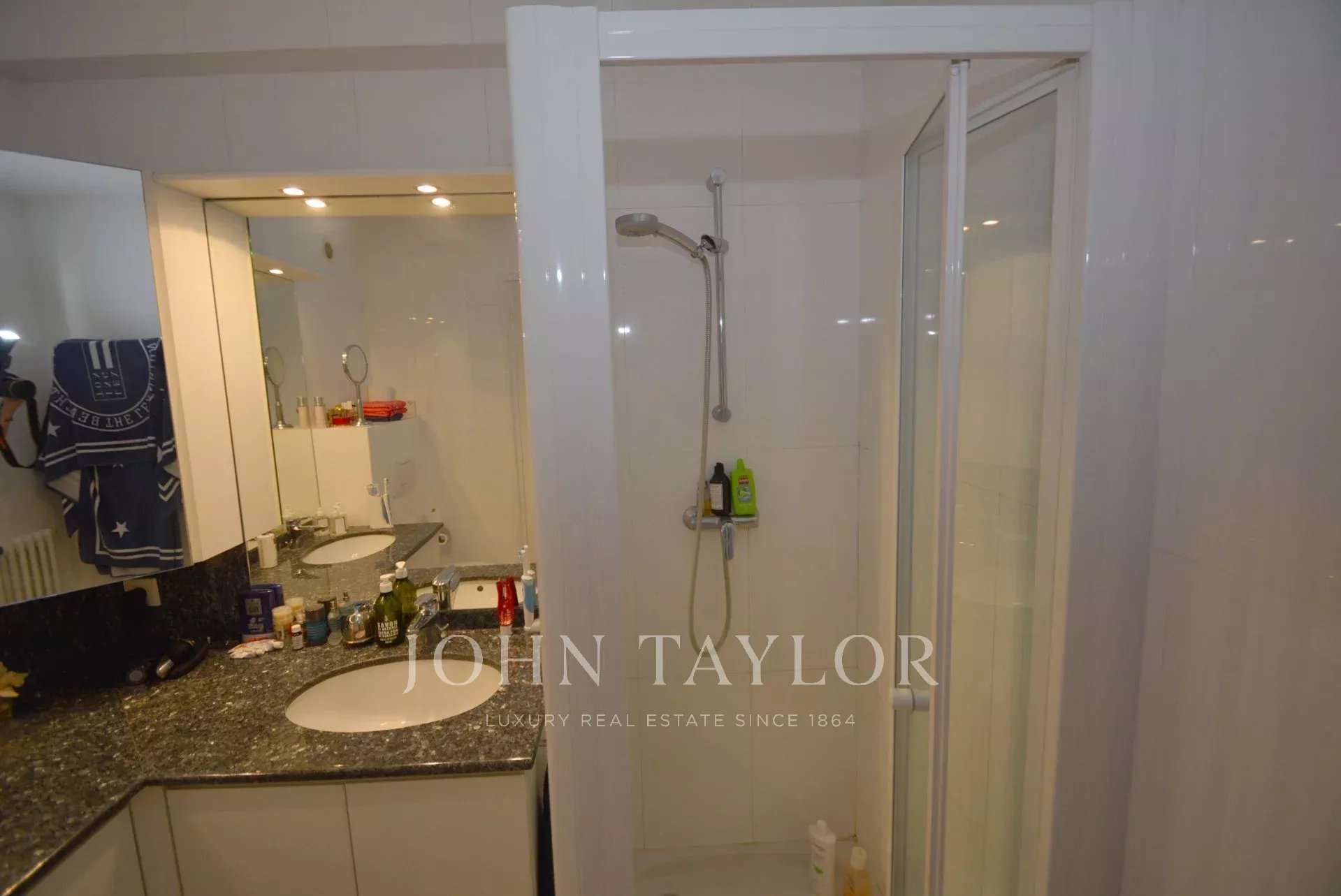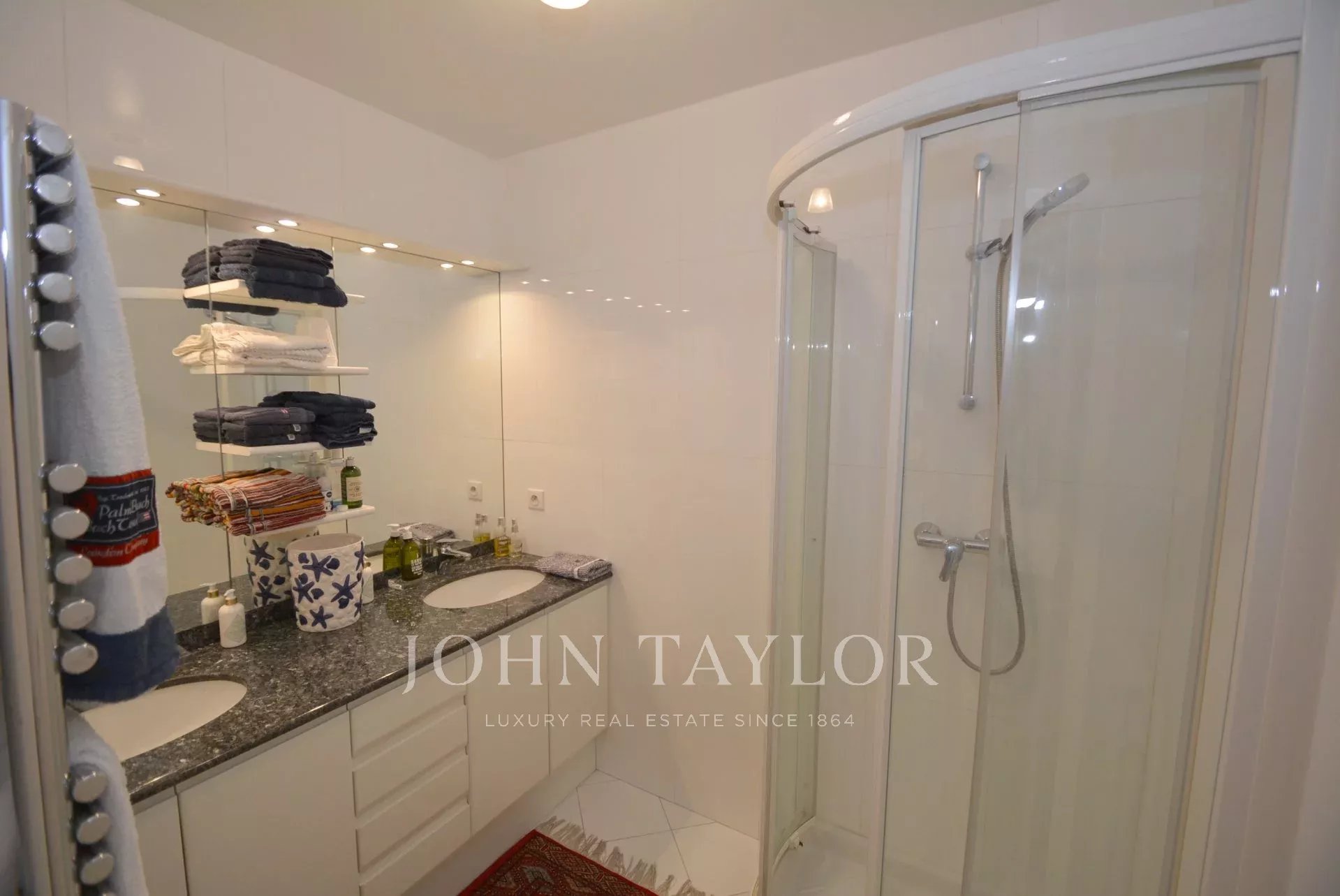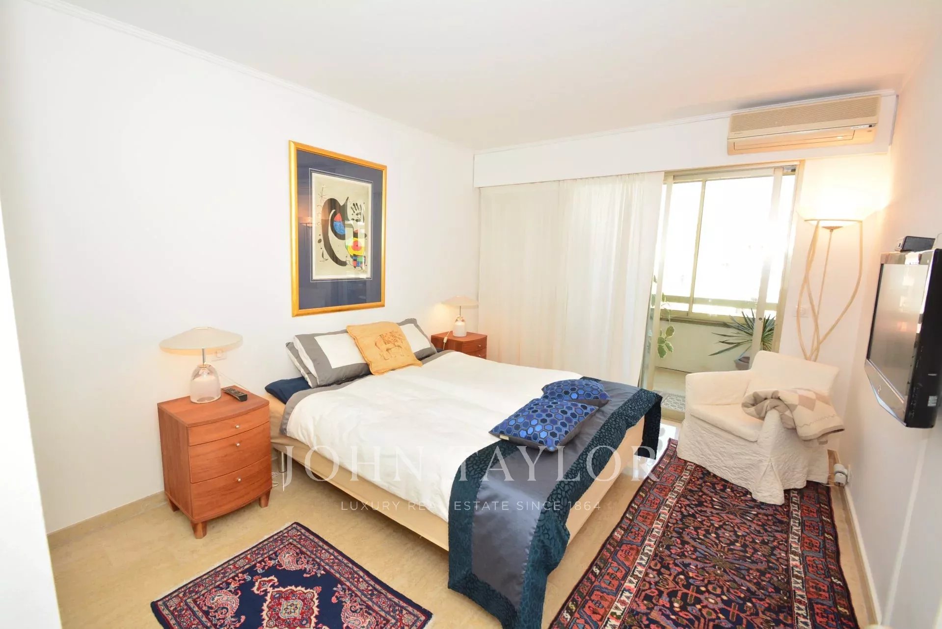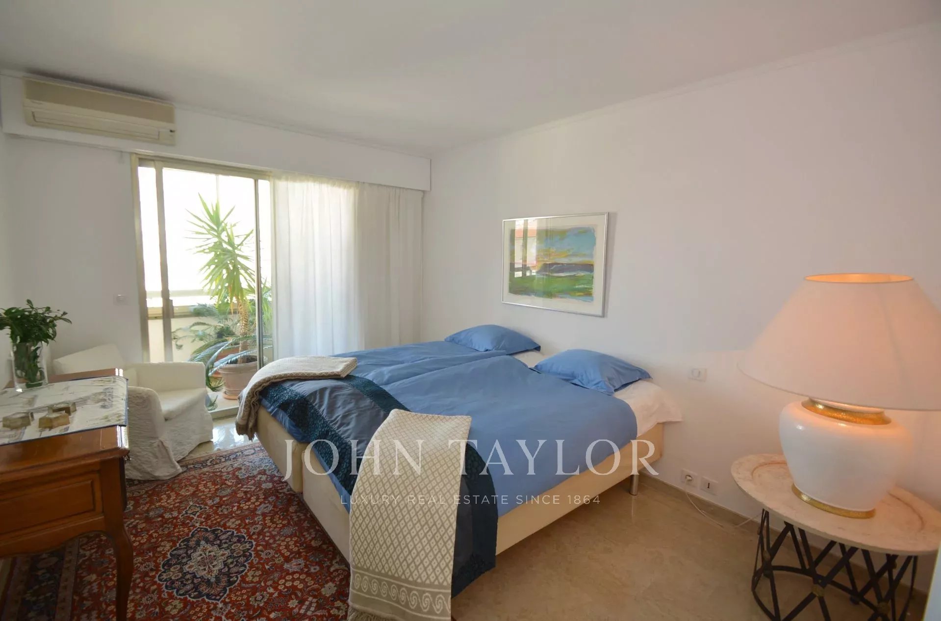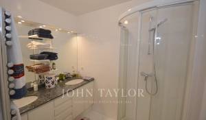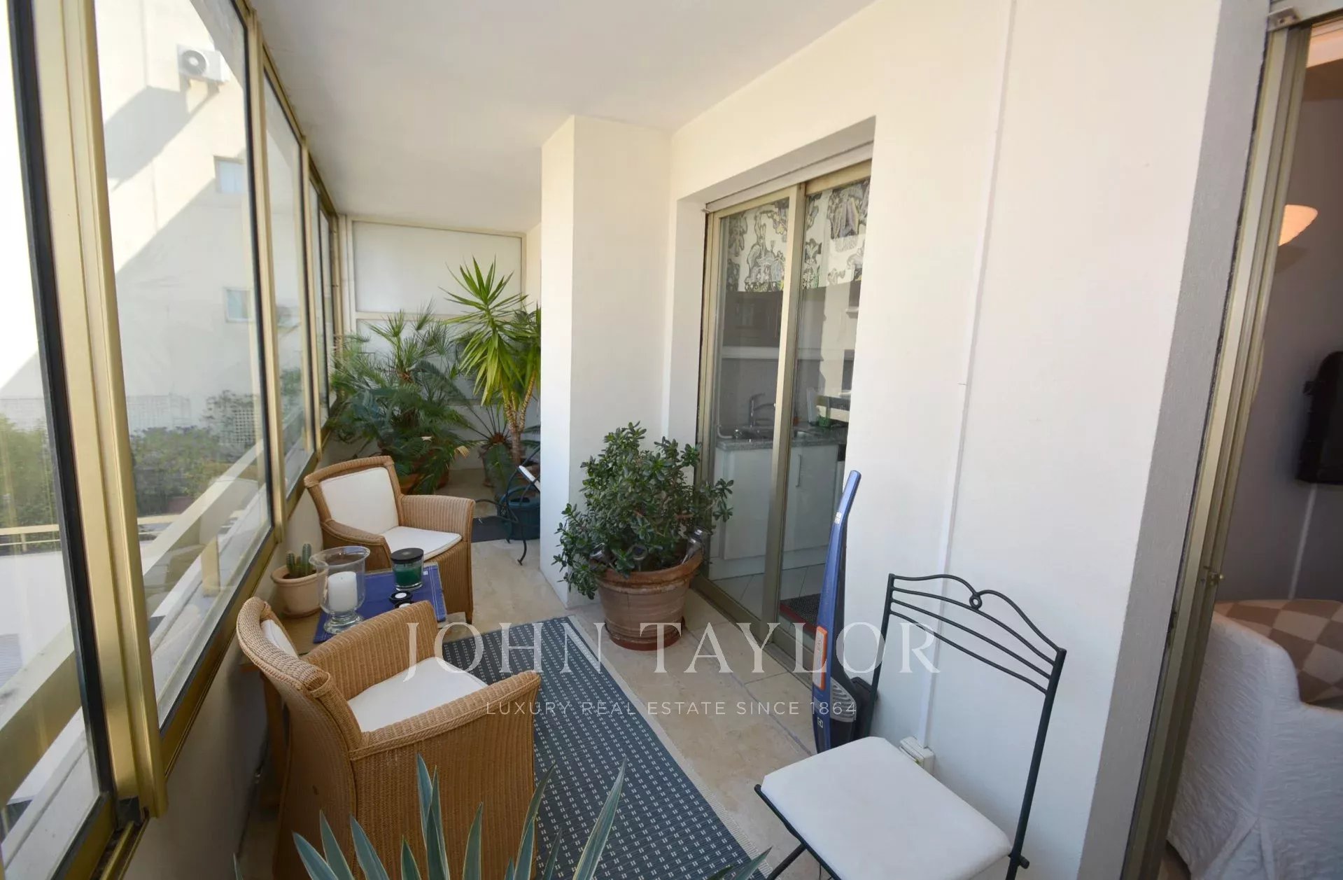 Tento plně klimatizovaný průchozí byt v 6. patře luxusní rezidence v srdci Croisette s výhledem na Cannesský záliv nabízí obytnou plochu 94 m².
