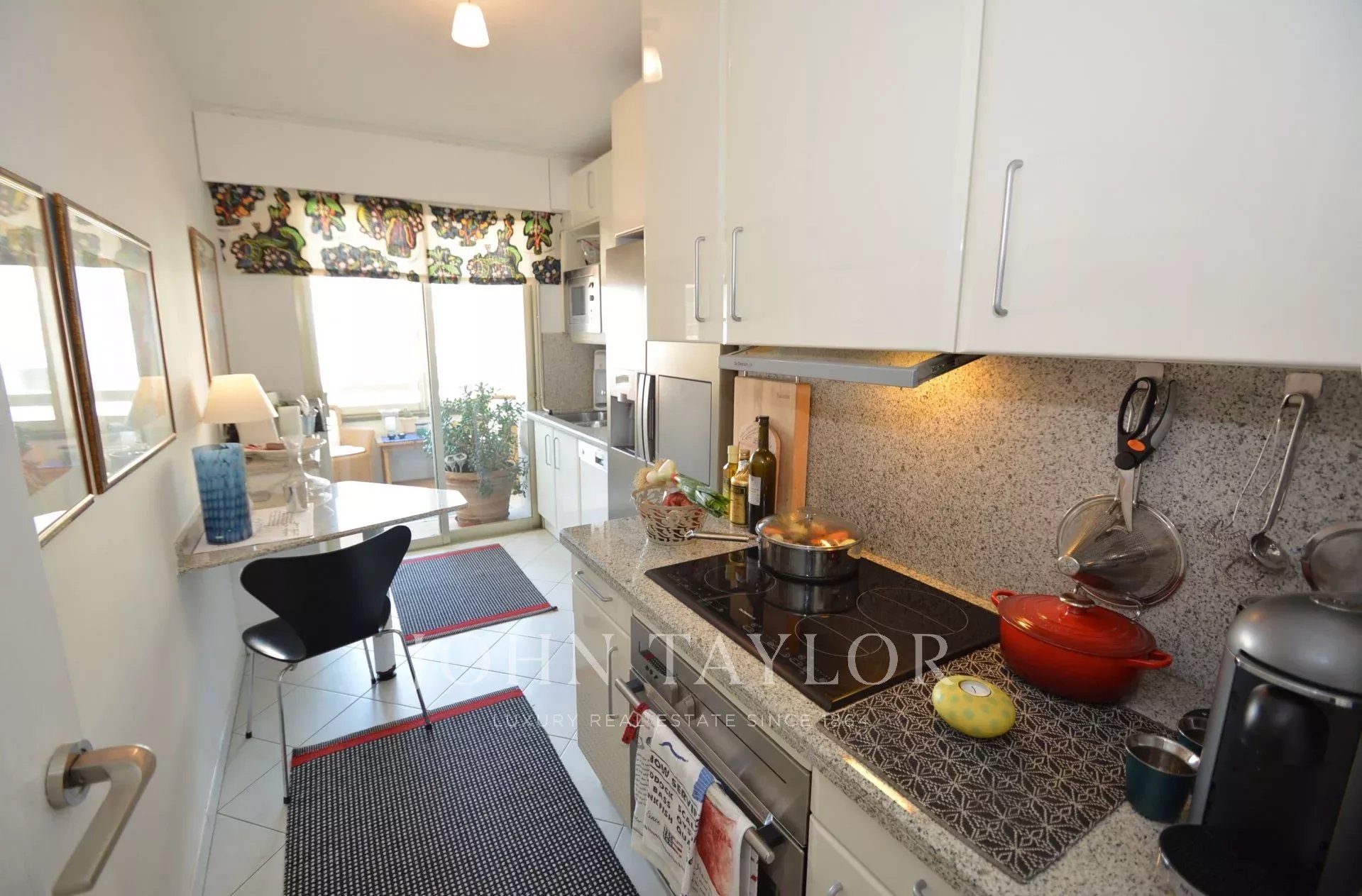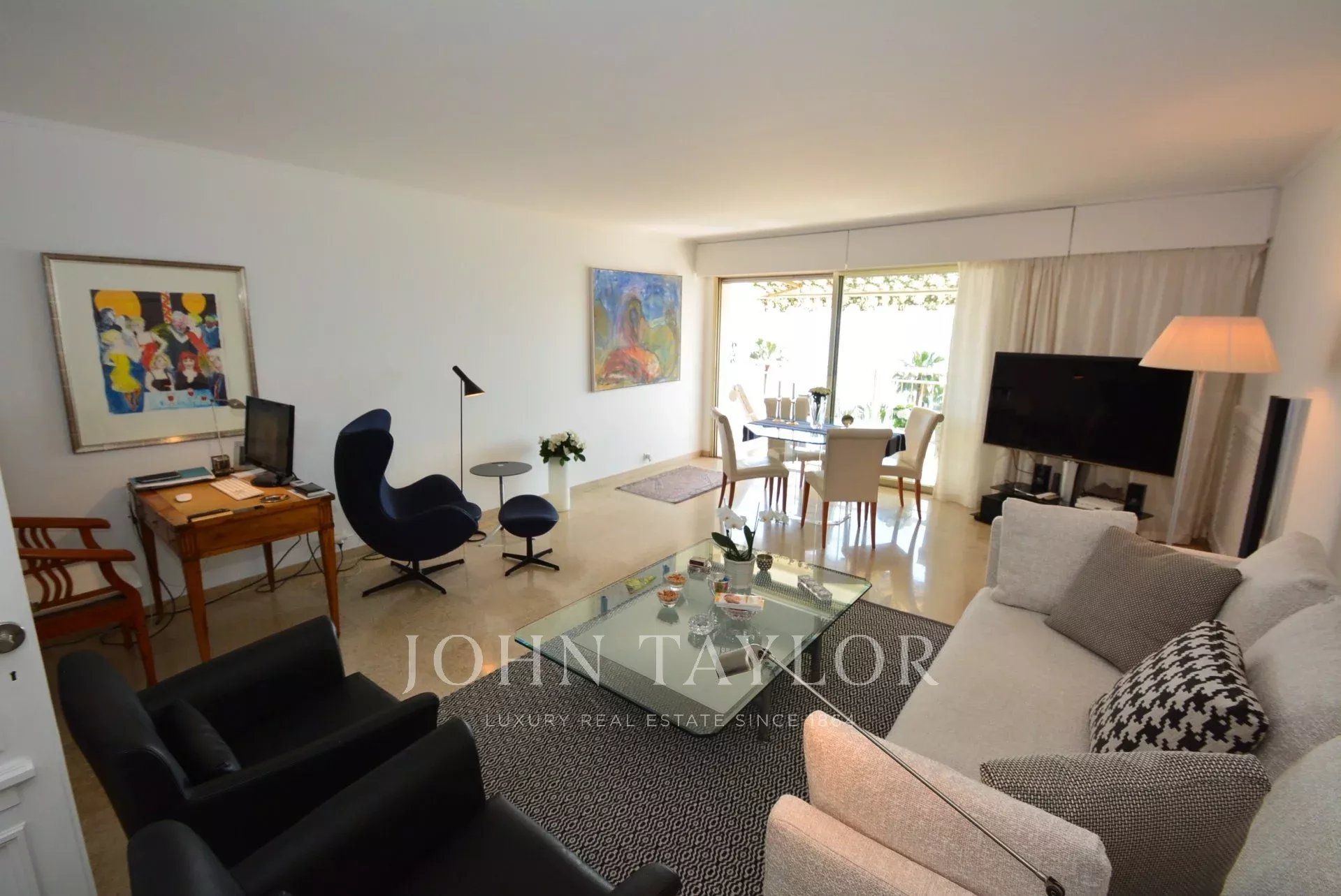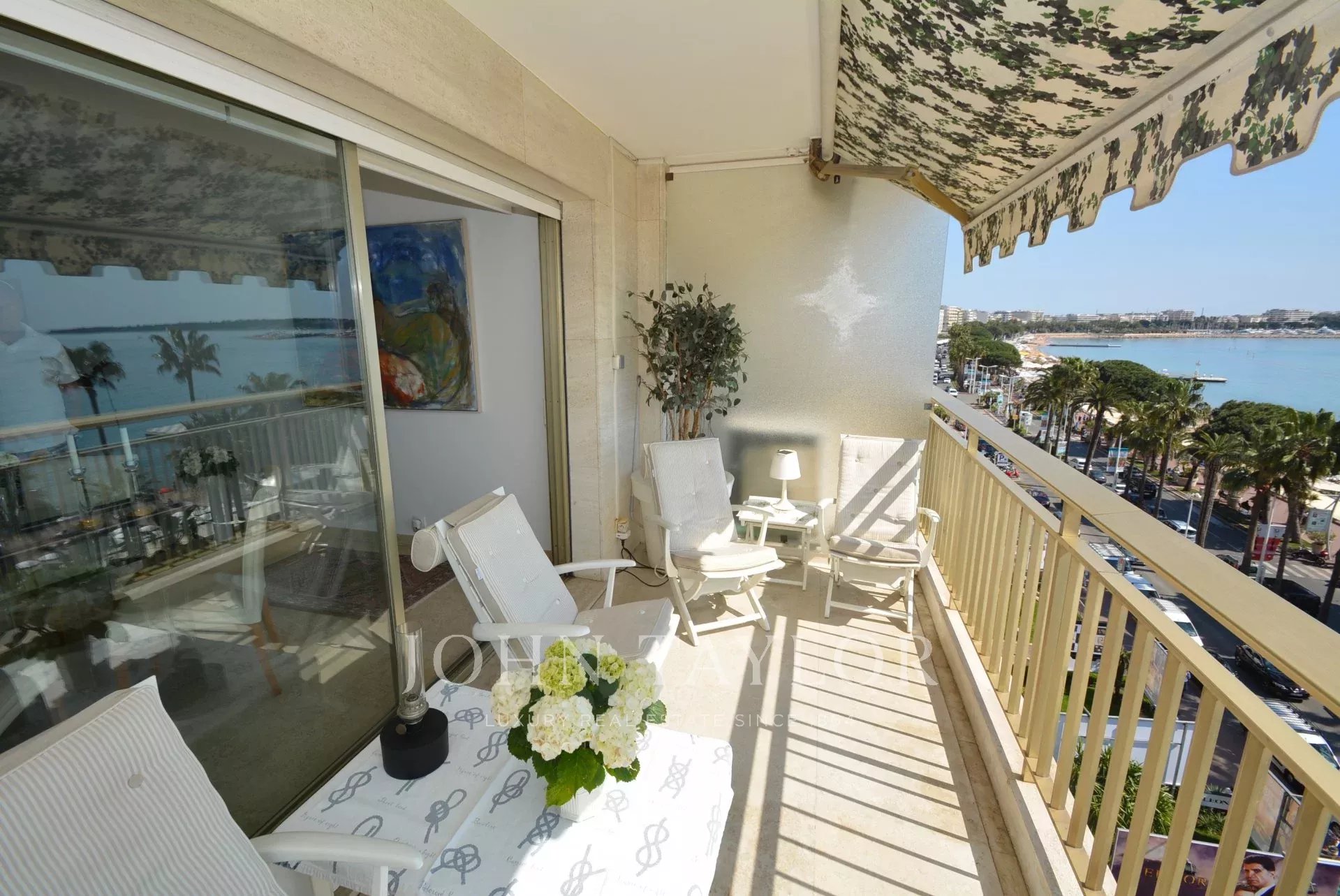 Na jih - směrem k moři: obývací pokoj/jídelna s výhledem na hlavní balkon s výhledem na celý Canneský záliv.