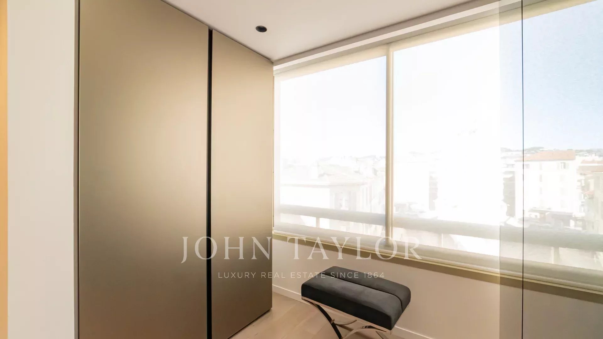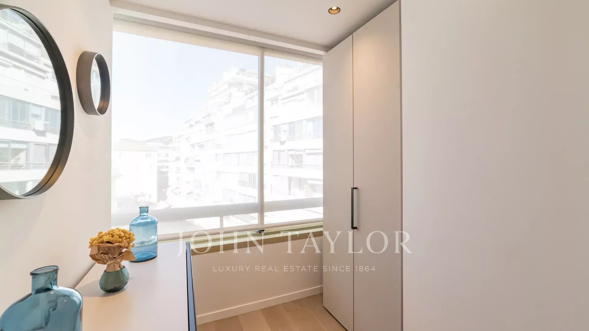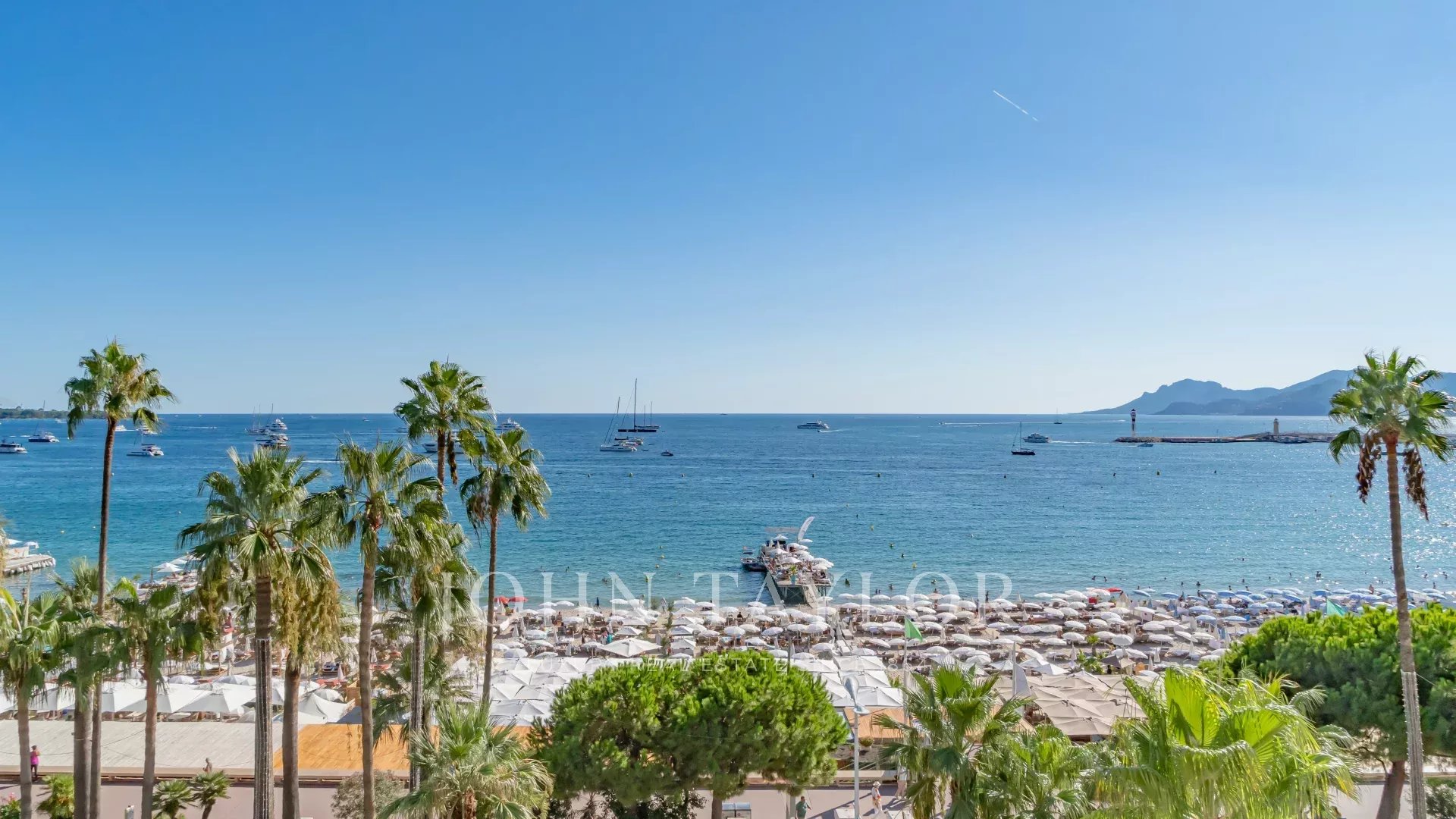 Krásný klimatizovaný byt se nachází v srdci Croisette v 5. patře luxusní rezidence s nádherným panoramatickým výhledem na Canneský záliv, pláže, Festivalový palác a Estérel.
