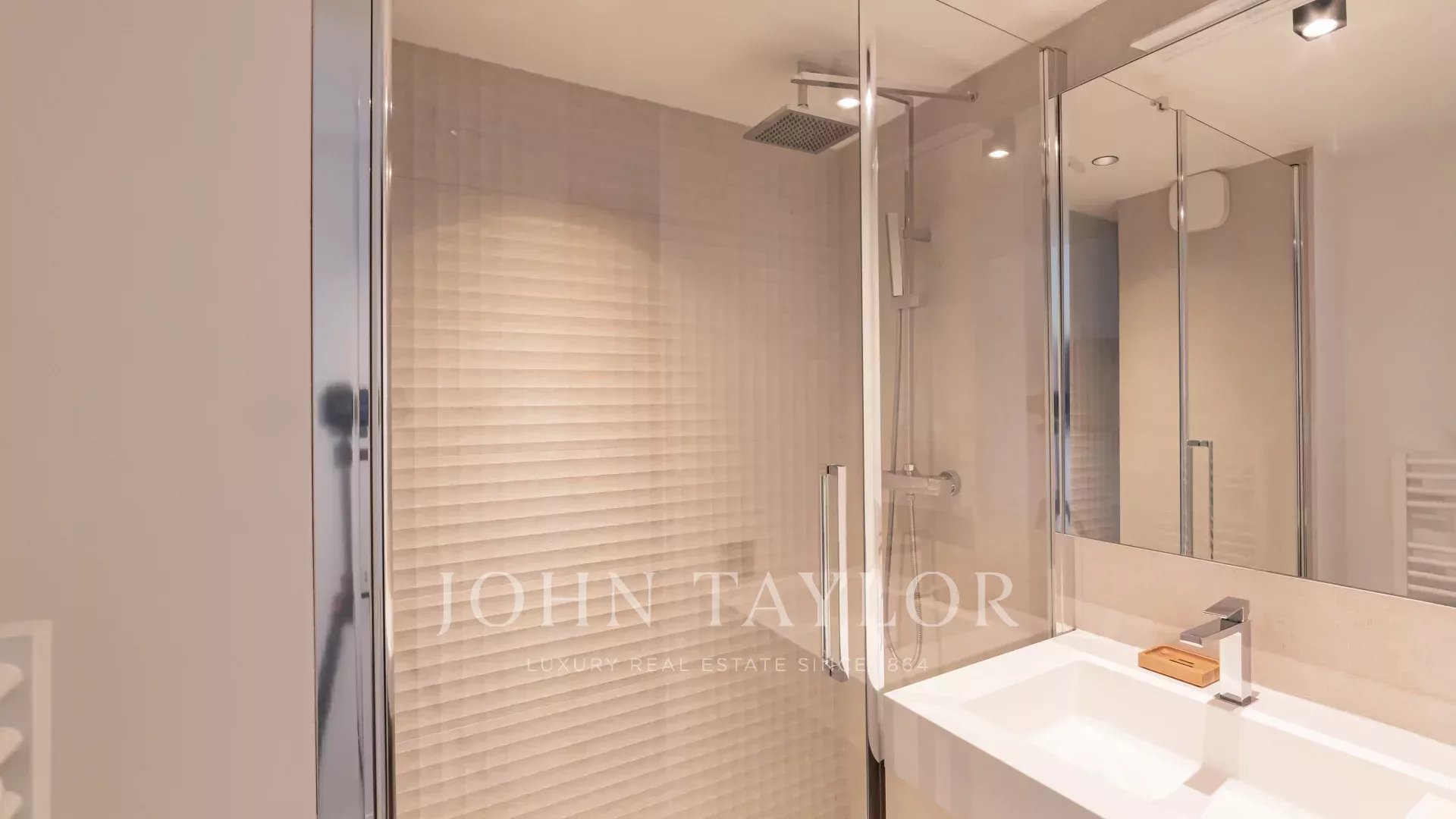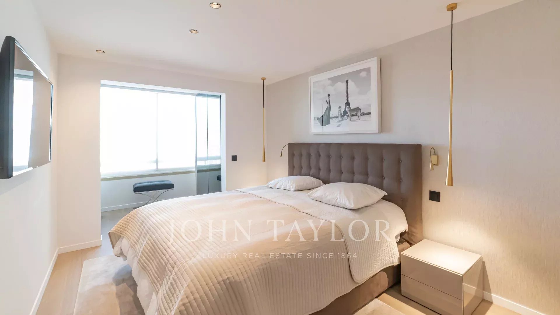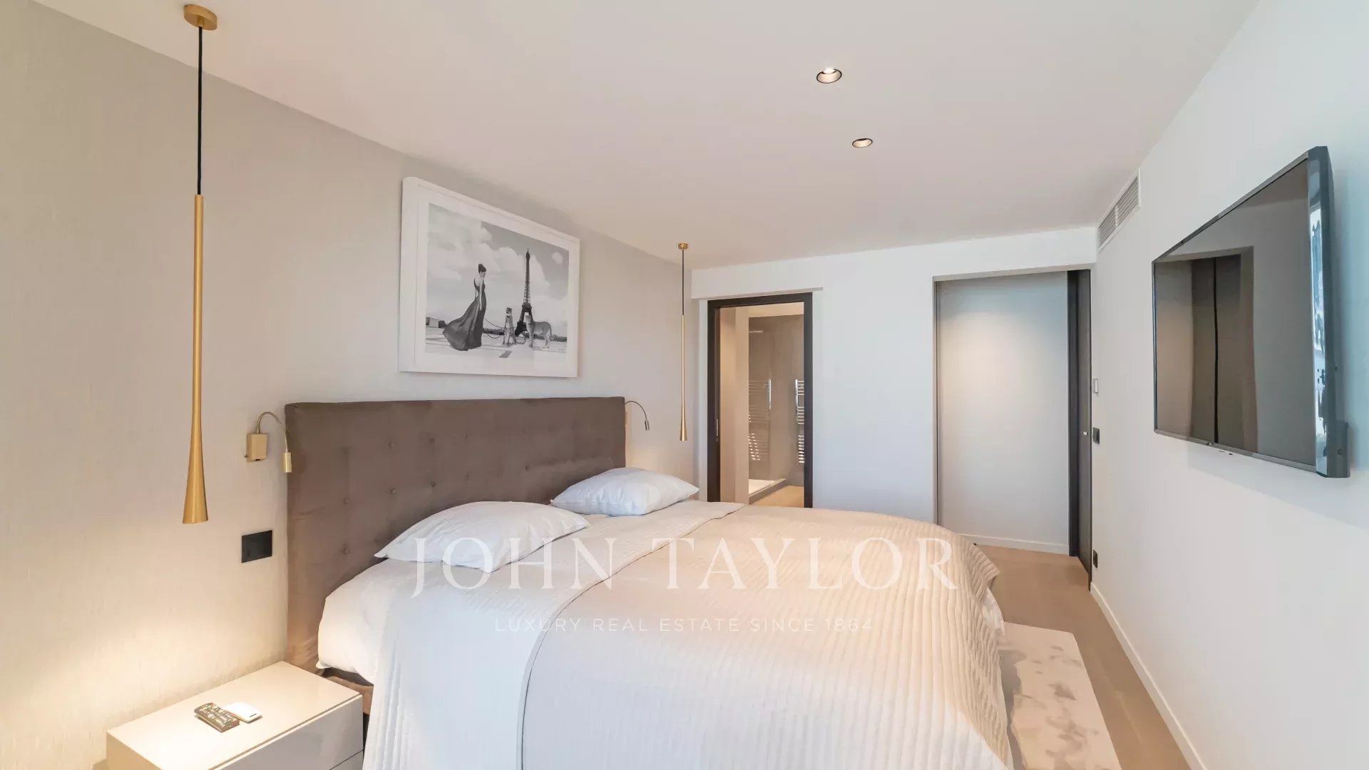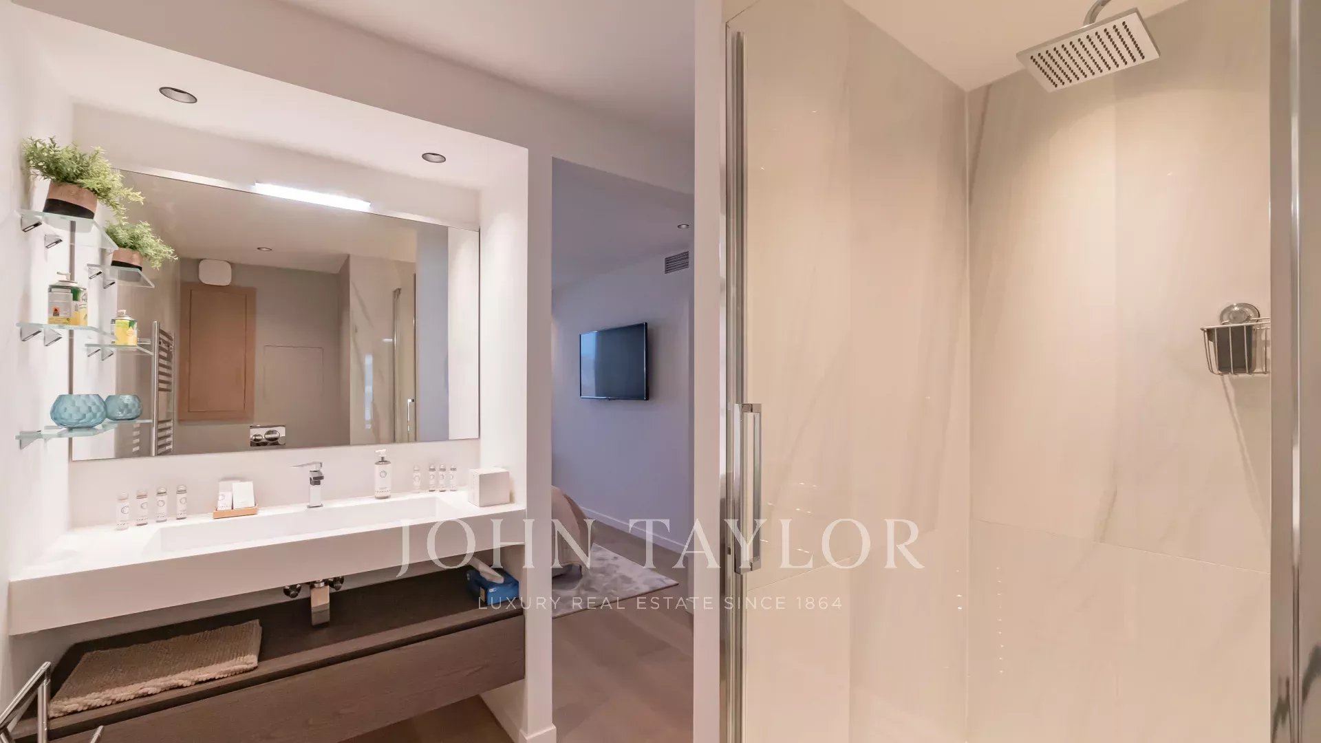 Krásný klimatizovaný byt se nachází v srdci Croisette v 5. patře luxusní rezidence s nádherným panoramatickým výhledem na Canneský záliv, pláže, Festivalový palác a Estérel.