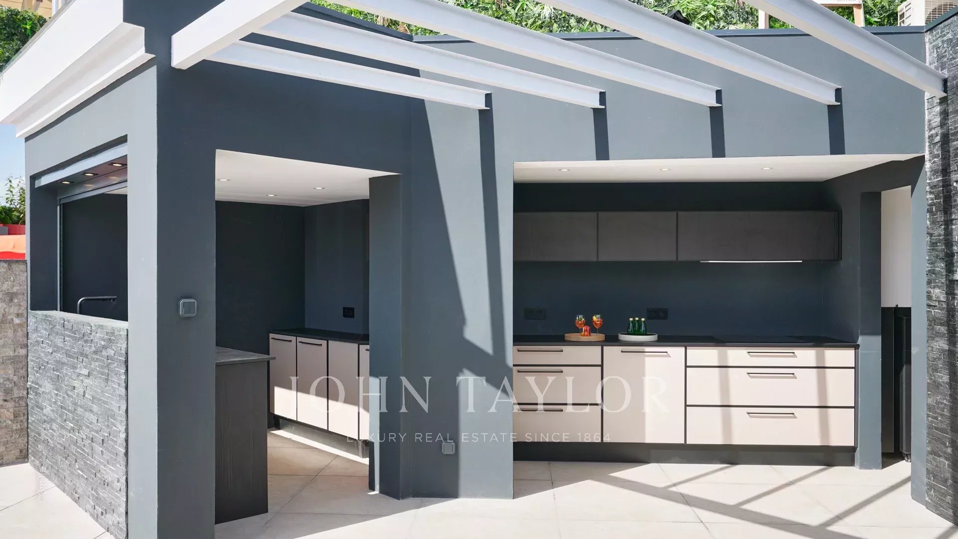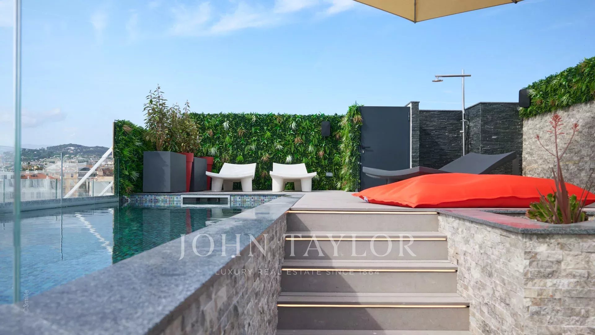 Přístup na střešní terasu je po schodišti z obývacího pokoje a poskytuje exkluzivní venkovní prostor, kde se můžete vyhřívat na slunci, relaxovat v bazénu a vychutnávat si jídlo připravené ve venkovní kuchyni.