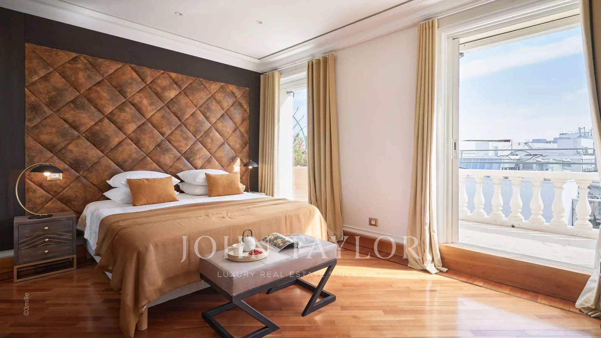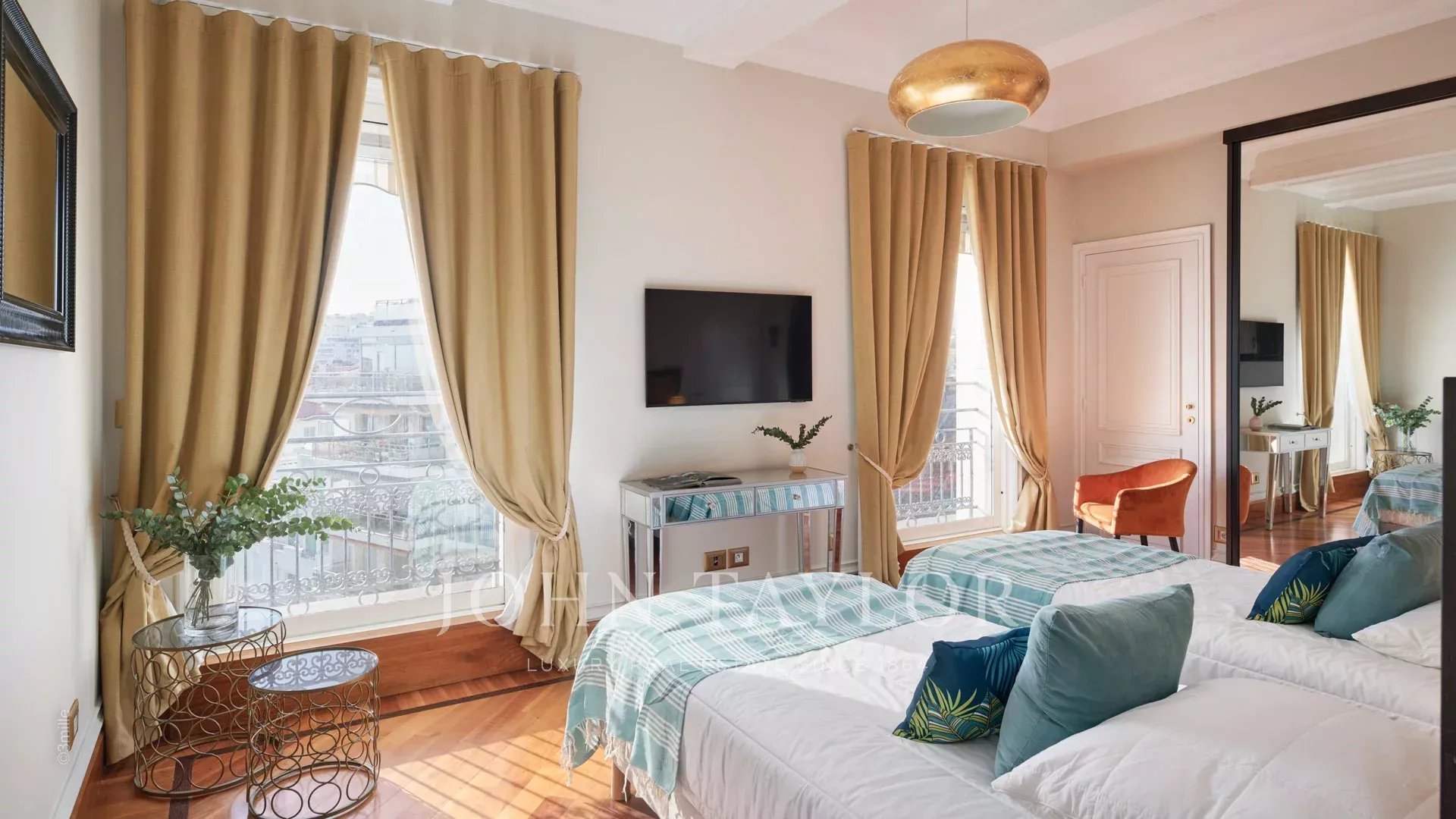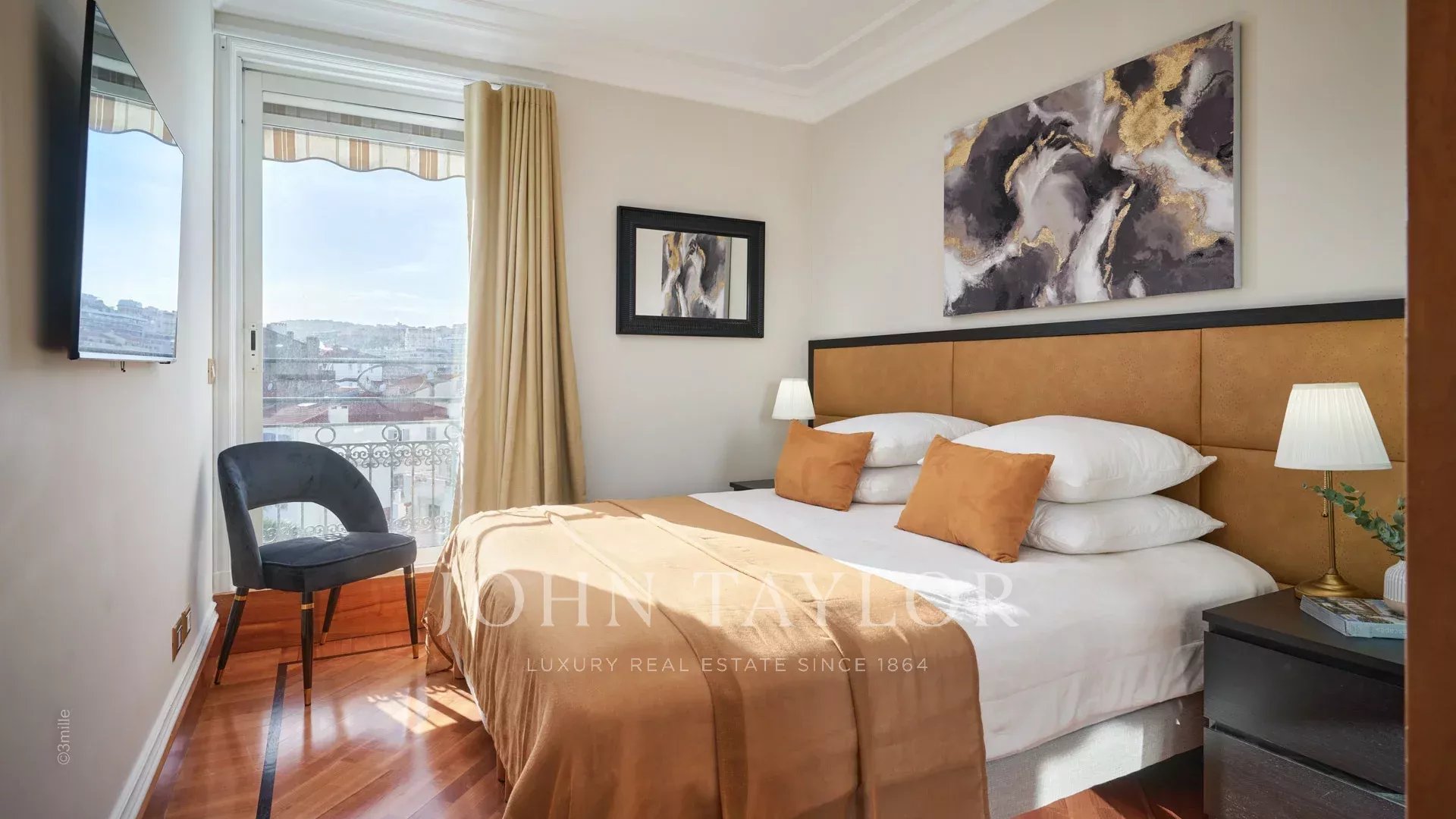 - Hlavní ložnice s manželskou postelí velikosti king size, která nabízí úchvatný výhled na Palais des Festivals, a vlastní sprchový kout s WC.